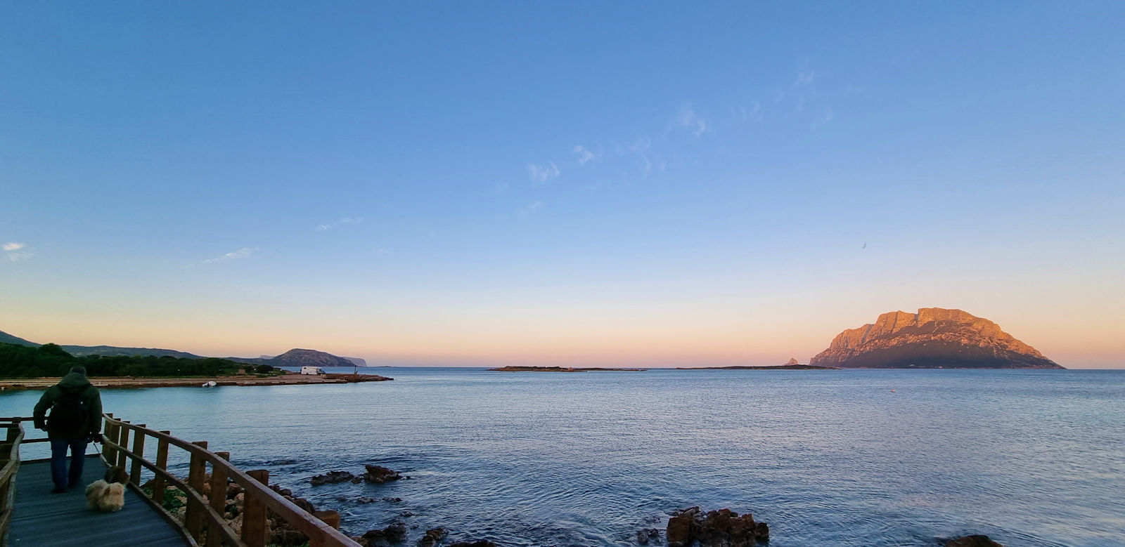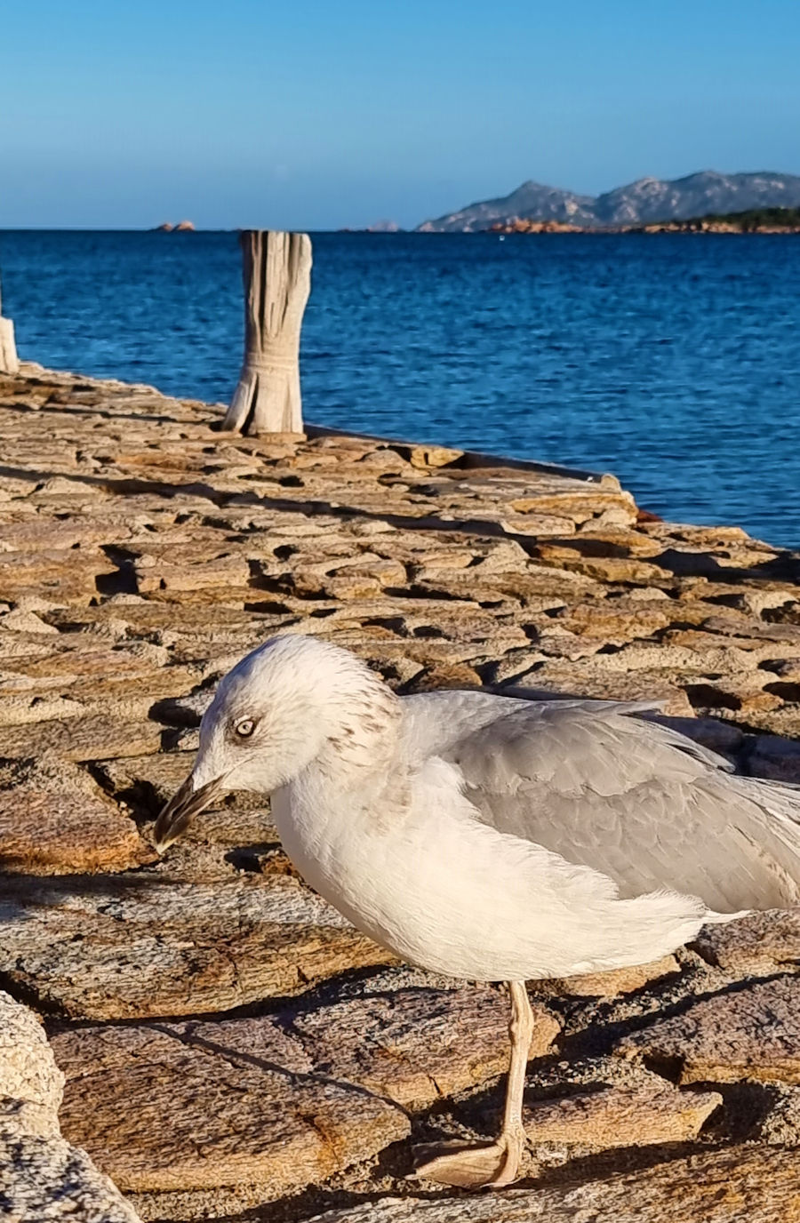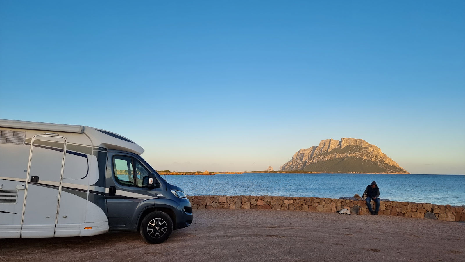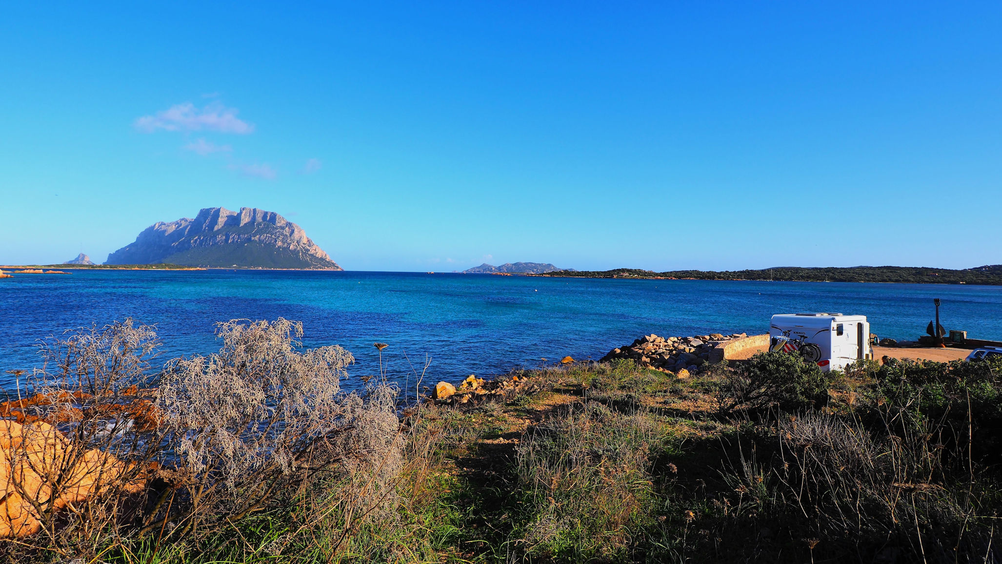 Während des Essens findet Ulli einen Parkplatz ganz in der Nähe am Wasser. In Porto San Paolo und wirklich nur für die absolute Nebensaison geeignet. Nur ein paar Minuten später parken wir hier an einem Traumplatz am Meer. Insgesamt begegnen uns heute noch 2 Autos und 8 Menschen und dann herrscht Ruhe direkt hier vor der magischen Tavolara Insel. Und eine Möwe, die sich von Ulli von Hand füttern lässt, kommt auch vorbei.