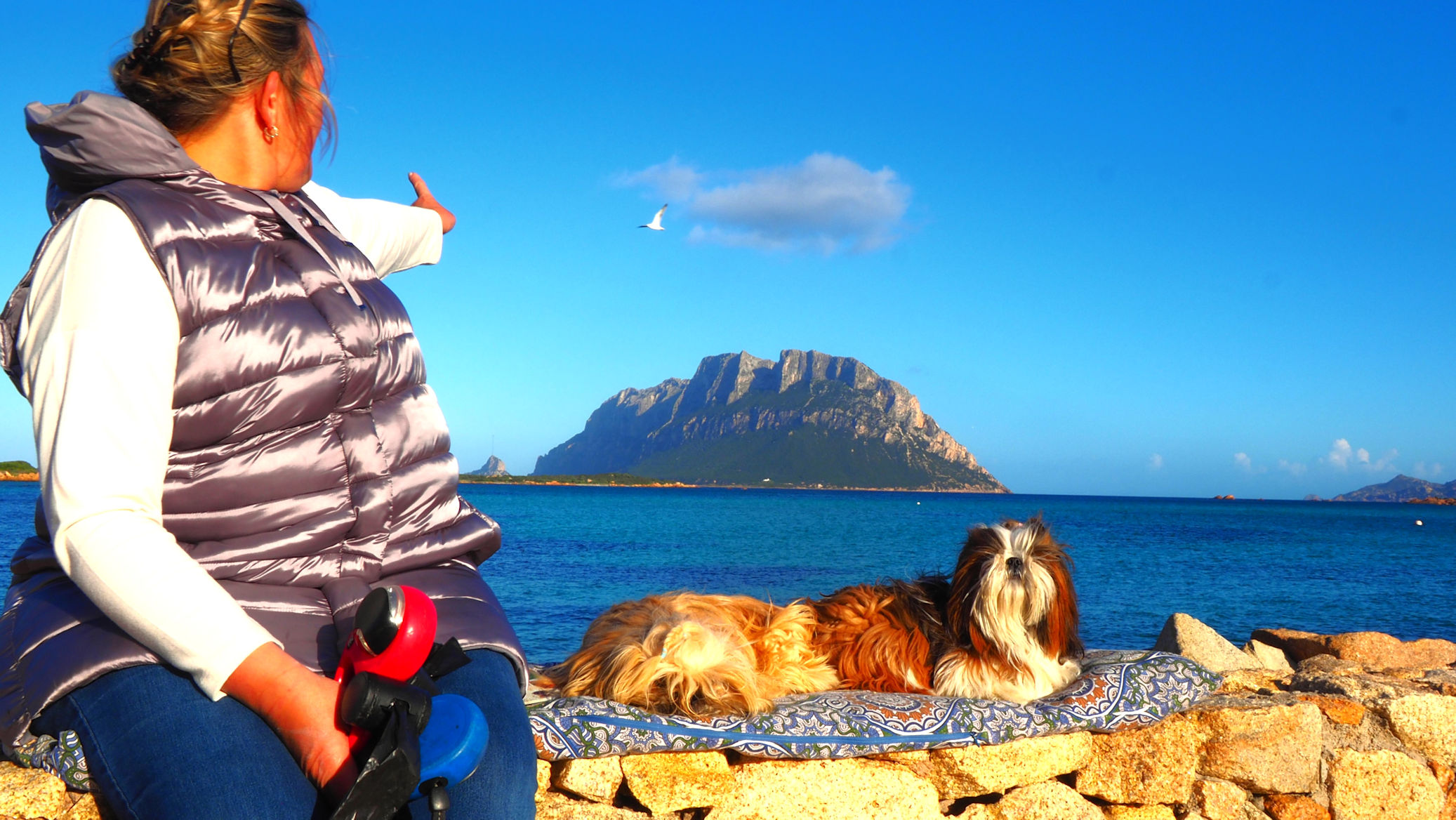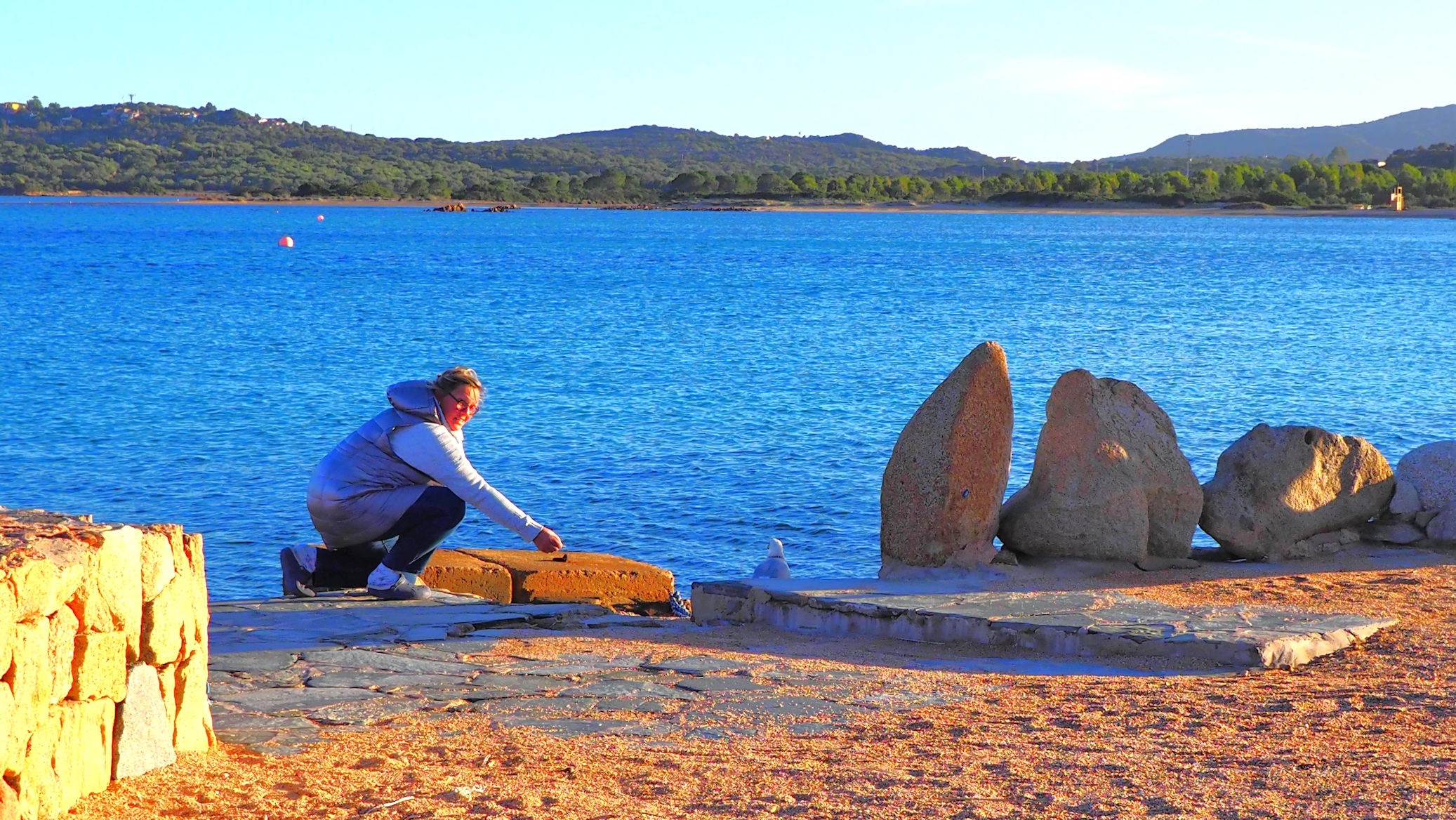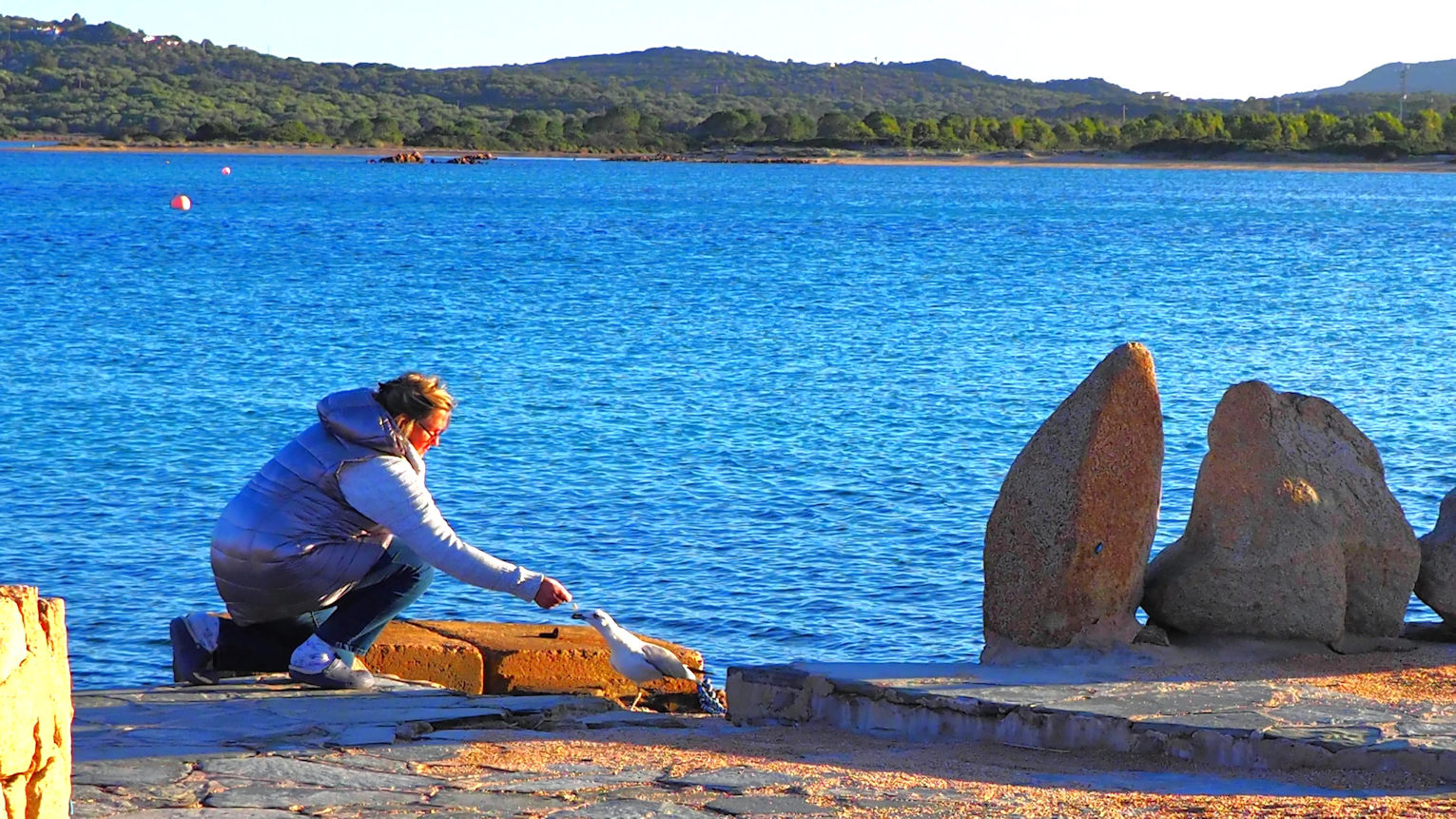 Während des Essens findet Ulli einen Parkplatz ganz in der Nähe am Wasser. In Porto San Paolo und wirklich nur für die absolute Nebensaison geeignet. Nur ein paar Minuten später parken wir hier an einem Traumplatz am Meer. Insgesamt begegnen uns heute noch 2 Autos und 8 Menschen und dann herrscht Ruhe direkt hier vor der magischen Tavolara Insel. Und eine Möwe, die sich von Ulli von Hand füttern lässt, kommt auch vorbei.