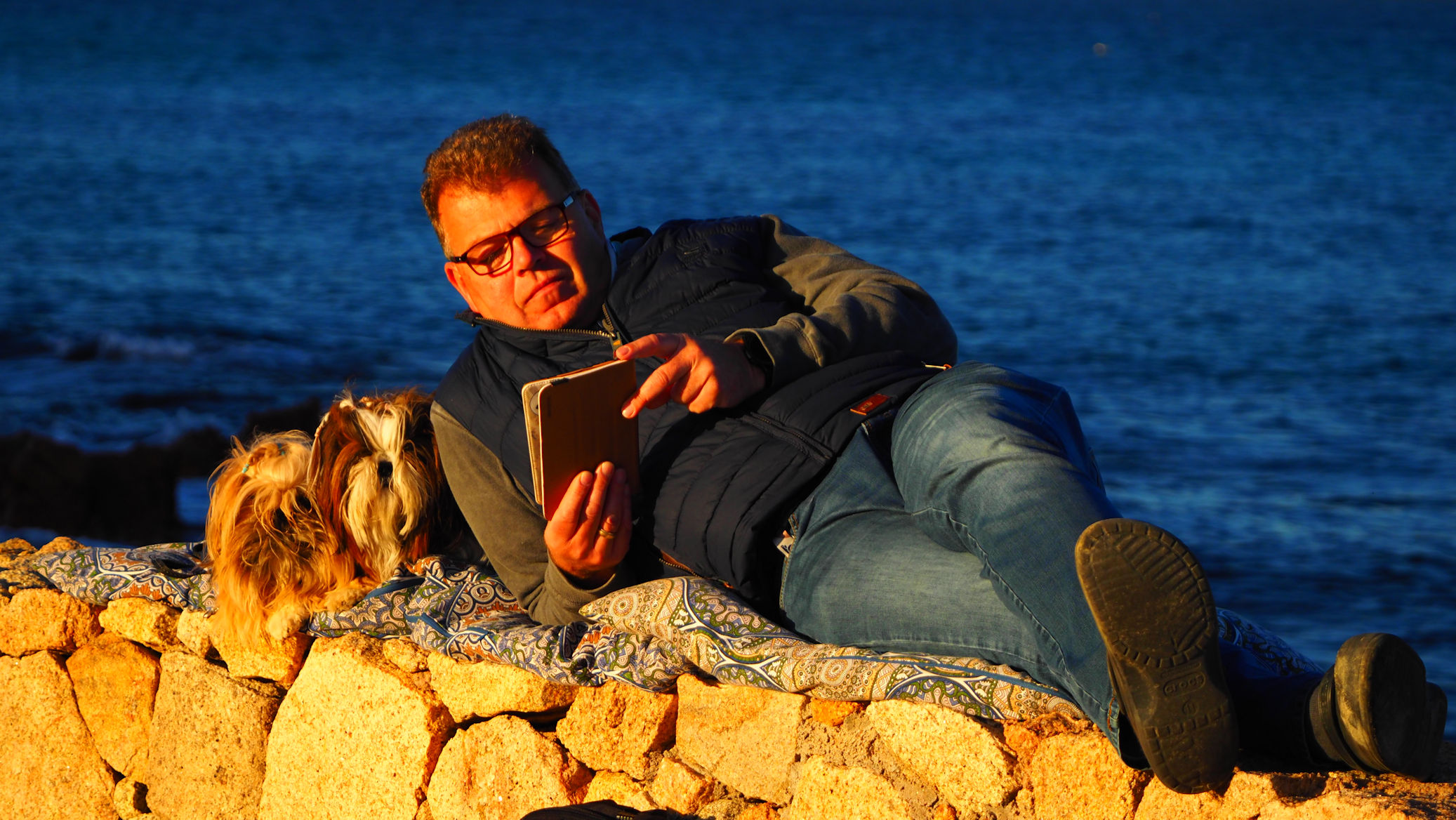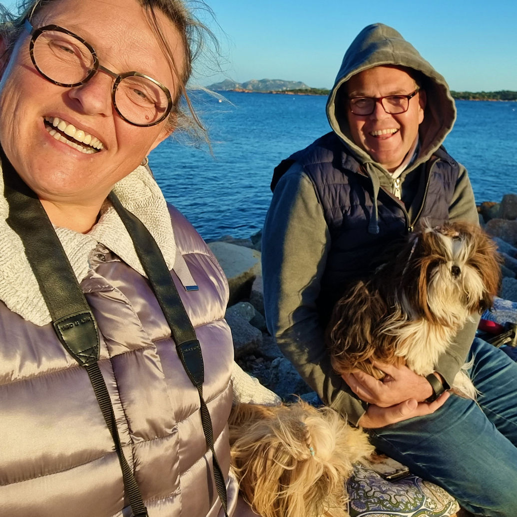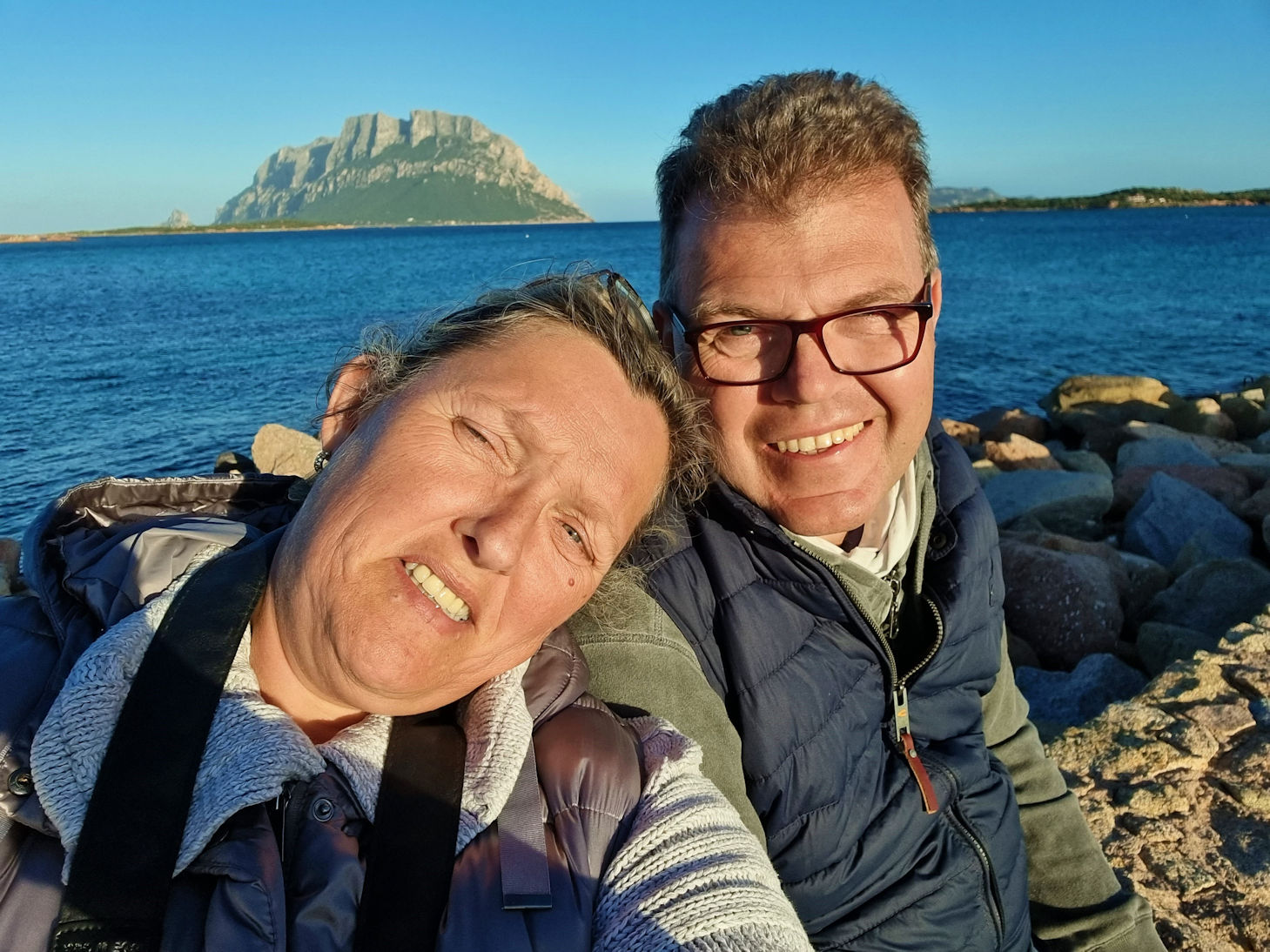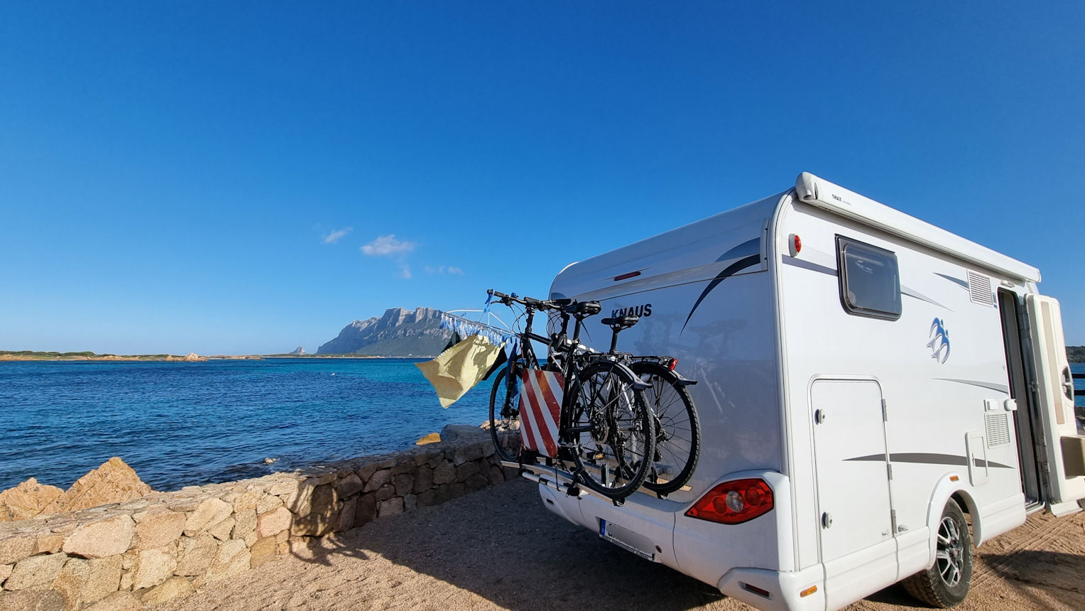 Während des Essens findet Ulli einen Parkplatz ganz in der Nähe am Wasser. In Porto San Paolo und wirklich nur für die absolute Nebensaison geeignet. Nur ein paar Minuten später parken wir hier an einem Traumplatz am Meer. Insgesamt begegnen uns heute noch 2 Autos und 8 Menschen und dann herrscht Ruhe direkt hier vor der magischen Tavolara Insel. Und eine Möwe, die sich von Ulli von Hand füttern lässt, kommt auch vorbei.