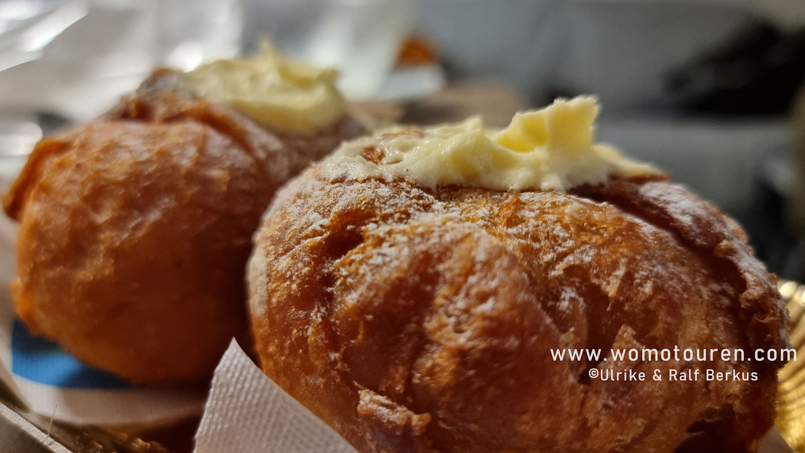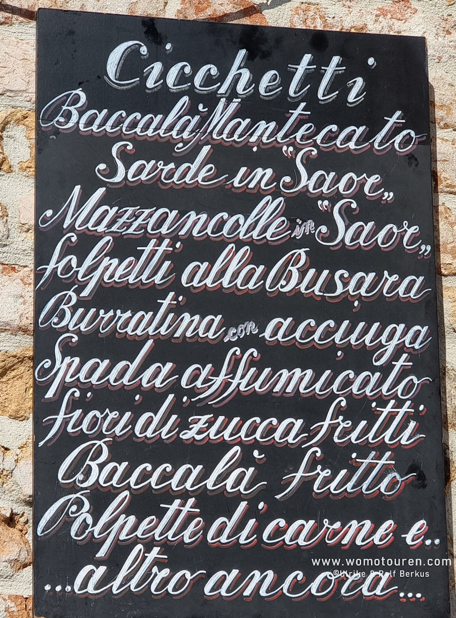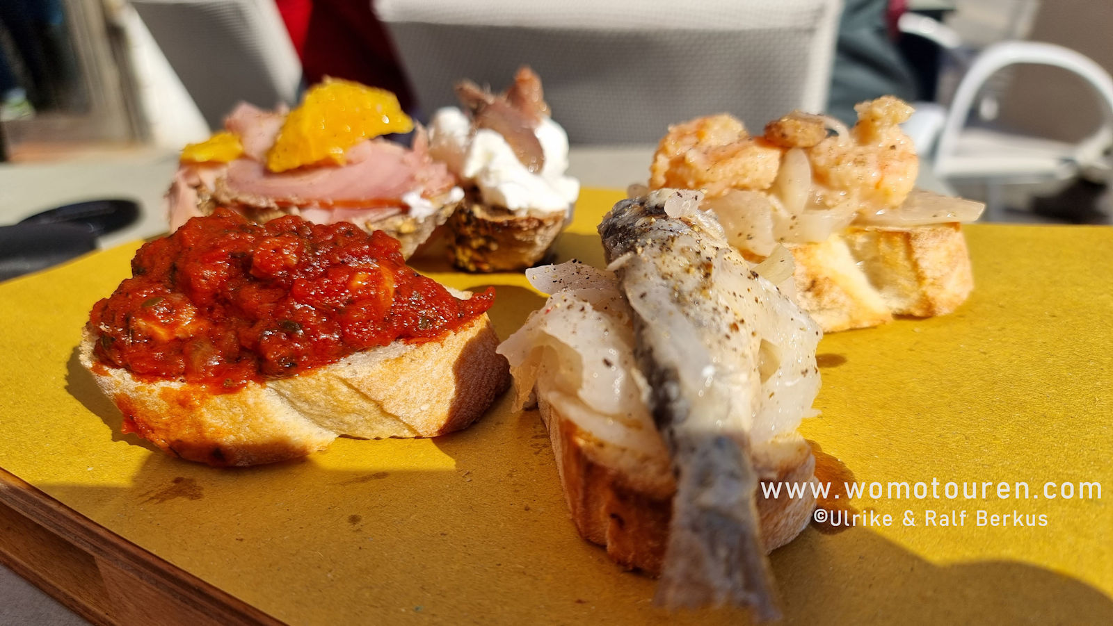 Cicchetti heißen die kleinen lecker, meist mit Fischspezialitäten belegten Brote, die man in den typischen venezianischen Weinstuben, den Bacari zu einem Glas leckerem Wein oder Prosecco genießen kann.