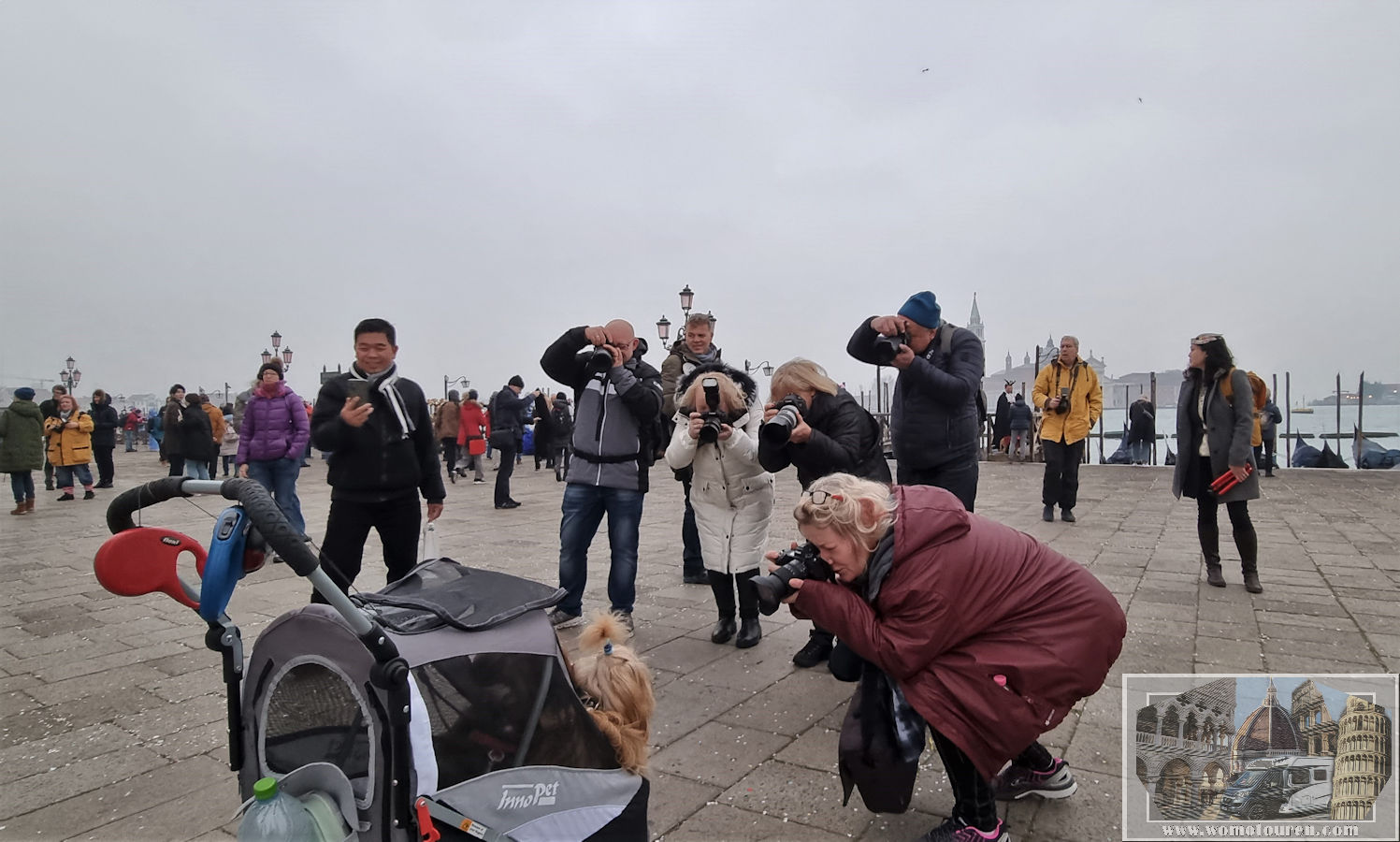 Heute sind wir um kurz nach 6 am Vaporettoanleger. Aber das um 6:12 Uhr kommt leider nicht. So erre9ichen wor den Dogenpalast und den davor liegenden Platz zwar noch, als die Straßenlaternen brennen. Aber schon kurze Zeit später werden die Lichter ausgeschaltet, worauf ein lautes Raunen der Fotografen folgt.