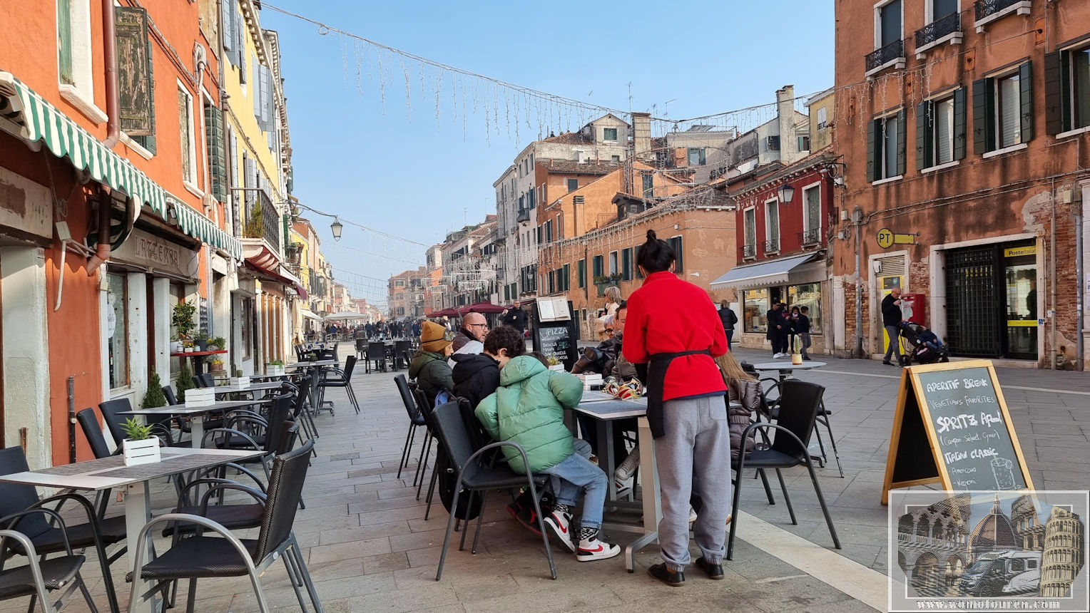 Um 11 Uhr genießen wir in der kleinen Bar auf der Piazza einen Prosecco, während wir den vielen Masken und Besuchern zusehen.