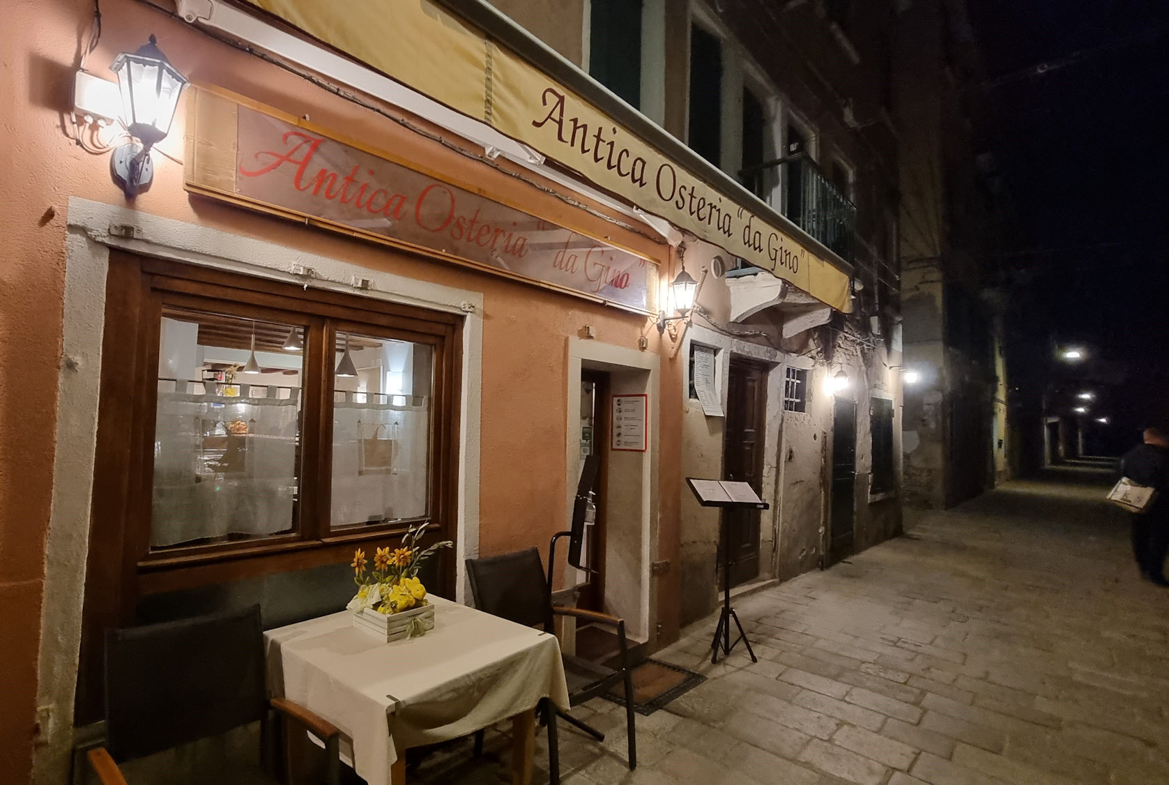 Unser Weg geht weiter entlang der Via Garibaldi, denn ein leckeres Abendessen wäre nicht so schlecht. Ulli hat im Netz einen weiteren Tipp für den Stadtteil Castello gefunden, nämlich die „Antica Osteria da Gino“ und jetzt kommt unser heutiges, charmantes Kacktütenerlebnis. Auf dem Weg zur Osteria erledigt unser Rüde sein Geschäftchen, das wir ordnungsgemäß in einer Tüte aufsammeln. Und dann befindet sich auf dem gesamten Weg bis zur Osteria kein einziger Papierkorb mehr, um dieses Prachtstück zu entsorgen. Als wir in der fortgeschrittenen, blauen Stunde das kleine Lokal erreichen, erscheint direkt einer der Kellner vor der Tür und wünscht uns einen guten Abend. Aber jetzt reingehen mit unserem Mitbringsel, das funktioniert leider nicht. Irgendwohin wegwerfen kommt auch nicht in Frage. Da bleibt nur der angewandte italienische Konjunktiv in einer Frage an den Kellner, der diese mit einem breiten Grinsen und „Folgen Sie mir bitte!“ beantwortet. Um die Ecke herum findet sich ein Platz für die Kacktüte 9in deren abgeschlossenen Mülleimer und schon sitzen wir in einem wundervollen, typisch venizianischem Lokal.