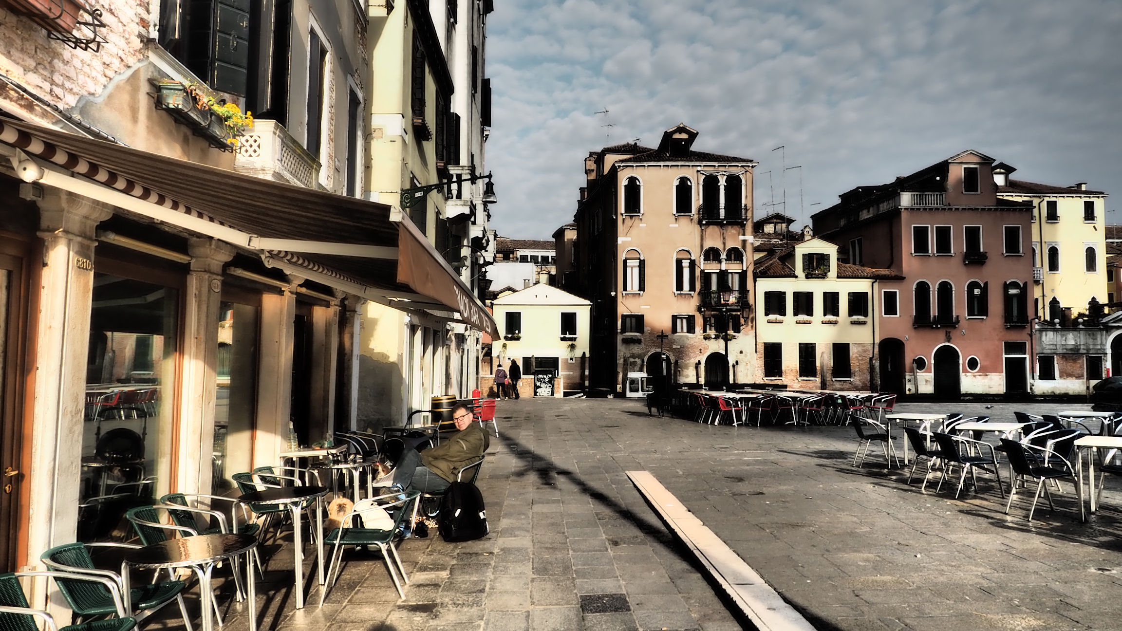 Es gibt butterzarten Oktopus und anschließend das Traditionsgericht: Venezianische Leber. Das Essen ist lecker, das Ambiente stimmt auch. Das einzig störende ist einer der Gäste am Nachbartisch, der als einziger die ganze Zeit spricht und das ohne Luft zu holen.