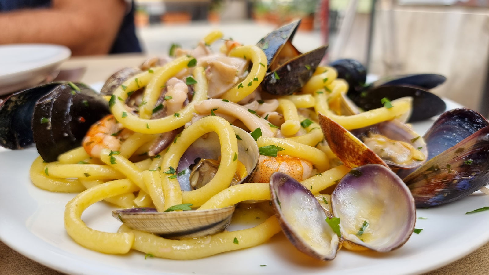 Heute Mittag gibt es eine Antipasto, nämlich Pici ai Frutti di Mare für zwei und dann für jeden ein Fritto Misto mit Insalata Mista. Dazu ein Glas Weißwein. Unser Platz ist ruhig, das Essen ist sehr lecker. Dem ein oder anderen von Euch würde es bestimmt etwas zu lange dauern, bis die Speisen fertig sind. Aber es ist alles wunderbar frisch zubereitet und das Fritto Misto knuspert bis zum letzten Stückchen.