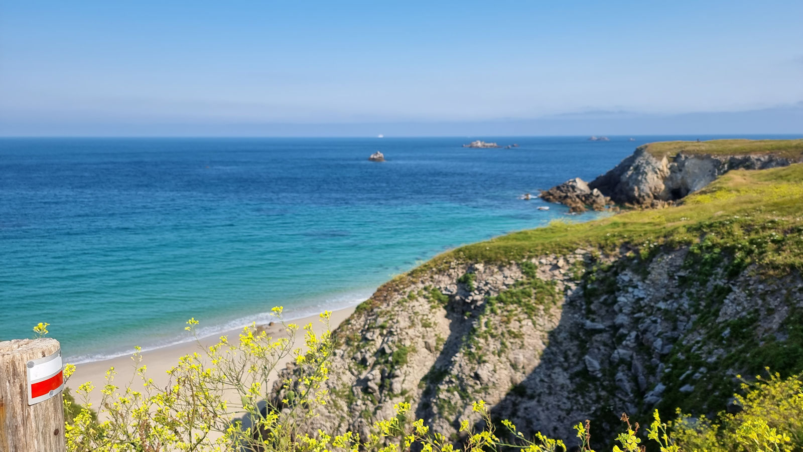Montreal lassen wir übrigens rechts des Weges liegen 🙂 Der Pfad ist kurzweilig, bis auf den letzten Kilometer. Auf diesem hat man dauernd diesen Traumstrand von Kerhornou vor Augen, scheint ihm aber irgendwie nicht näher zu kommen.