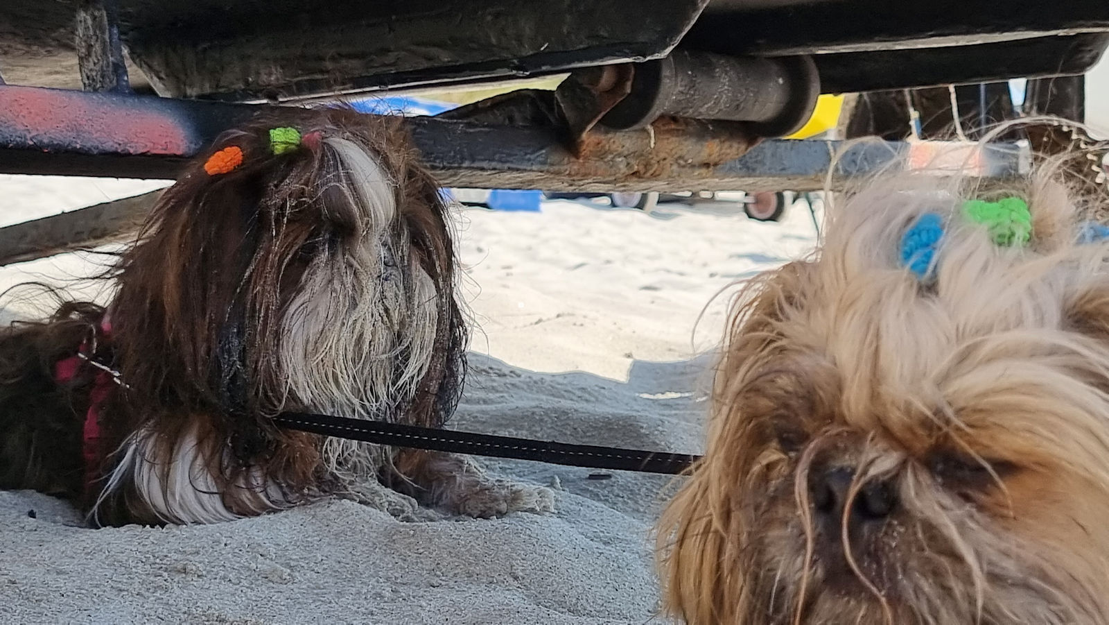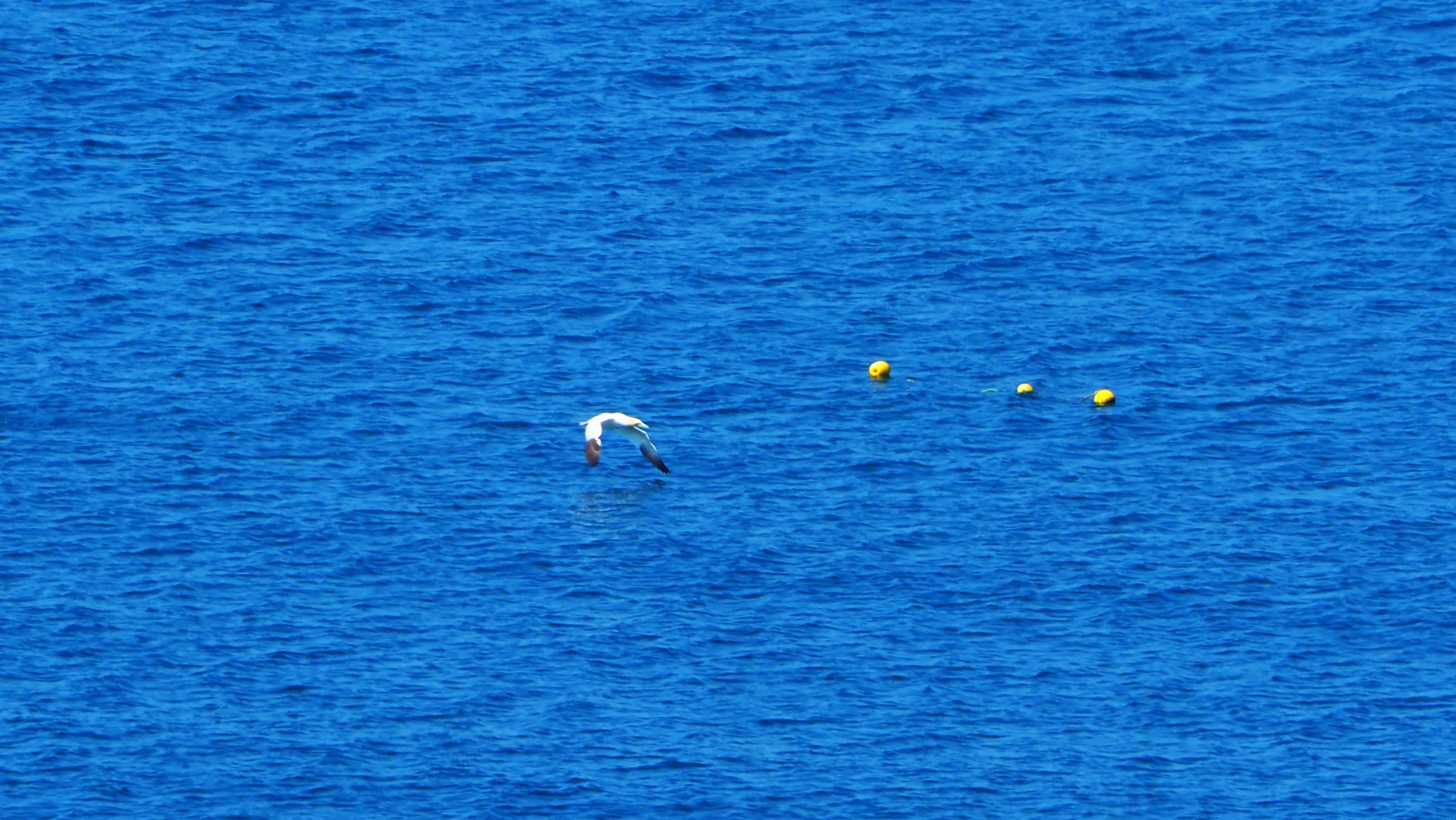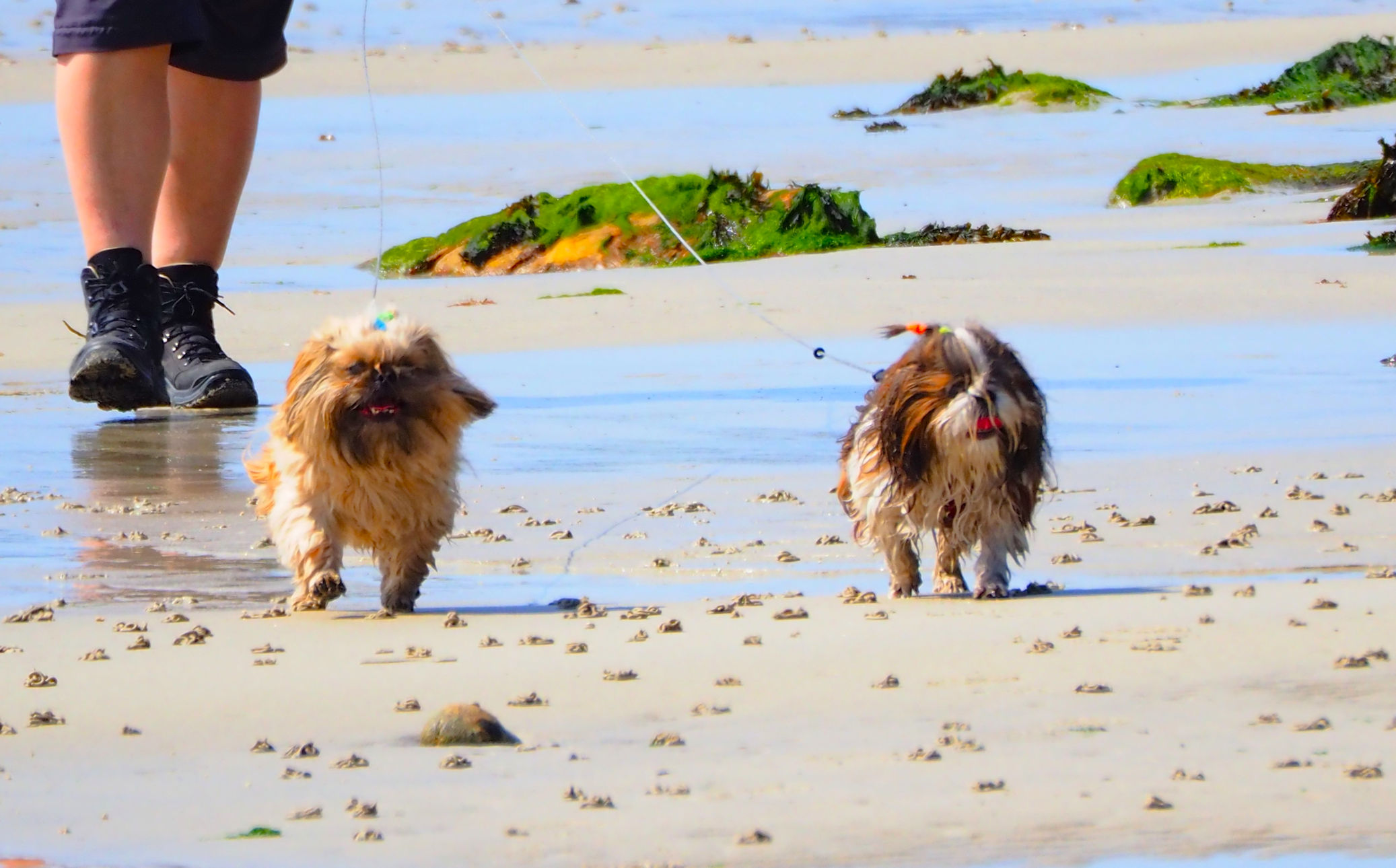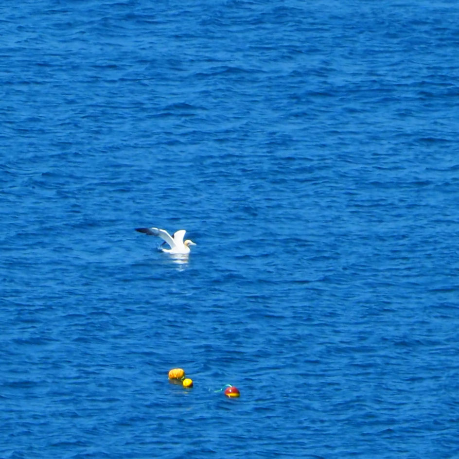 Aber dann ist es geschafft. Die Fellnasen nehmen ein kühlendes Bad im noch weit draußen befindenden Meer und genießen die Sandwühlerei im Anschluss. Wir genießen einfach nur die Szenerie und die Aussicht. Auf dem gleichen traumhaften Pfad geht es zurück. An der 2. Bank legen wir unsere Mittagspause ein, die uns ein Basstölpel mit seinen Flugvorführungen recht weit draußen verschönt. Die Fellnasen genießen hier außerdem ihr Mittagessen und wir natürlich auch.