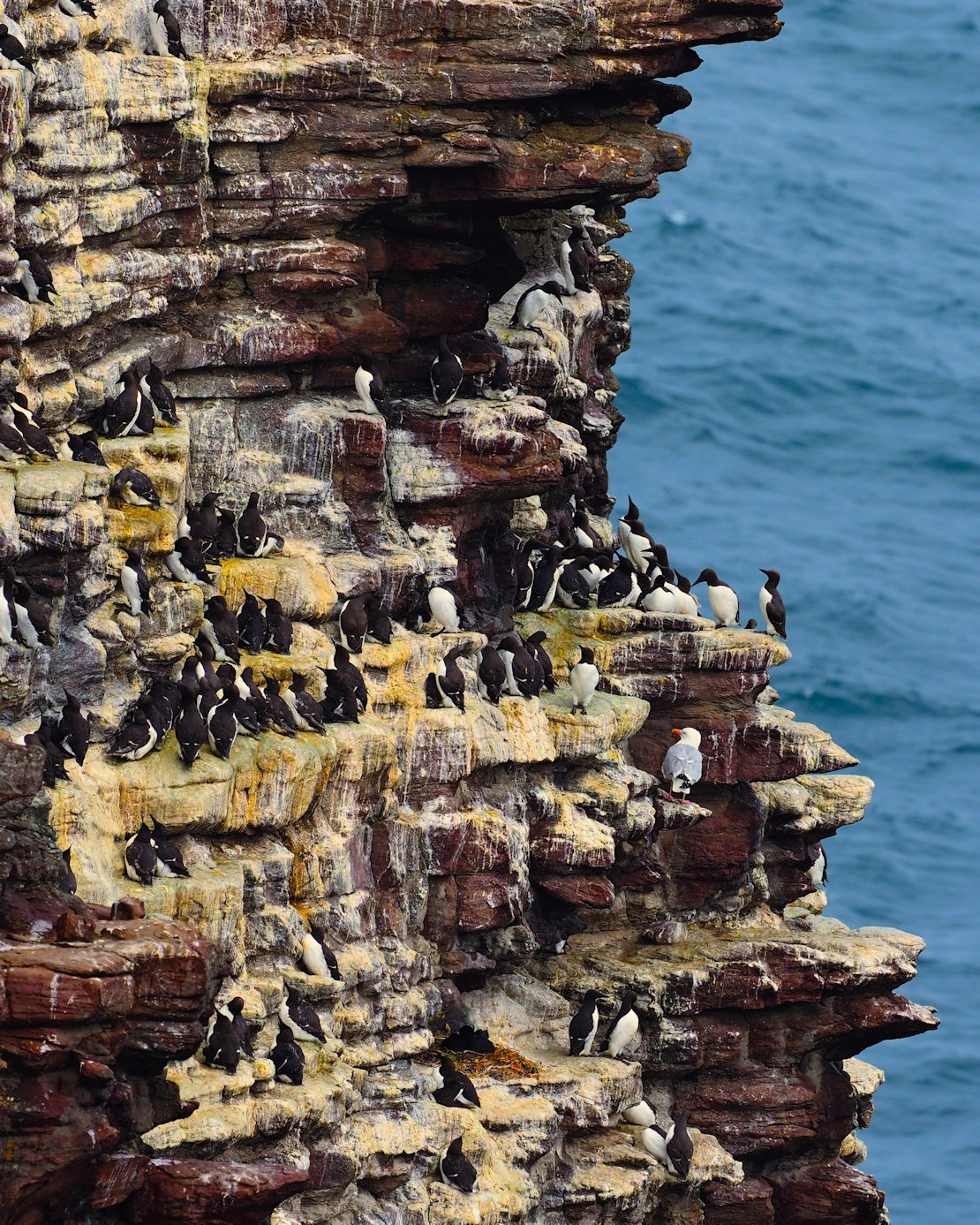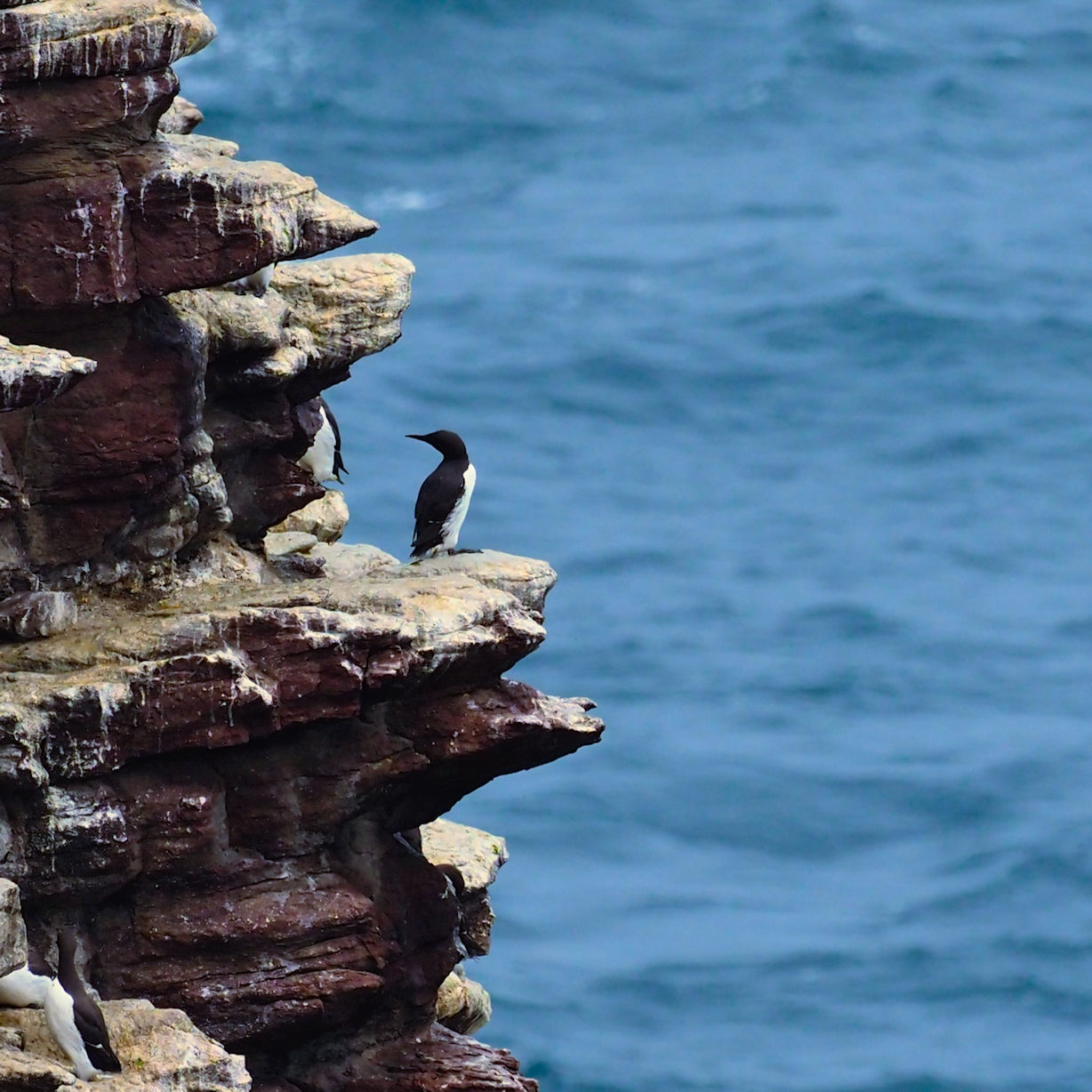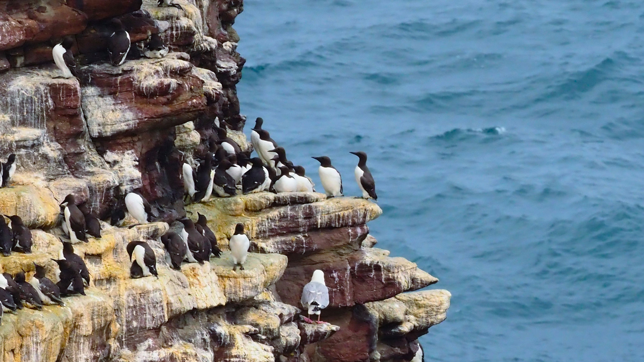 Man kann Ansammlungen von Seevögeln tatsächlich riechen bevor man sie hört oder sieht. Und es riecht und der Felsen mit einer kleinen Kolonie Trottellummen, ein paar Tordalken, Möwen und Kormoranen ist zu sehen. Ab und an meint man einen Papageientaucher aufs Meer huschen zu sehen. Aber wer weiß schon, ob es tatsächlich einer war. Wir genießen auf jeden Fall die sehr begrenzte Zeit an diesem schönen Ort, an dem dann tatsächlich auch mal die Sonne herauskommt. Behördlich pünktlich verlassen wir unseren Parkplatz.