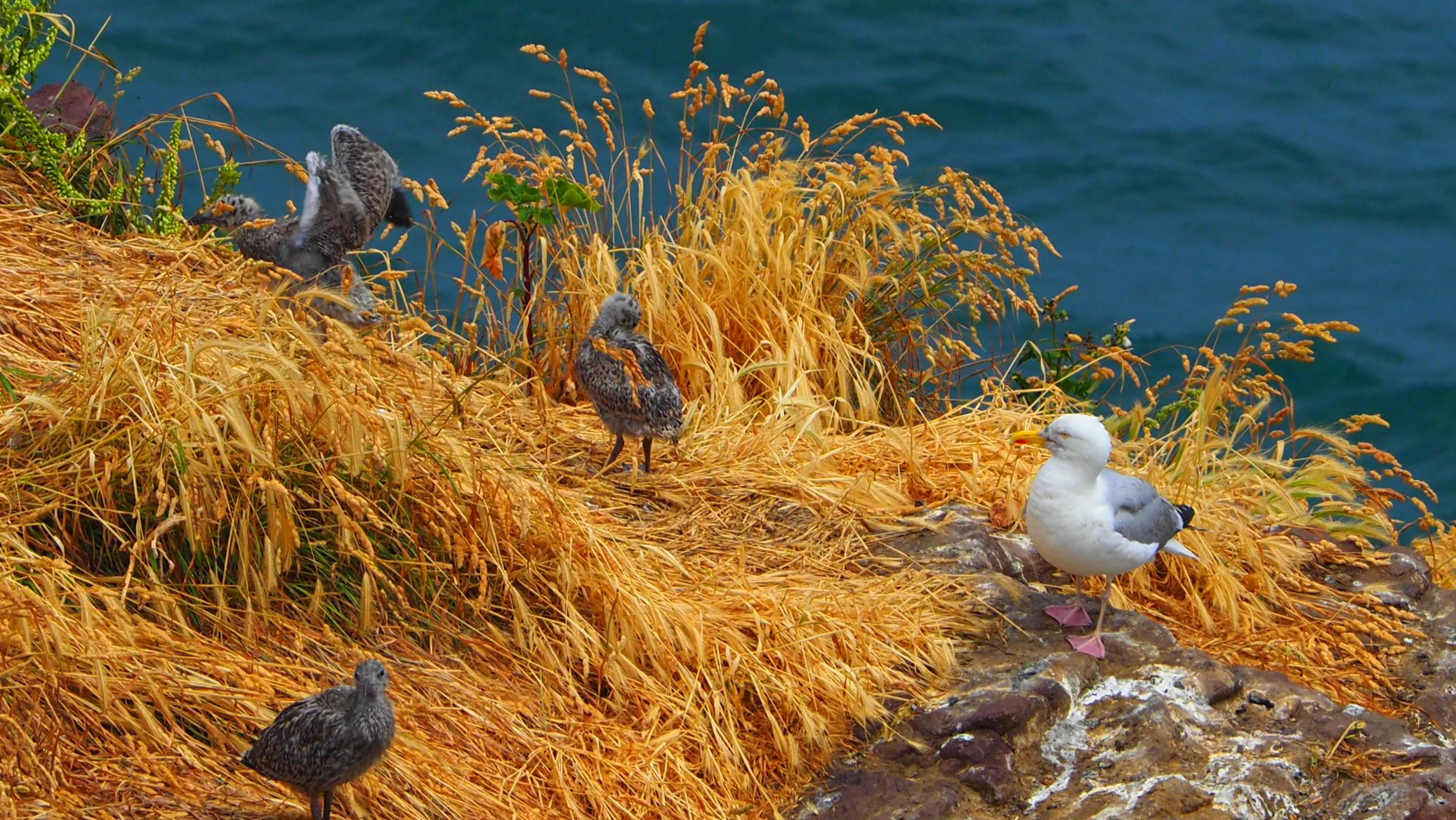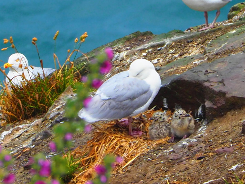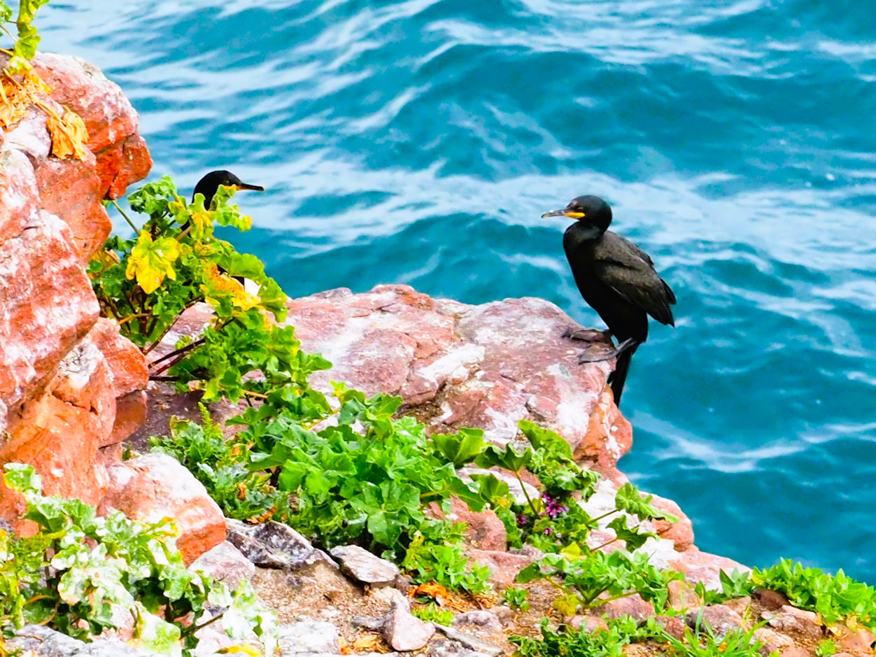 Man kann Ansammlungen von Seevögeln tatsächlich riechen bevor man sie hört oder sieht. Und es riecht und der Felsen mit einer kleinen Kolonie Trottellummen, ein paar Tordalken, Möwen und Kormoranen ist zu sehen. Ab und an meint man einen Papageientaucher aufs Meer huschen zu sehen. Aber wer weiß schon, ob es tatsächlich einer war. Wir genießen auf jeden Fall die sehr begrenzte Zeit an diesem schönen Ort, an dem dann tatsächlich auch mal die Sonne herauskommt. Behördlich pünktlich verlassen wir unseren Parkplatz.