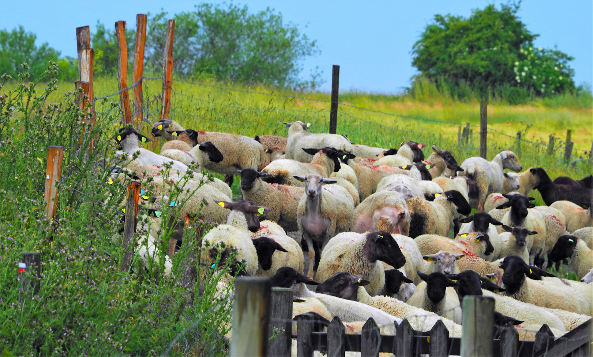 Ralf ist schon unterwegs zum Fotografieren, als sich die dunkle Wolke, die uns offenbar gefolgt ist, beginnt so richtig zu entleeren. Er kommt frisch geduscht zurück und kurz nachdem er die Womotür hinter sich geschlossen hat, geht das Gewitter los. Blitz und Donner, hell und laut und es regnet so stark, dass ein Viertel des Parkplatzes nach dem Unwetter unter Wasser steht. Die Schafe, die bei unserer Ankunft überall auf den Salzwiesen verteilt waren, stehen nun wie ausgestopft, eng an eng in Formation.