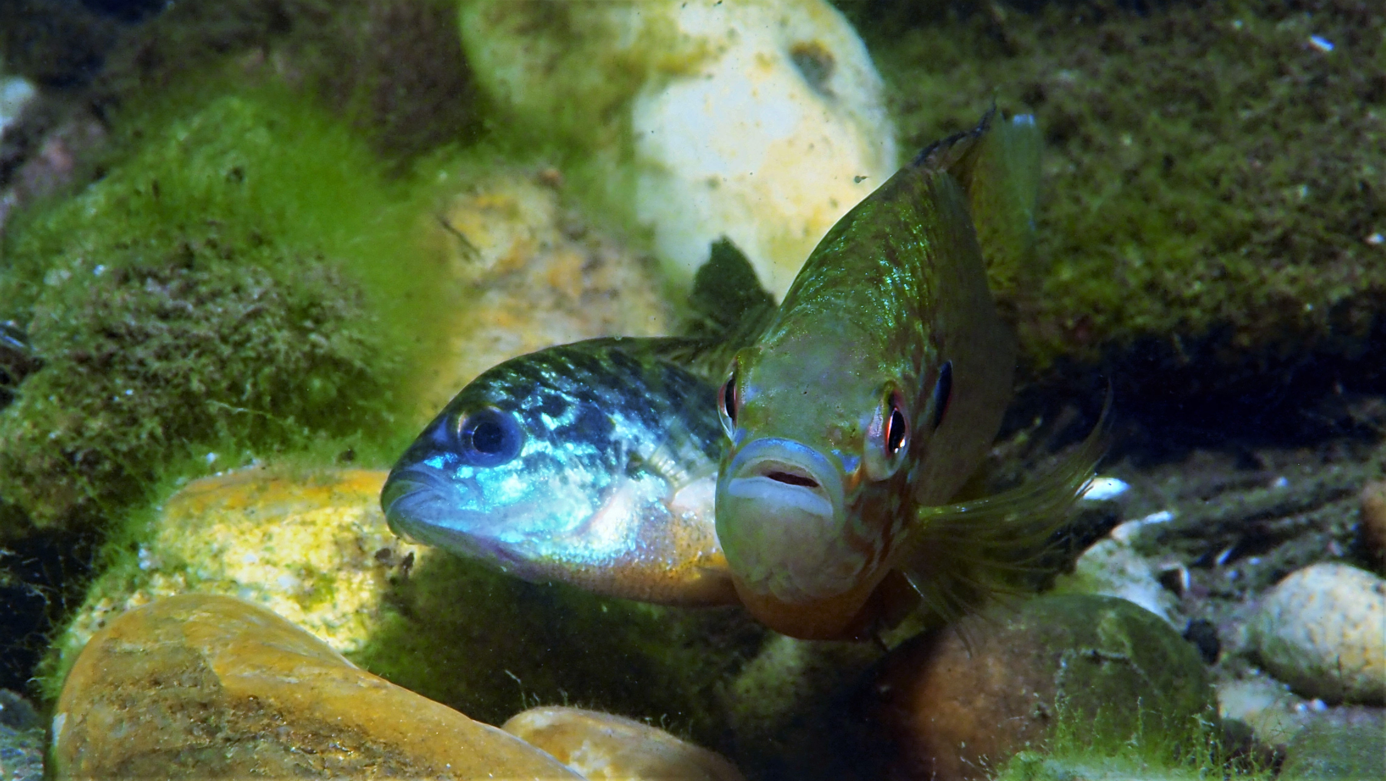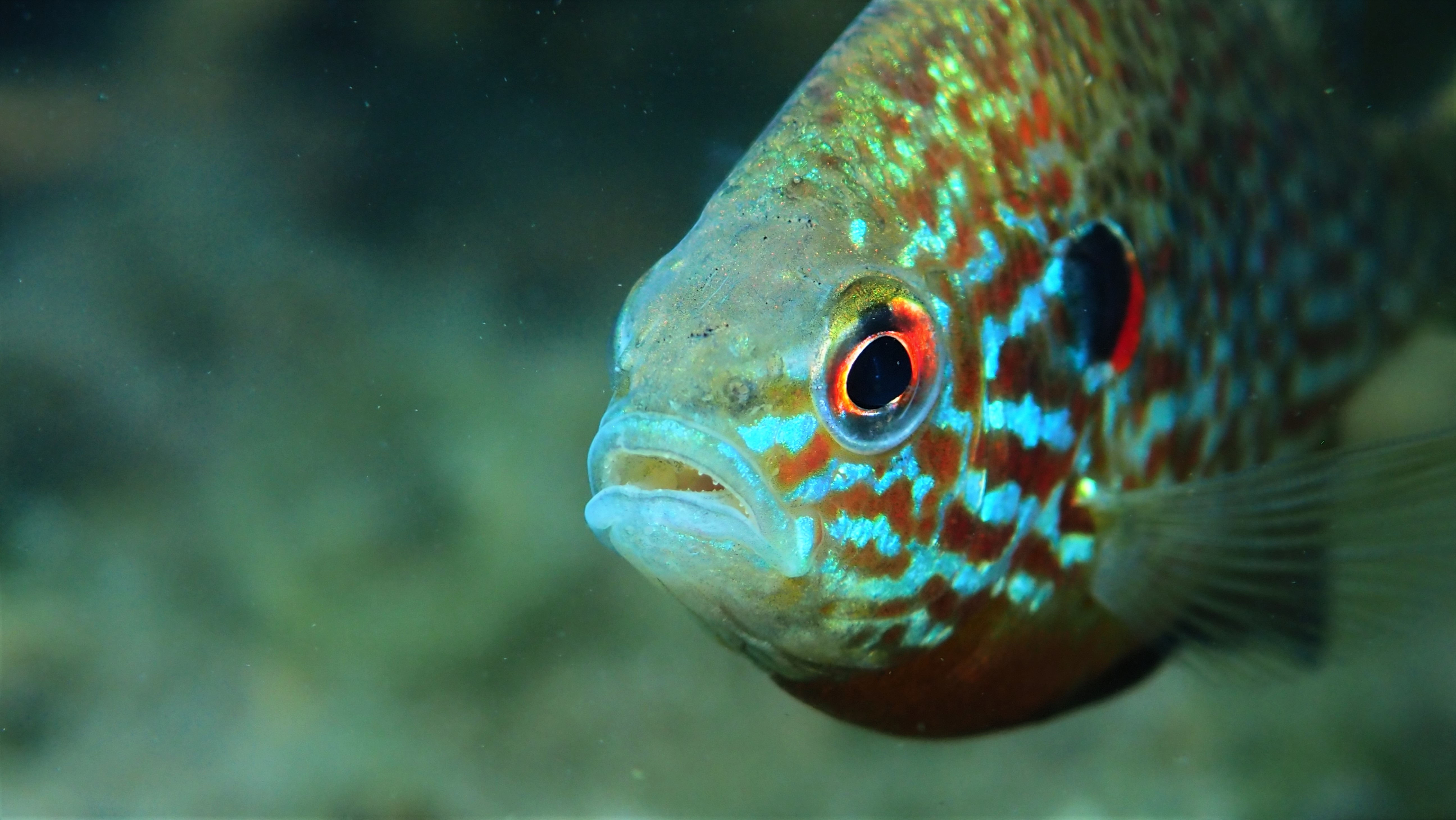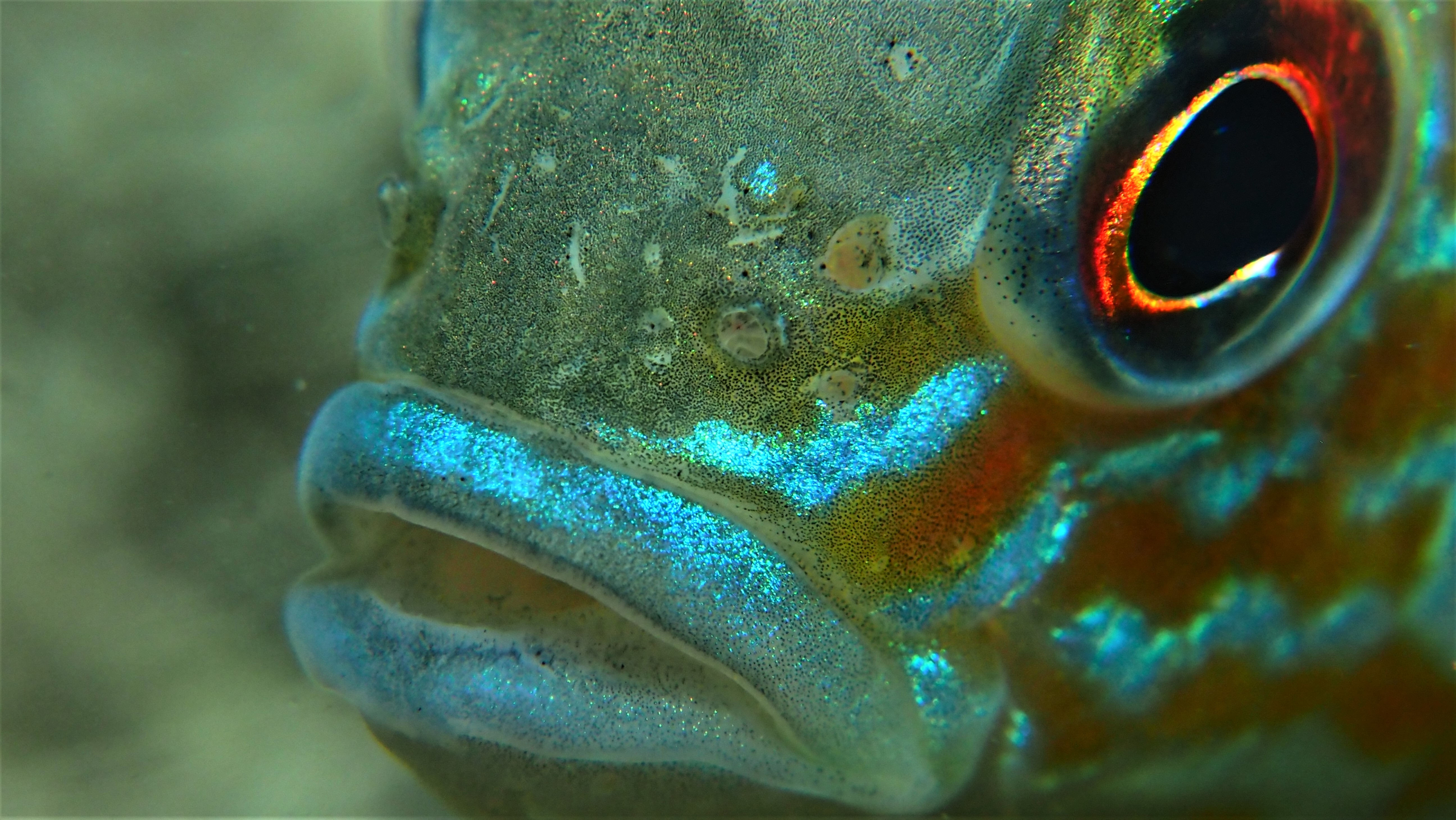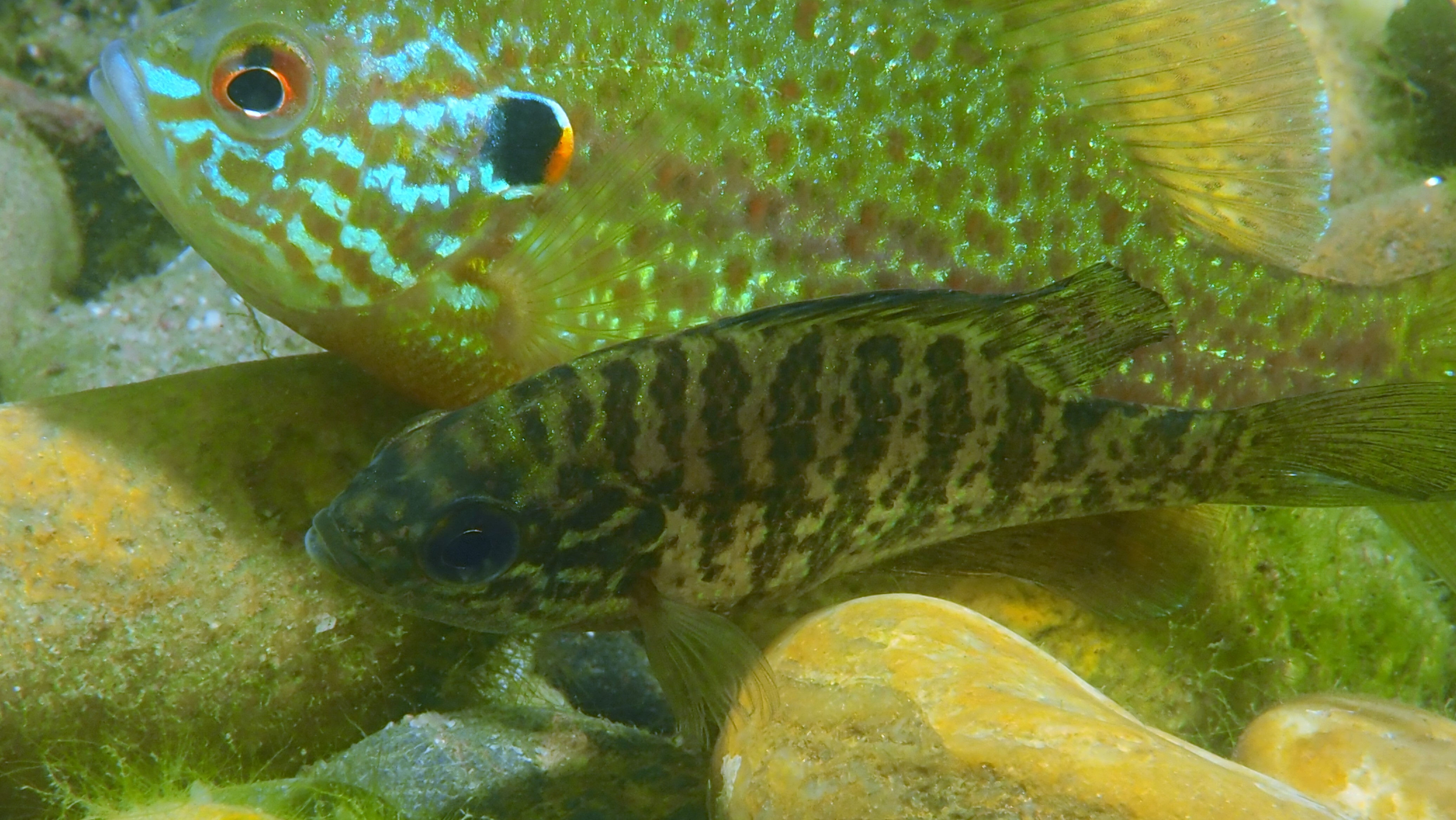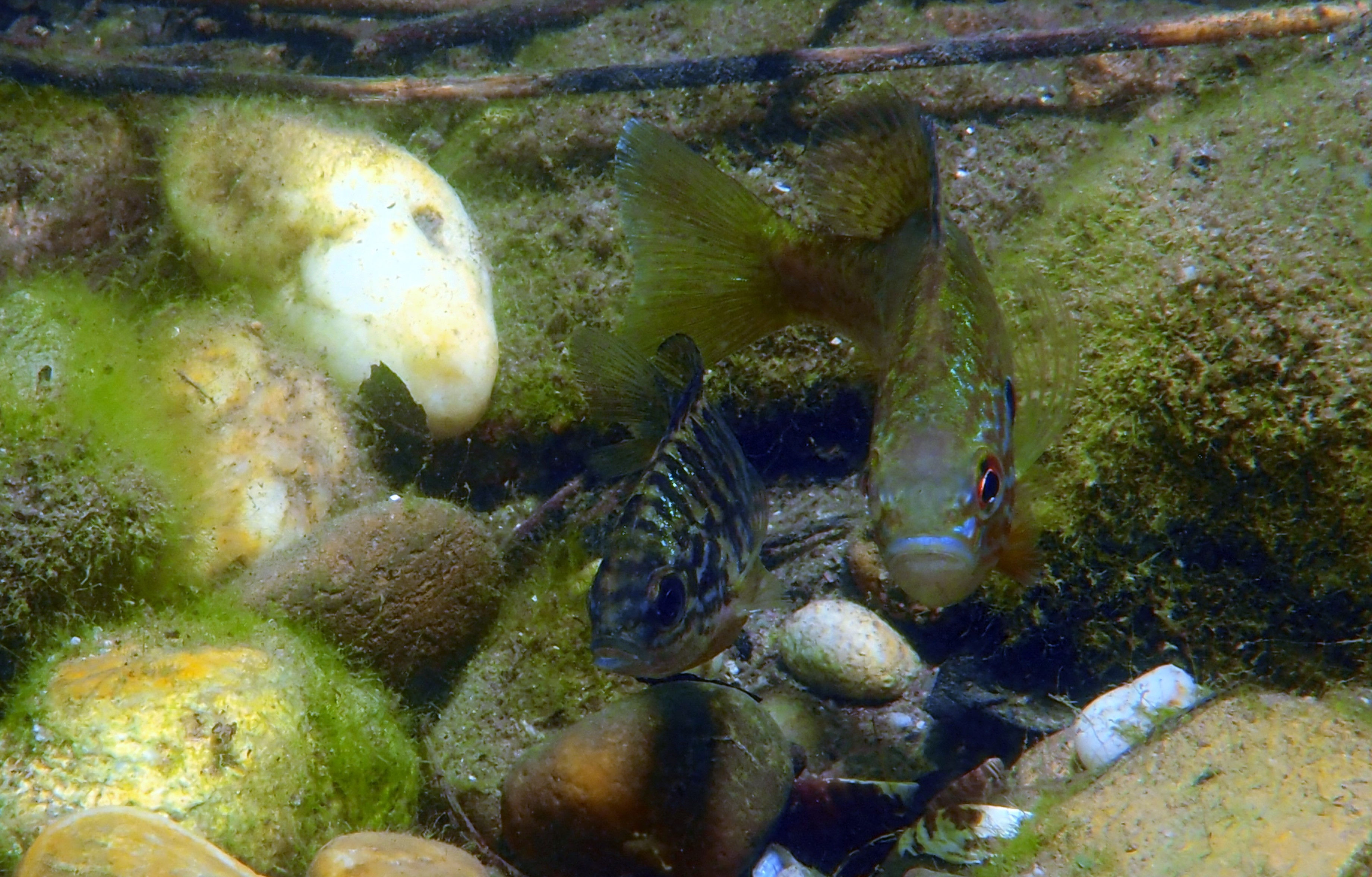 Am Wochenende besuchen wir jedenfalls einige der Nester, die jetzt bei der Brutbewachung nur noch von einem Fisch „betreut“ werden. Und siehe da: wir finden noch glasig, weiße Eier, ebenso wie sandkorngroße schimmernde Augen in den Eiern sowie scheinbar bereits geschlümpfte, winzige Fischchen, bei denen bereits das dominante Auge als auch die für den Sonnenbarsch typischen Punkte zu erkennen sind. Diese Fotos entstehen mehr oder weniger im „Blindflug“, denn die Winzlinge sind erst durch die Vergrößerung sichtbar. Mit dem bloßen Auge ist diese Schönheit der Natur nur zu erahnen.