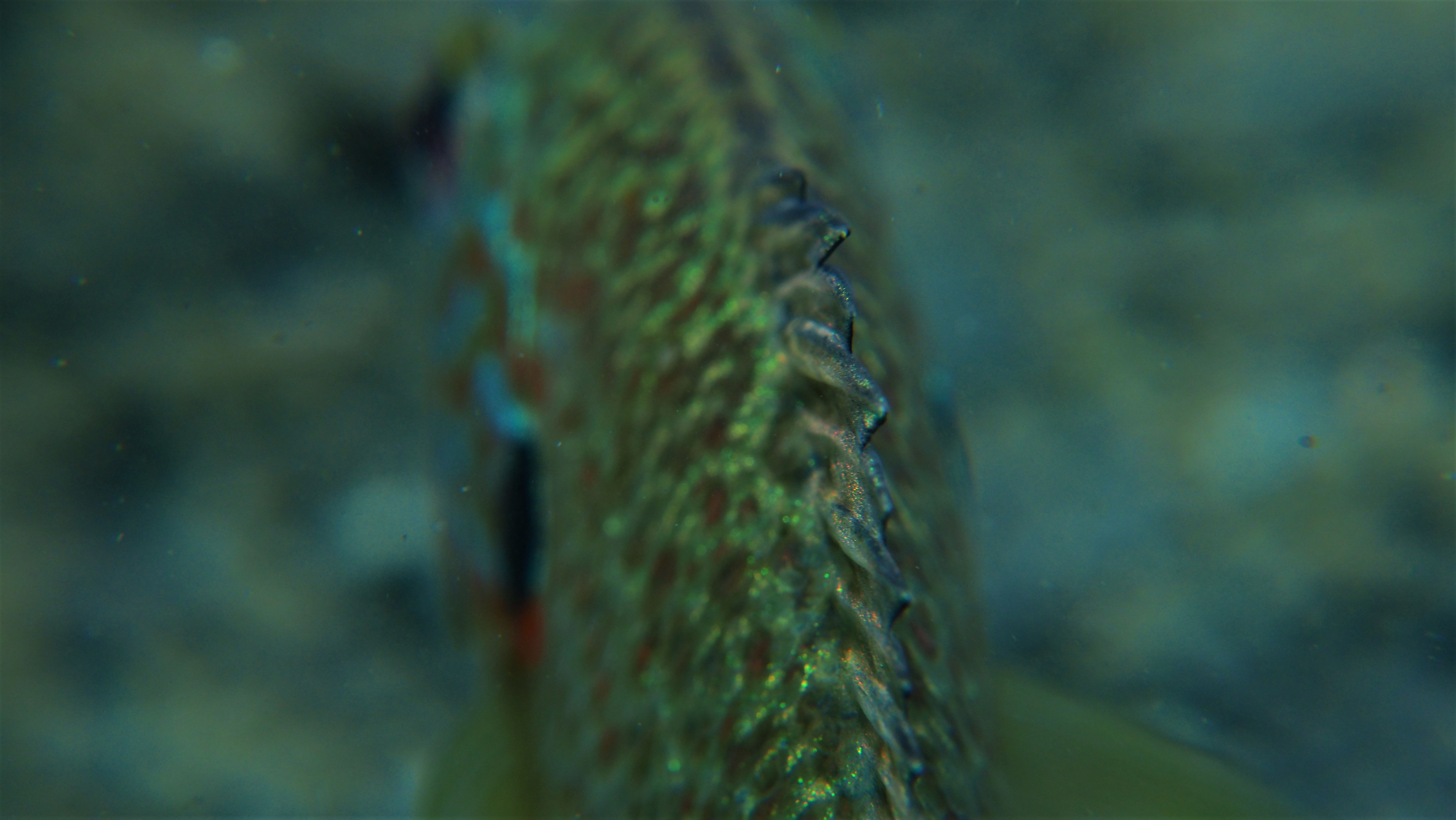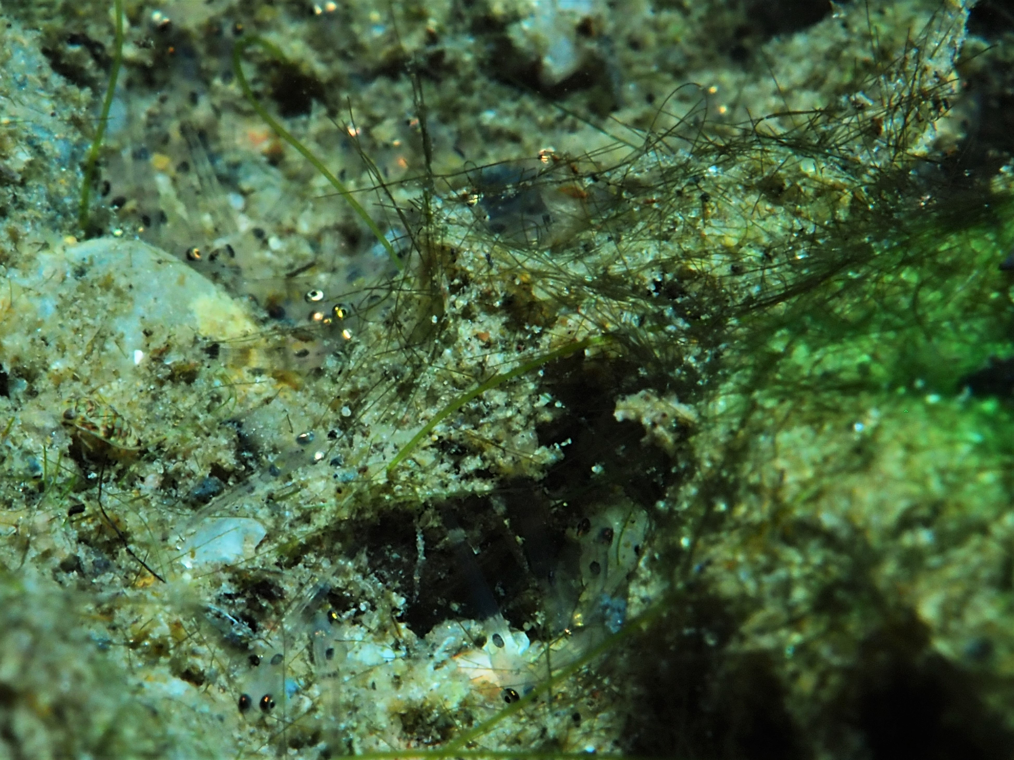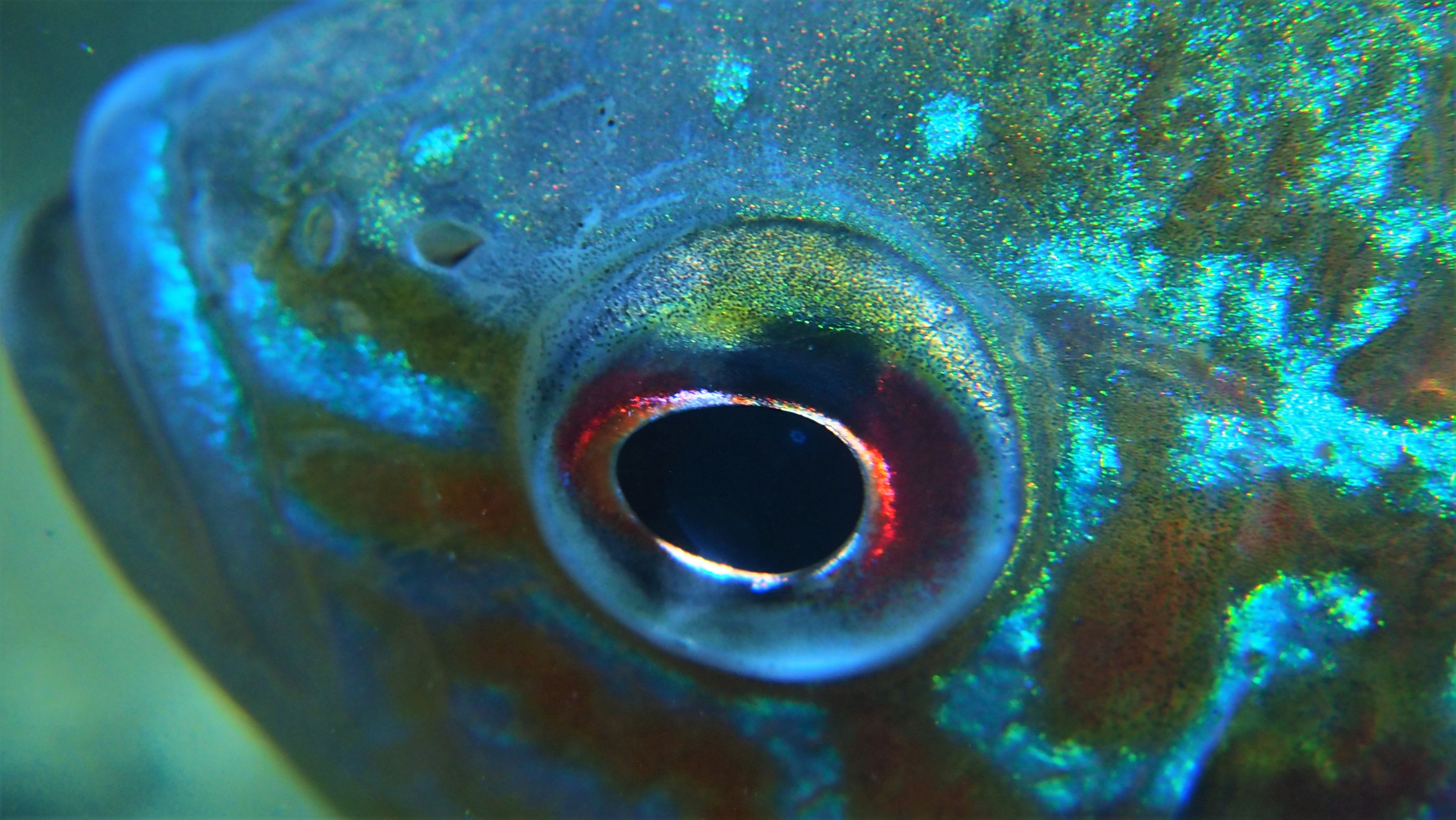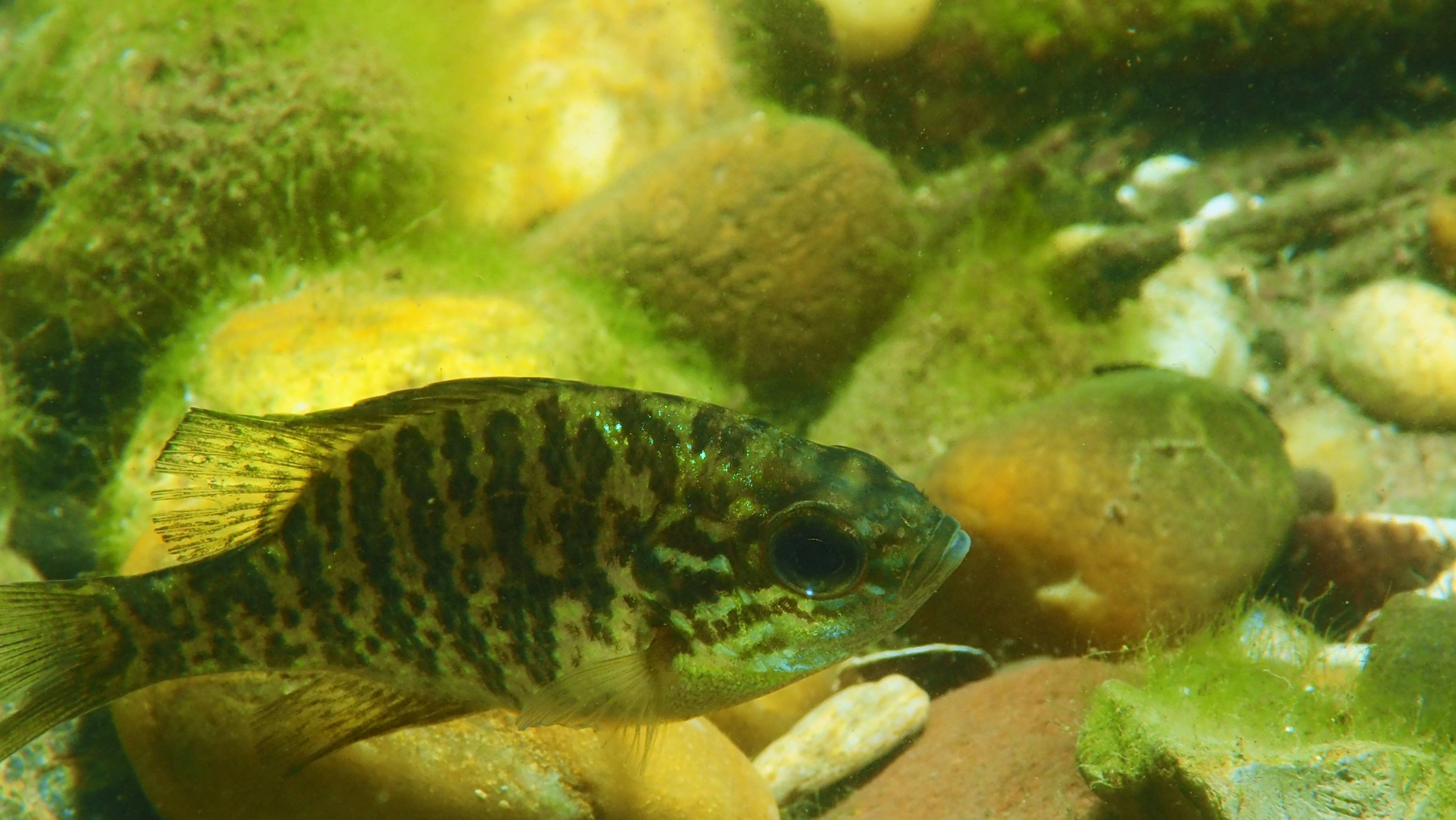Am Wochenende besuchen wir jedenfalls einige der Nester, die jetzt bei der Brutbewachung nur noch von einem Fisch „betreut“ werden. Und siehe da: wir finden noch glasig, weiße Eier, ebenso wie sandkorngroße schimmernde Augen in den Eiern sowie scheinbar bereits geschlümpfte, winzige Fischchen, bei denen bereits das dominante Auge als auch die für den Sonnenbarsch typischen Punkte zu erkennen sind. Diese Fotos entstehen mehr oder weniger im „Blindflug“, denn die Winzlinge sind erst durch die Vergrößerung sichtbar. Mit dem bloßen Auge ist diese Schönheit der Natur nur zu erahnen.