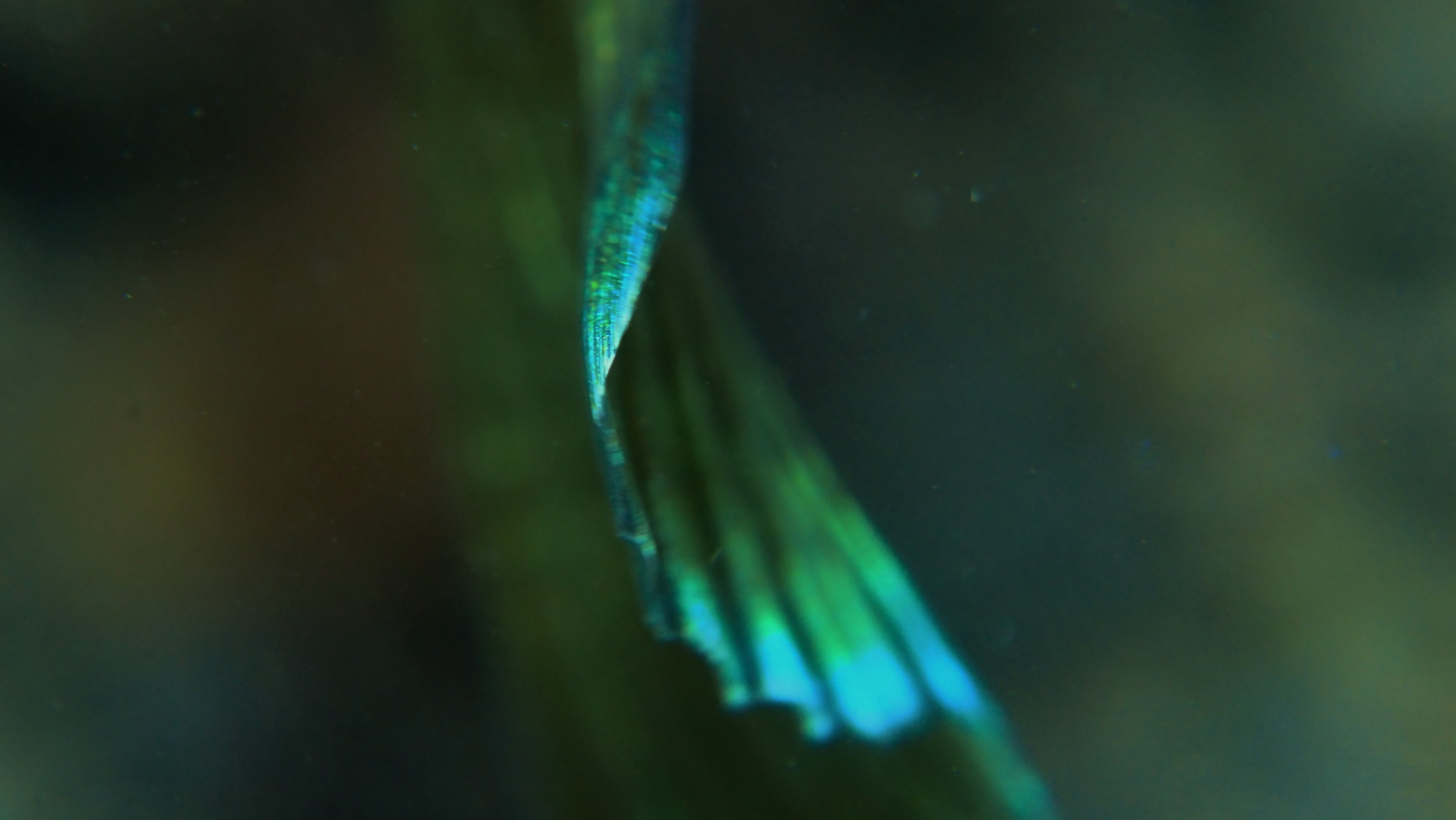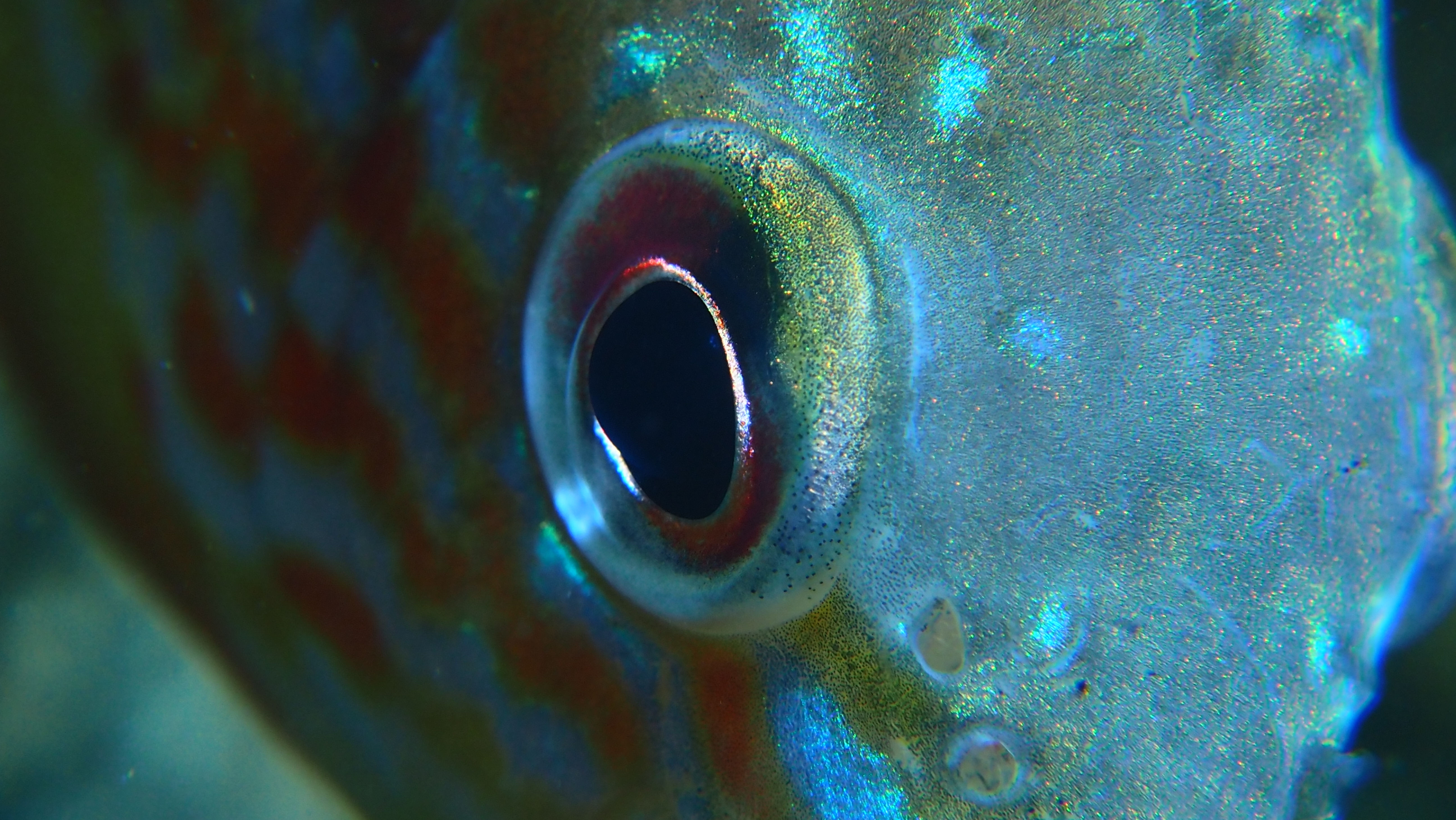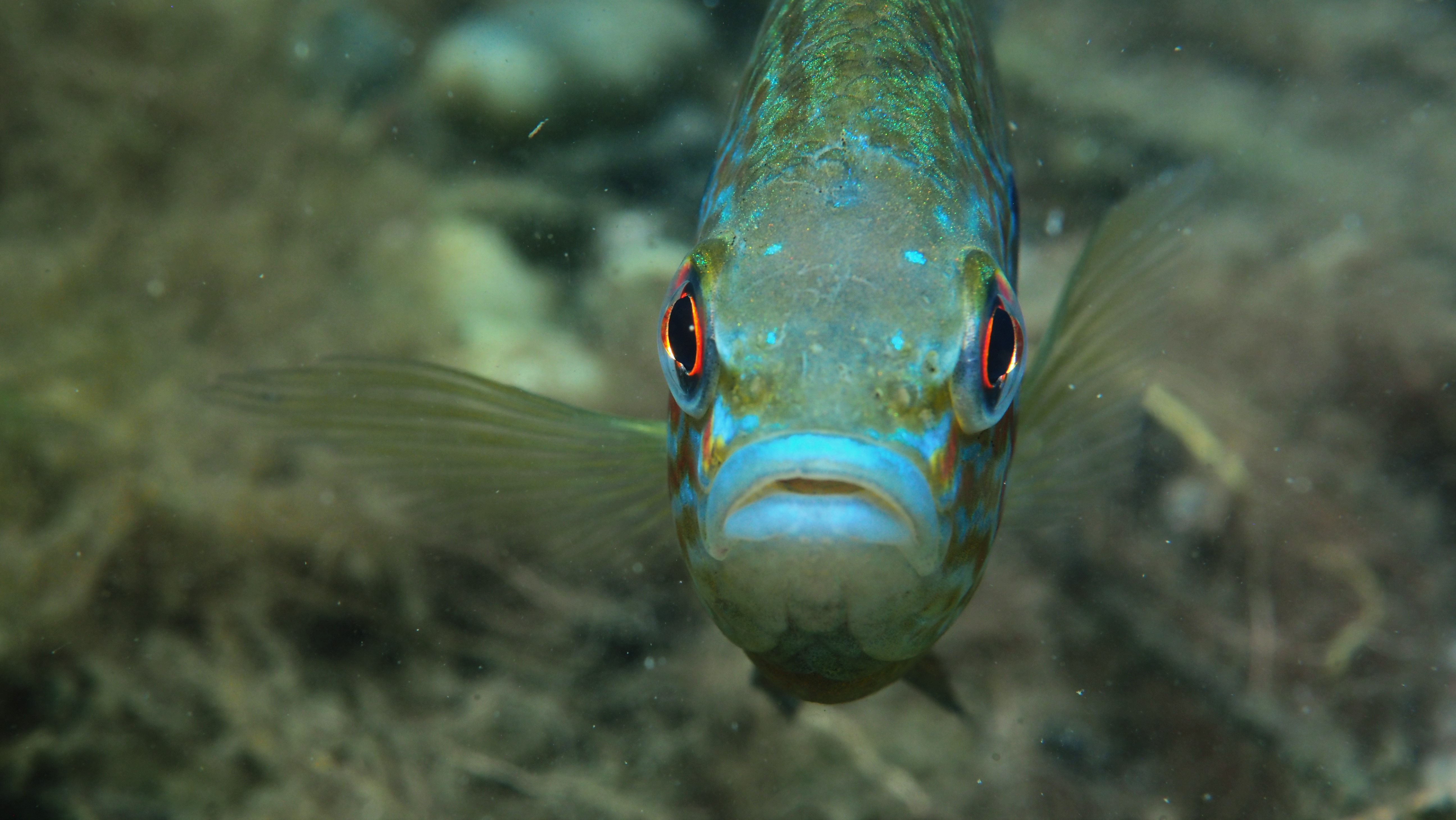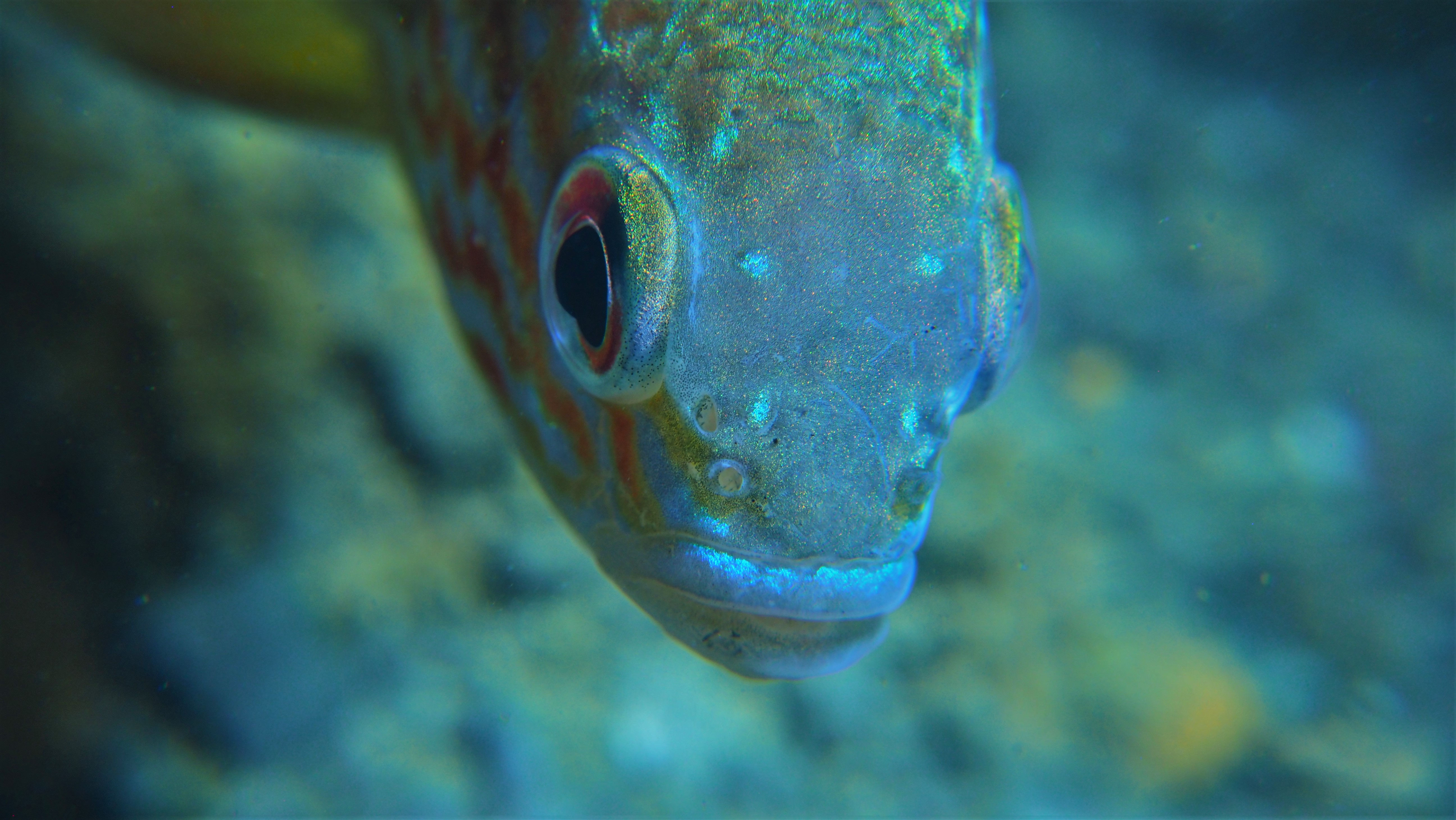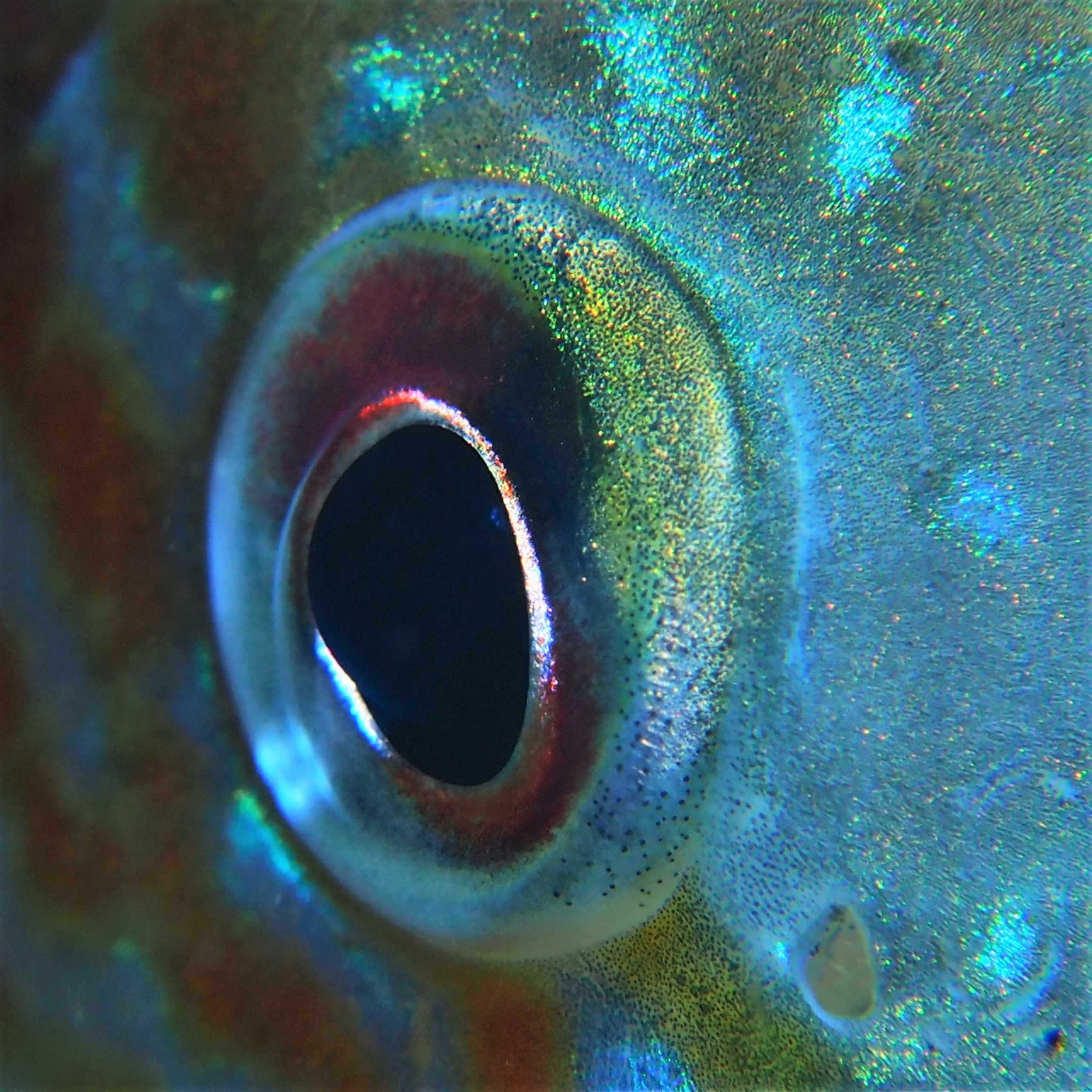 Am Wochenende besuchen wir jedenfalls einige der Nester, die jetzt bei der Brutbewachung nur noch von einem Fisch „betreut“ werden. Und siehe da: wir finden noch glasig, weiße Eier, ebenso wie sandkorngroße schimmernde Augen in den Eiern sowie scheinbar bereits geschlümpfte, winzige Fischchen, bei denen bereits das dominante Auge als auch die für den Sonnenbarsch typischen Punkte zu erkennen sind. Diese Fotos entstehen mehr oder weniger im „Blindflug“, denn die Winzlinge sind erst durch die Vergrößerung sichtbar. Mit dem bloßen Auge ist diese Schönheit der Natur nur zu erahnen.