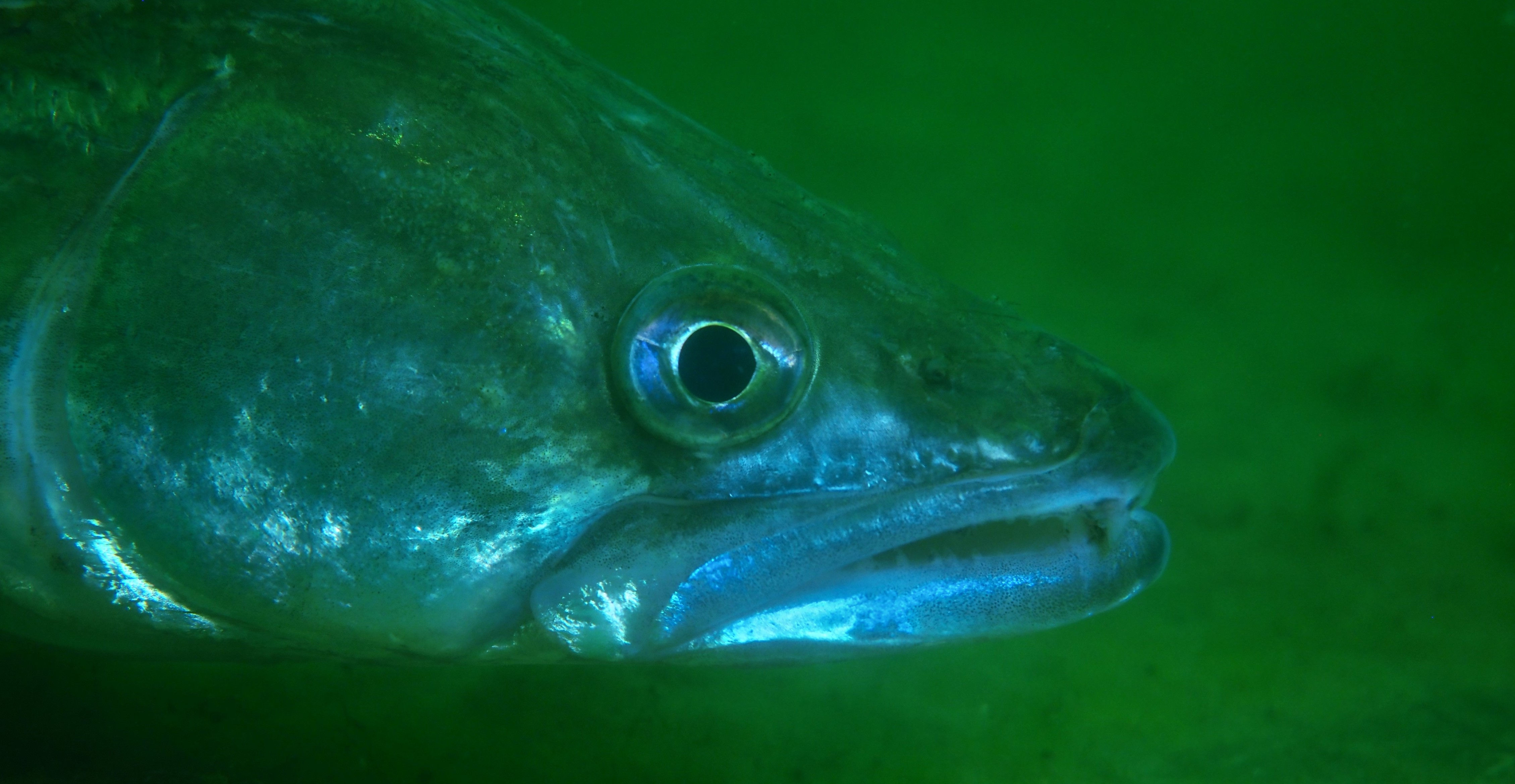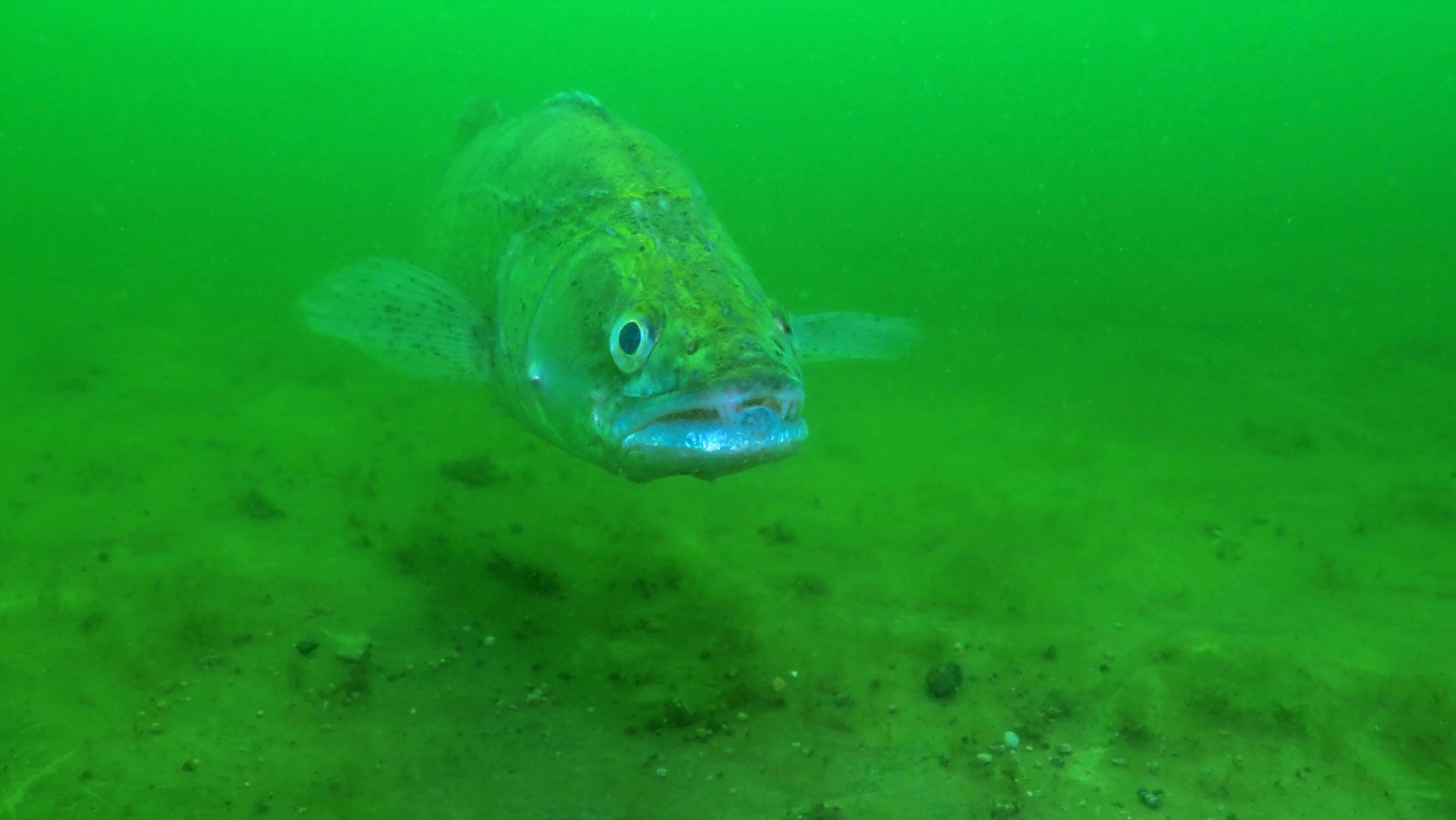 Dass wir mit der Makrolinse ins Wasser steigen, ist bei den Bedingungen bestimmt jedem von Euch klar. Beim Besuch der Zander auf der Plattform – Ulli nennt den größeren der beiden schon fast liebevoll „Franky“ – hält dieser ganz still, so als wollte er abgelichtet werden. Sein Partner schwebt bei der ganzen Aktion oberhalb oder neben Ulli und beobachtet die Fotosession seiner besseren Hälfte.