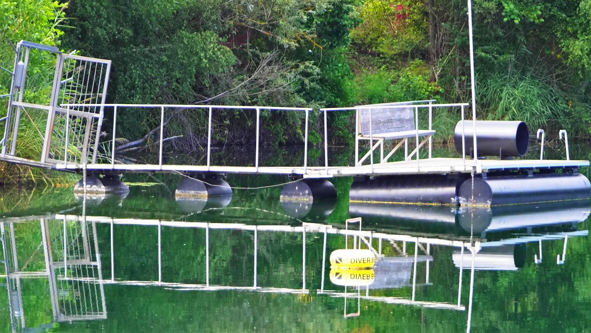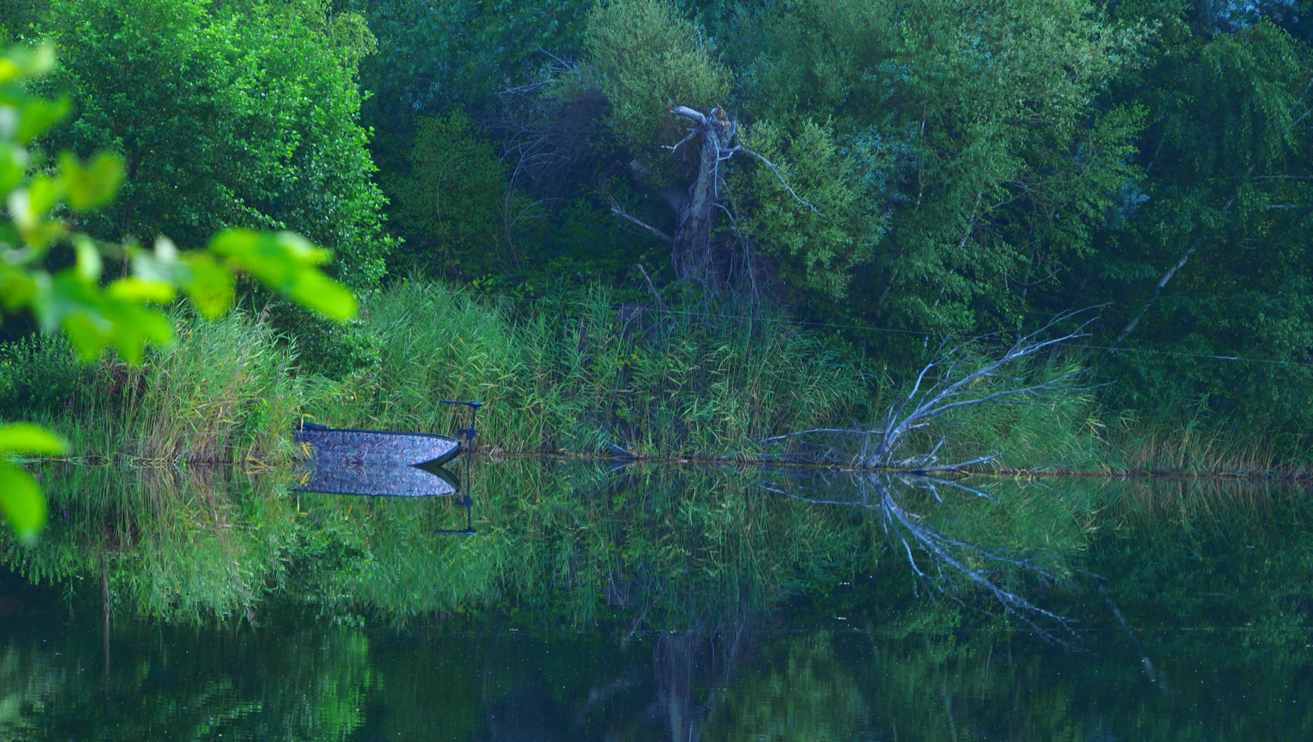 Boot und Angler haben beide eine Genehmigung für den See. Die über den See gespannte Angelleine, die gestern noch nicht da war, die soll angeblich von Schwarzanglern stammen, genau so wie der an der Oberfläche, jetzt in der vom Steg aus gesehenen, hinteren rechten Ecke vergammelnde Wels.