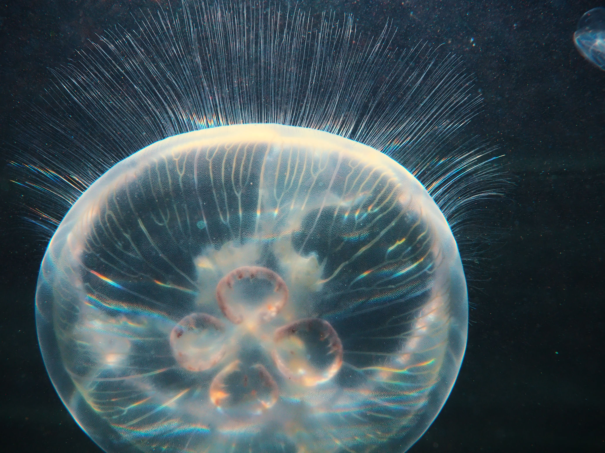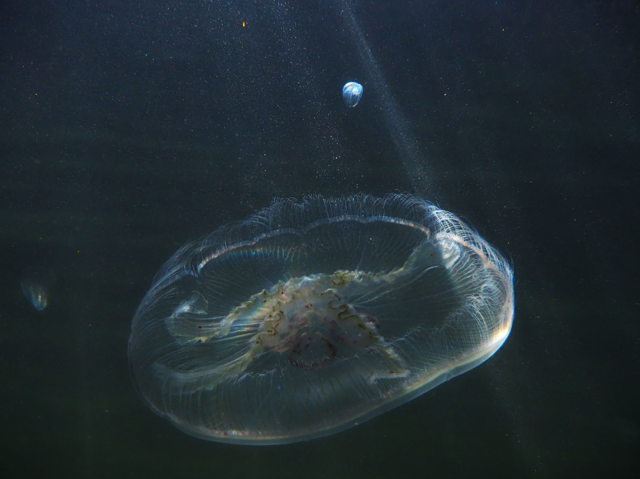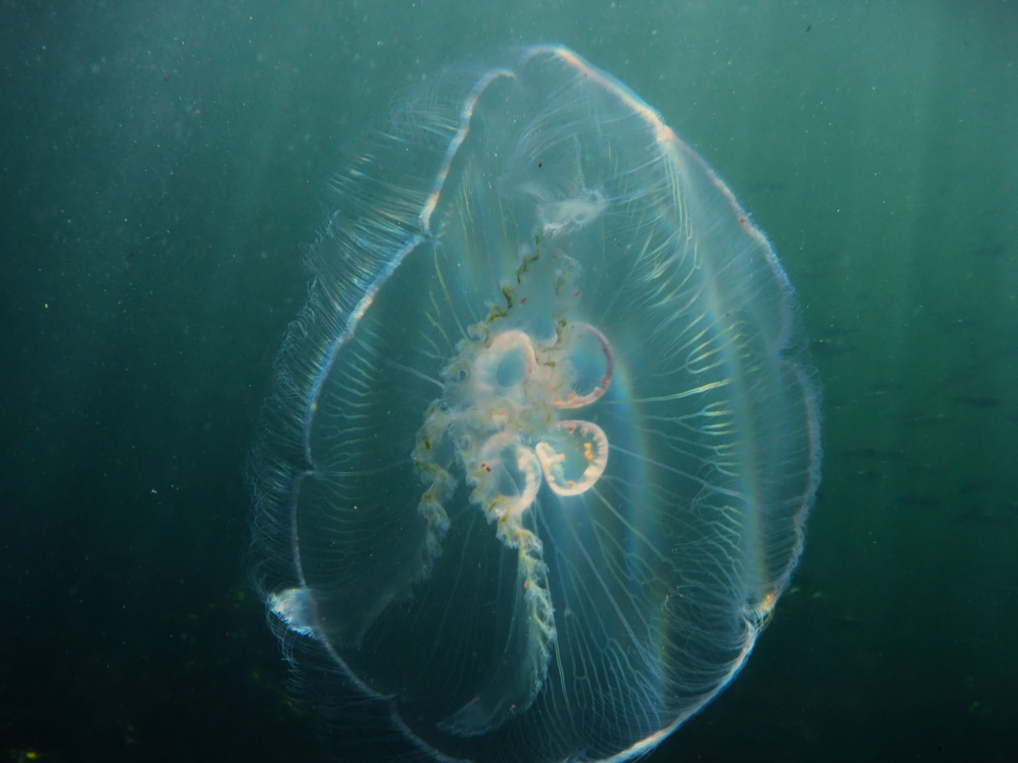 Wahrscheinlich ist das auch der Grund warum die in den letzten Tauchgängen immer zahlreich anwesenden Quallen heute besonders auffallen. Nahe der Oberfläche scheinen sie von den sich brechenden Sonnenstrahlen erfasst regelrecht zu leuchten. In manchen sind die Spektralfarben des Regenbogens deutlich zu erkennen.