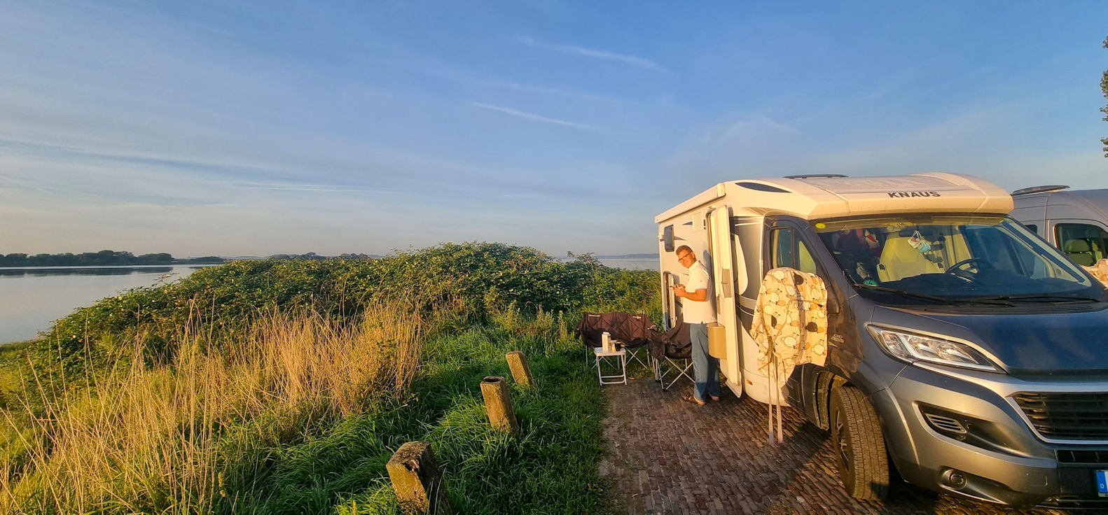 Und wir sind tatsächlich so früh, dass wir unseren bevorzugten Parkplatz direkt am Wasser bekommen und dann schnurrt erst einmal die Bialetti.