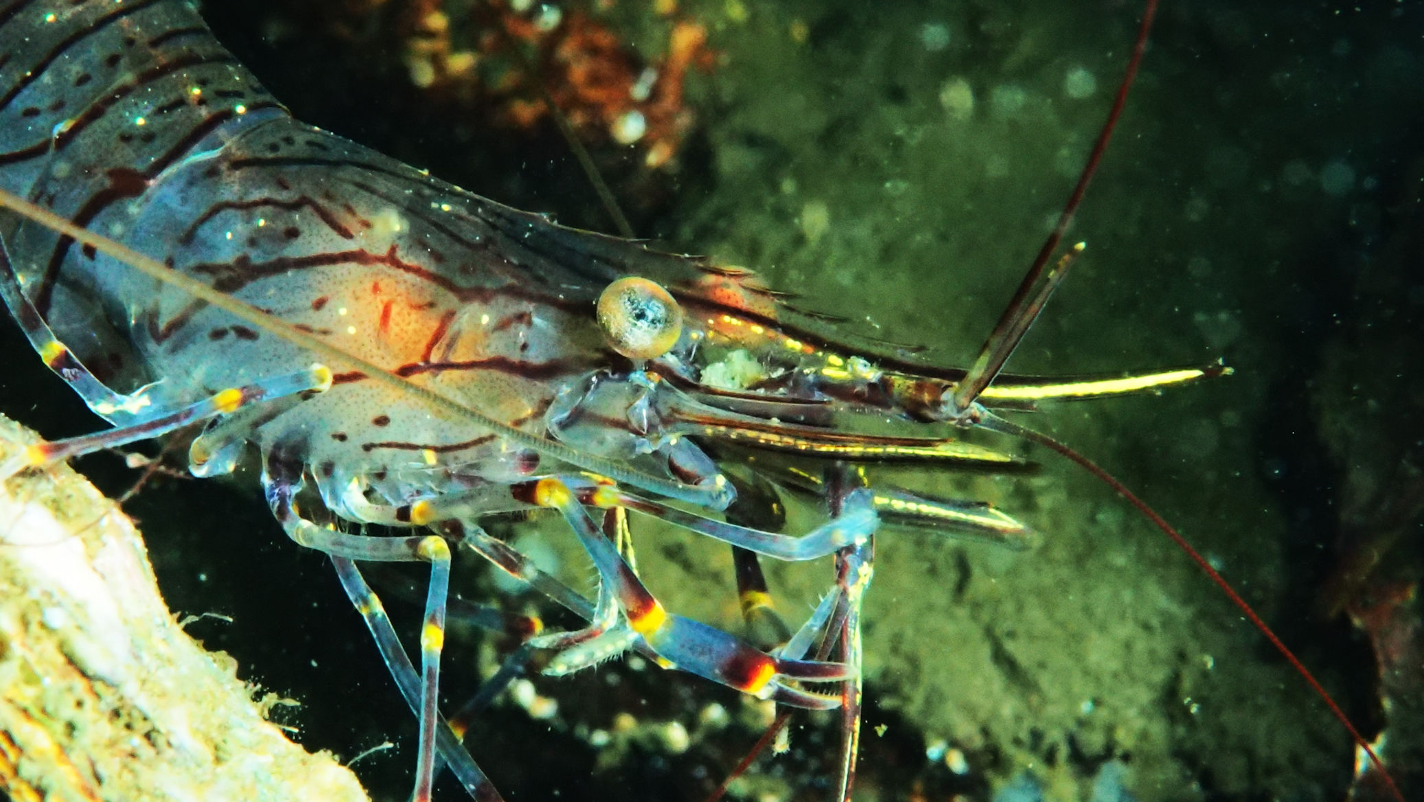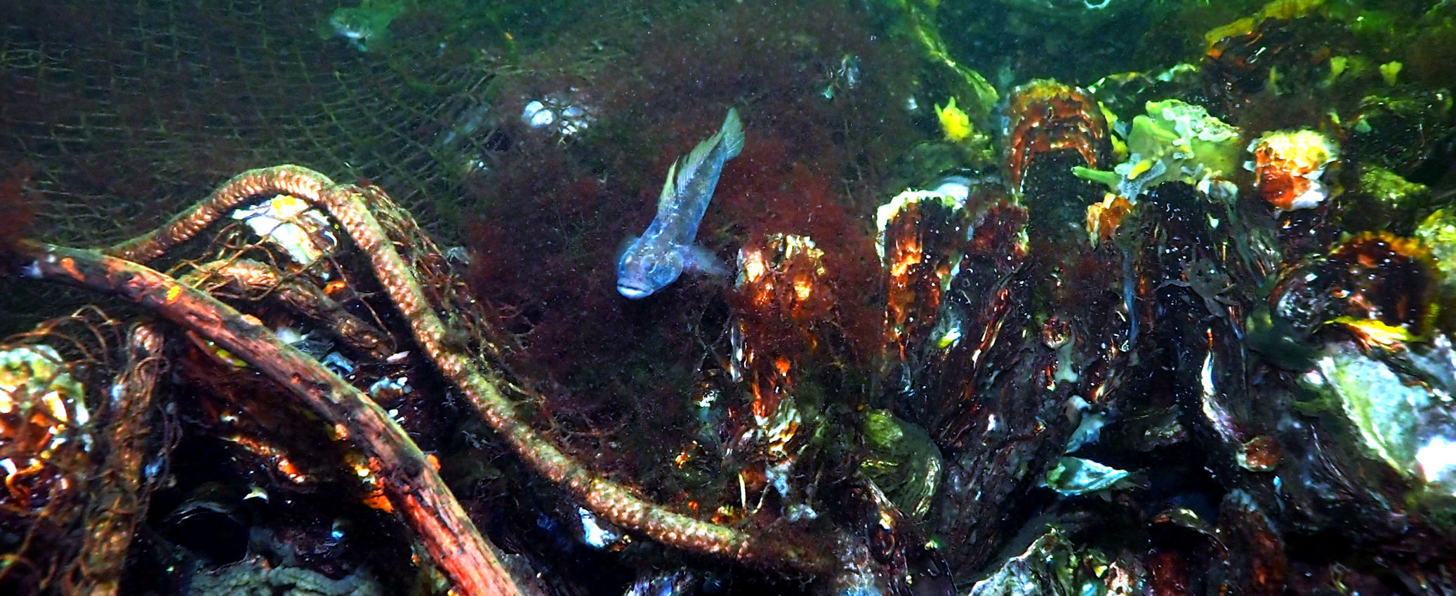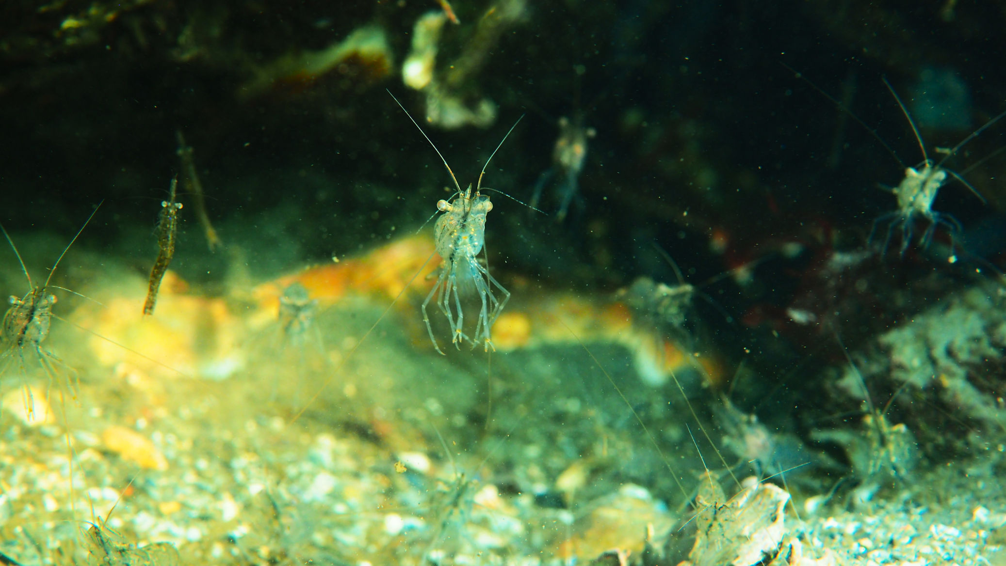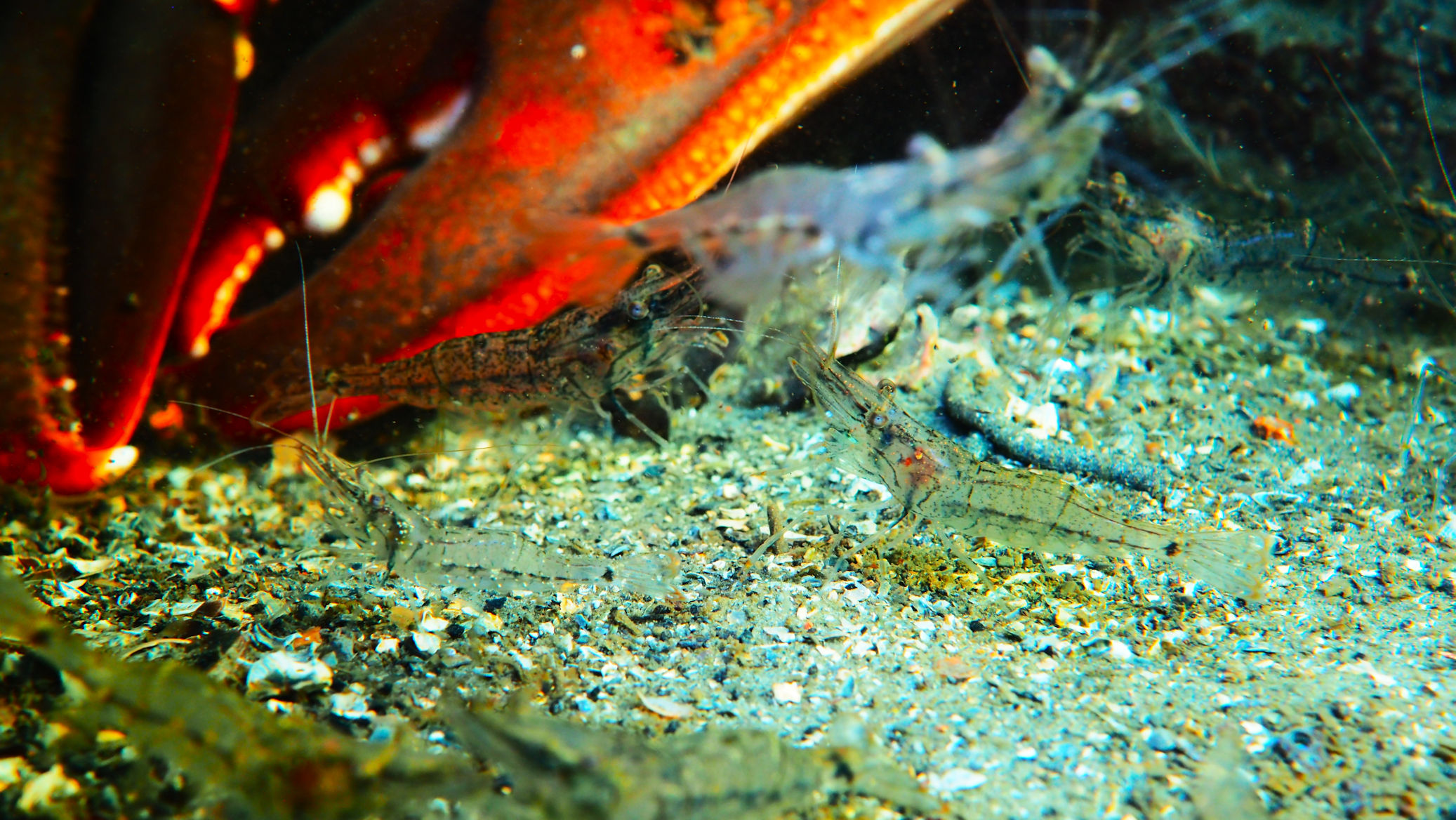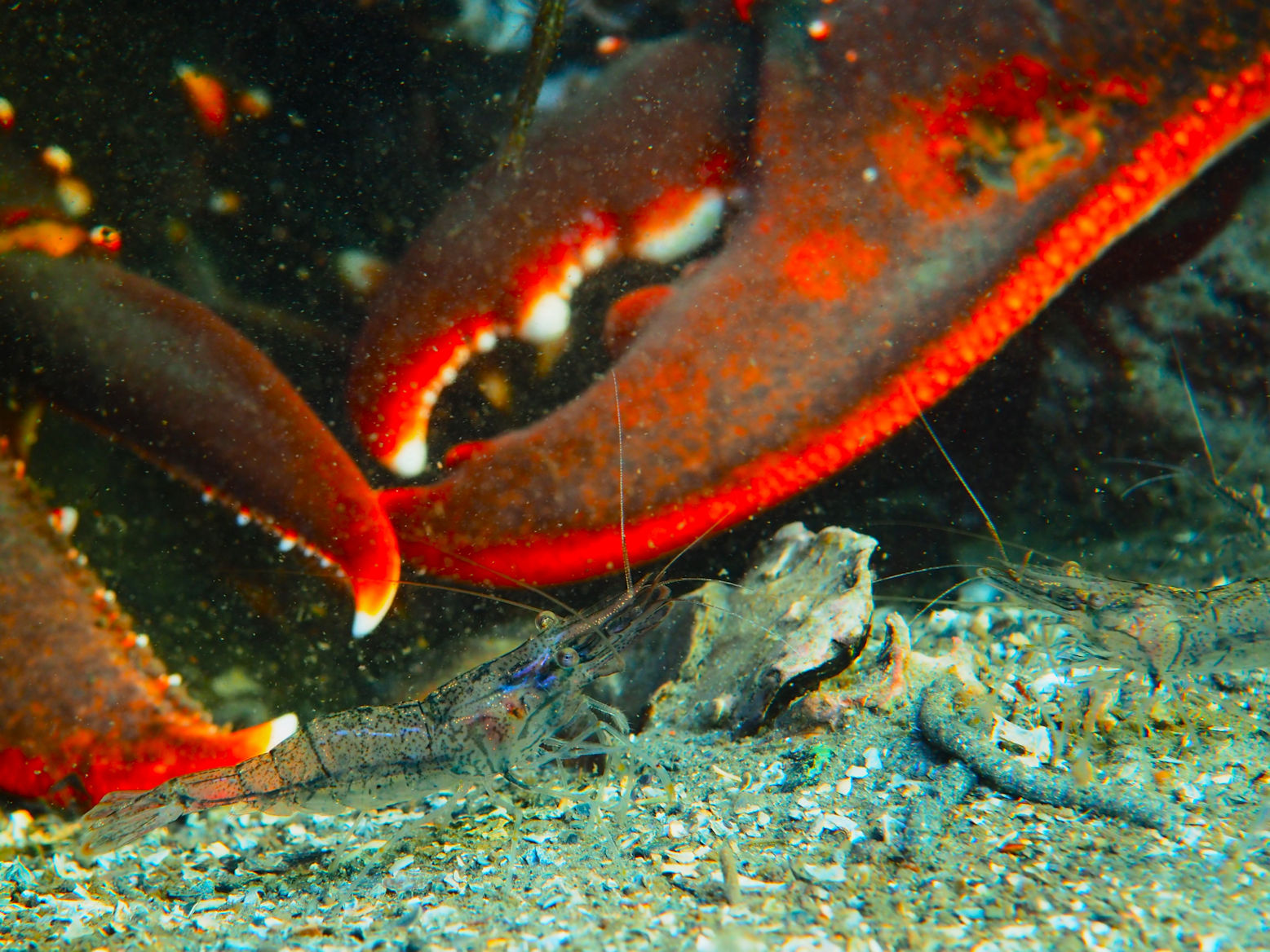 Und dann geht es los unter die Wasseroberfläche. Wir finden bezaubernde Riffformationen, die allgegegenwärtigen Quallen, Grundeln, Garnelen und besonders erwähnenswert: Eine riesige Garnelenansammlung und einen bei diesen Tieren lebenden großen Hummer, der so schnell aus seiner Wohnhöhle eilt, um seine Mitbewohner scheinbar zu verteidigen, dass er dabei jede Menge Sediment aufwirbelt.