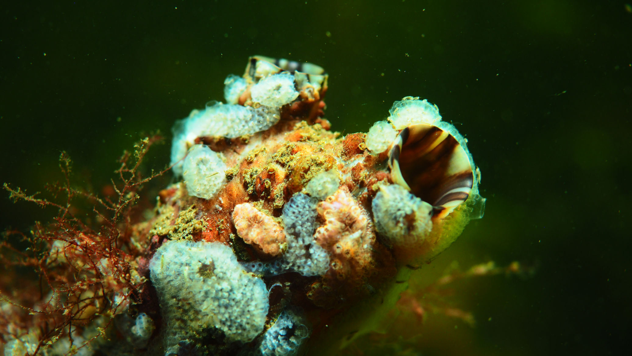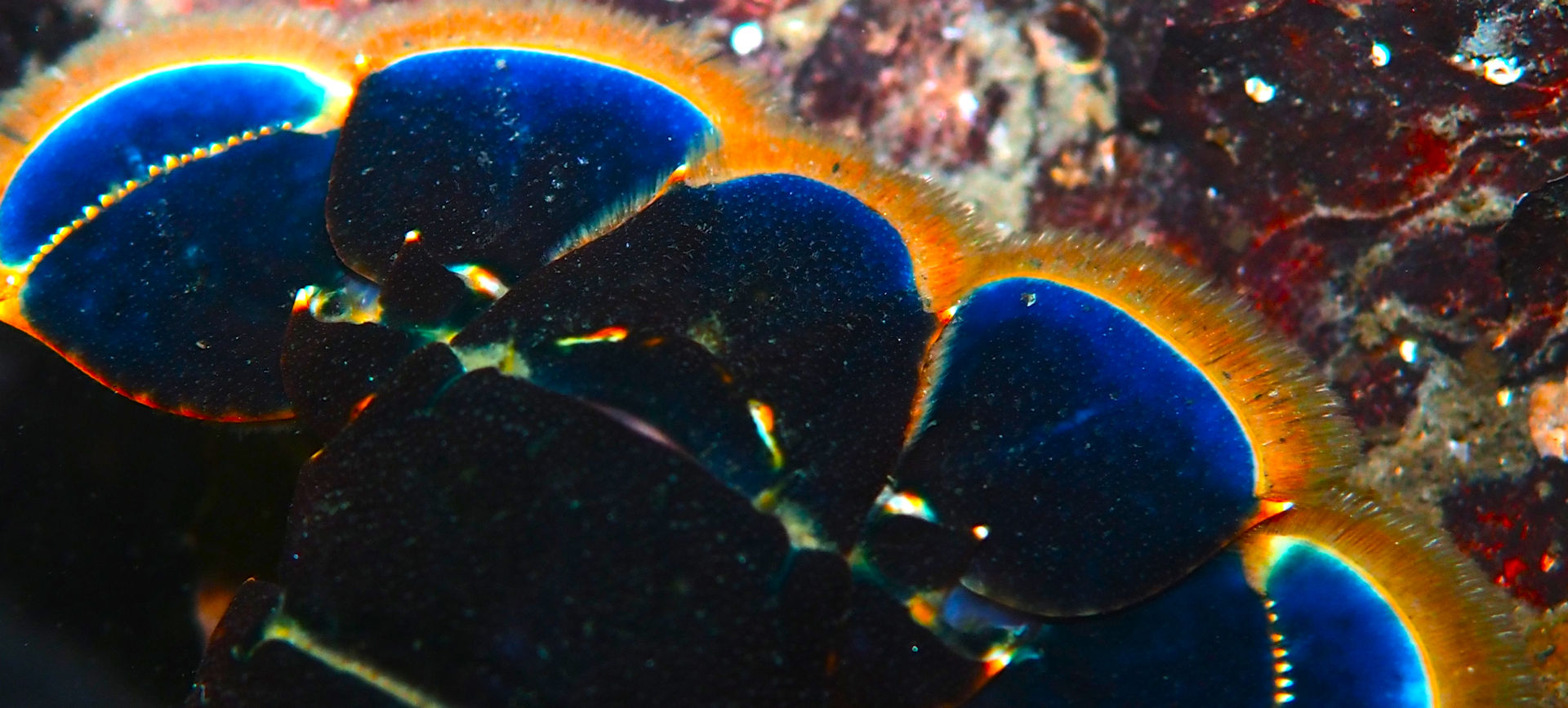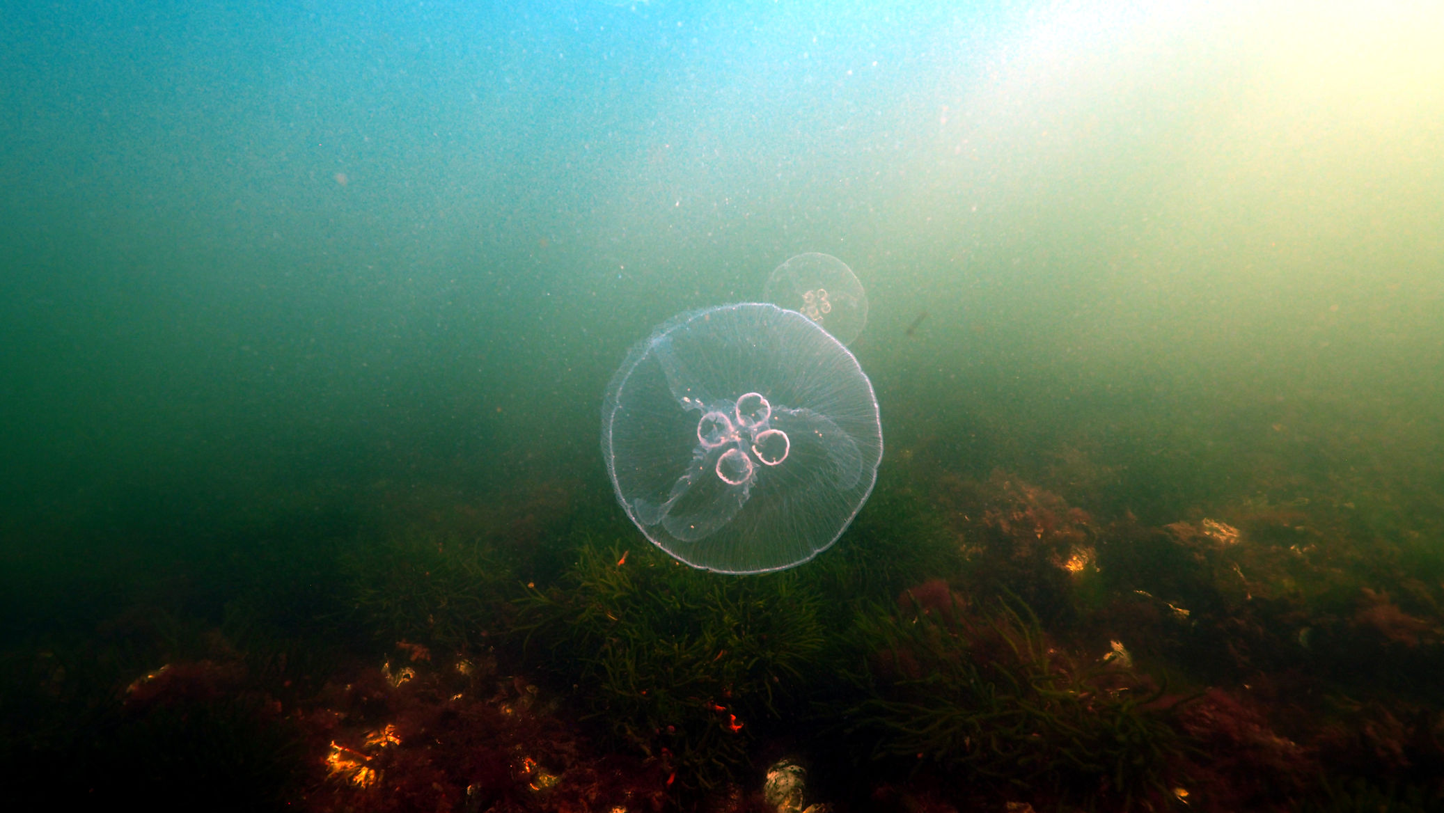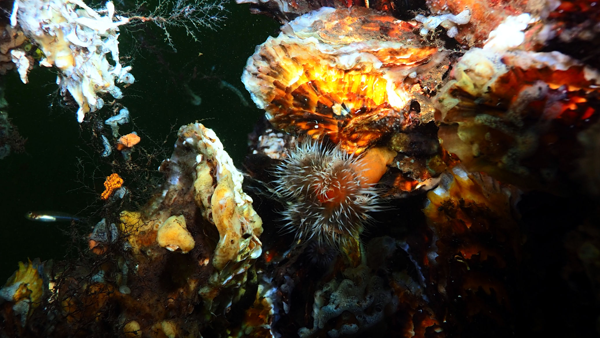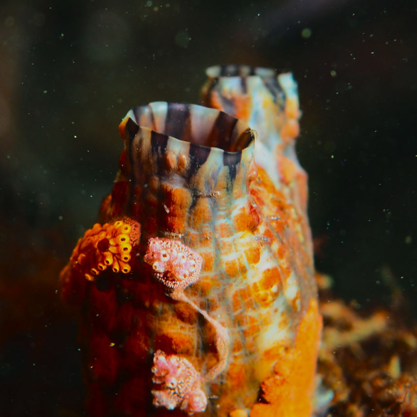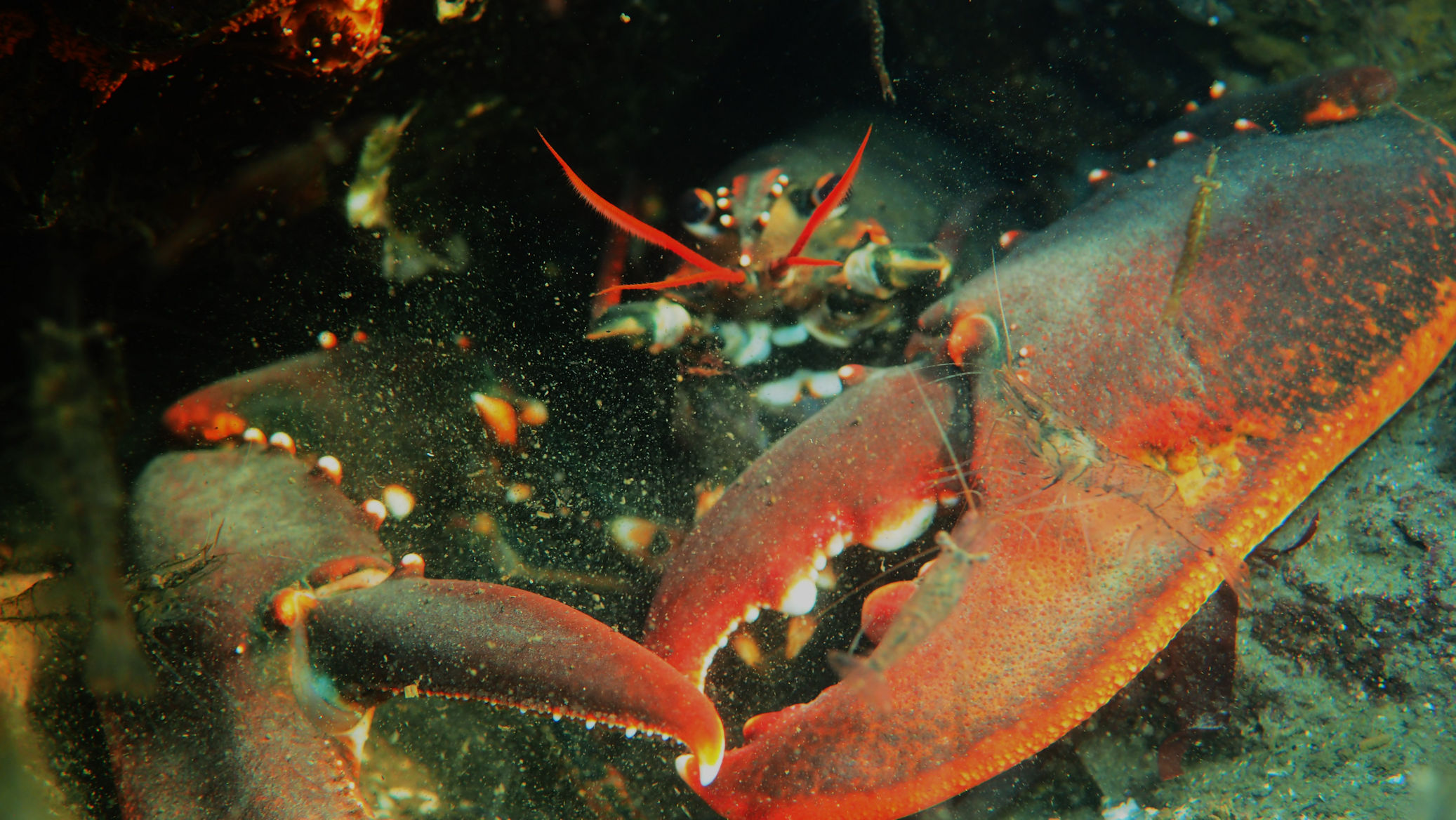 Und dann geht es los unter die Wasseroberfläche. Wir finden bezaubernde Riffformationen, die allgegegenwärtigen Quallen, Grundeln, Garnelen und besonders erwähnenswert: Eine riesige Garnelenansammlung und einen bei diesen Tieren lebenden großen Hummer, der so schnell aus seiner Wohnhöhle eilt, um seine Mitbewohner scheinbar zu verteidigen, dass er dabei jede Menge Sediment aufwirbelt.