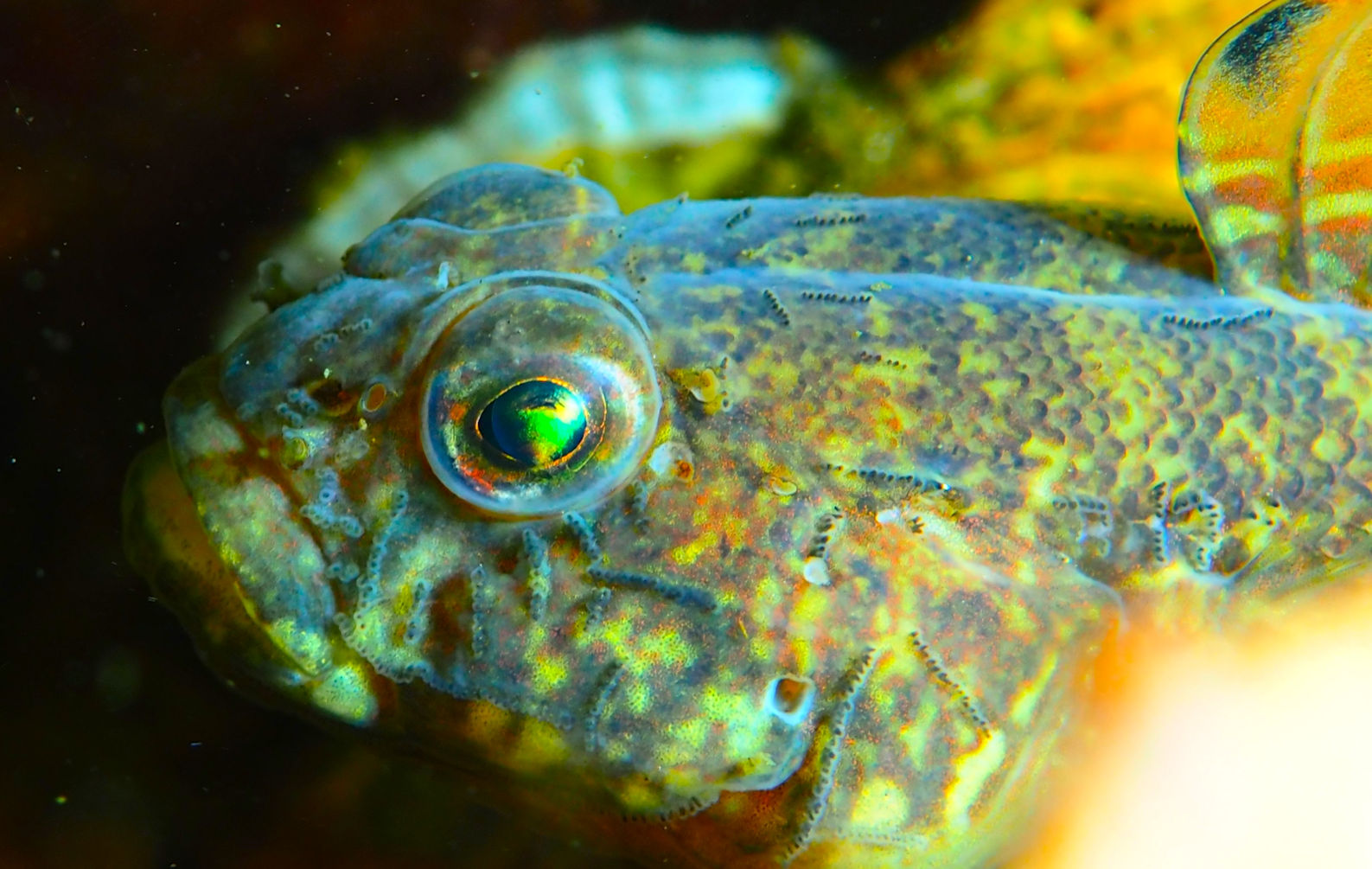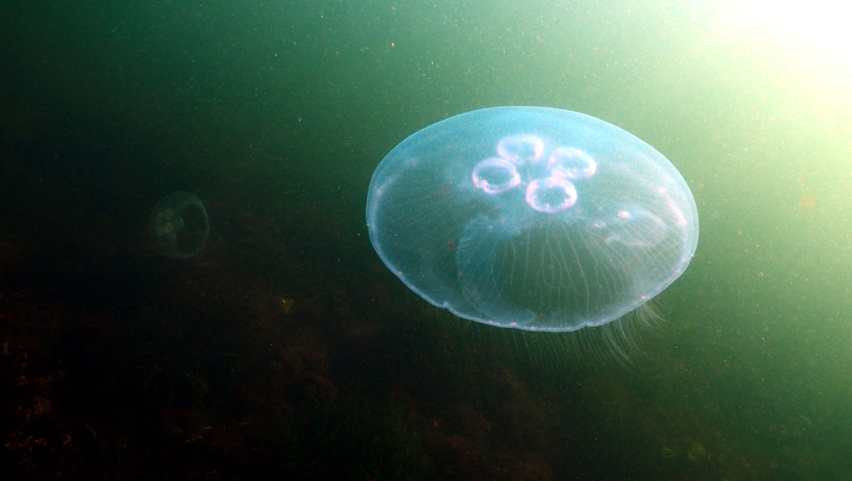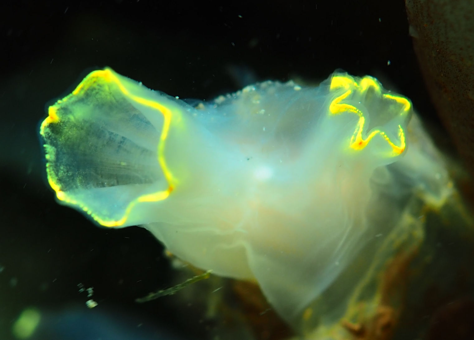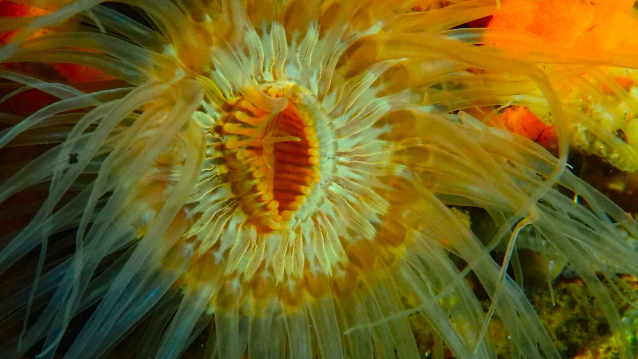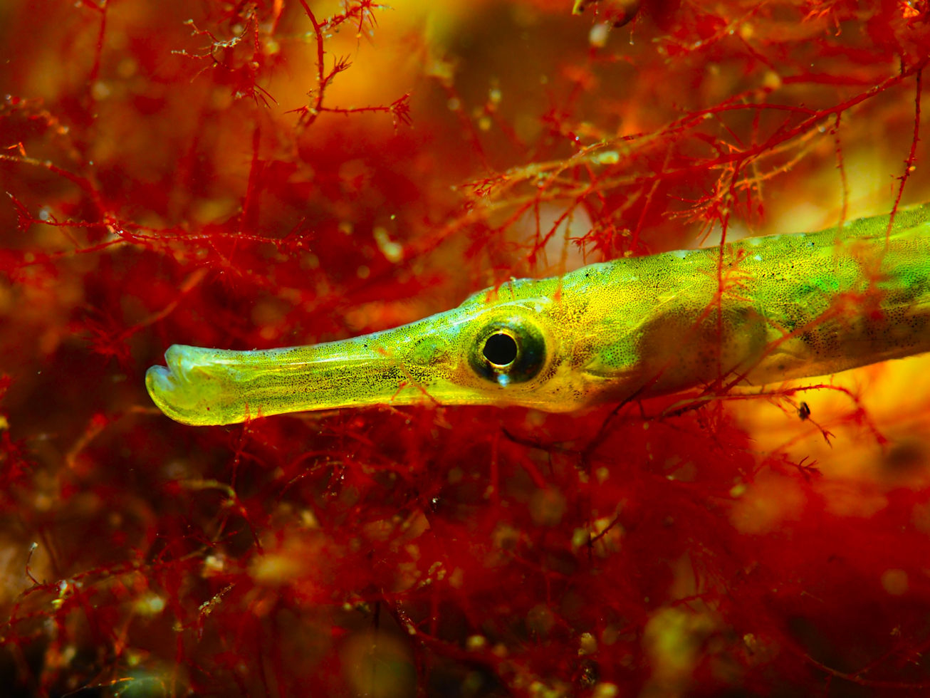 Und dann geht es los unter die Wasseroberfläche. Wir finden bezaubernde Riffformationen, die allgegegenwärtigen Quallen, Grundeln, Garnelen und besonders erwähnenswert: Eine riesige Garnelenansammlung und einen bei diesen Tieren lebenden großen Hummer, der so schnell aus seiner Wohnhöhle eilt, um seine Mitbewohner scheinbar zu verteidigen, dass er dabei jede Menge Sediment aufwirbelt.
