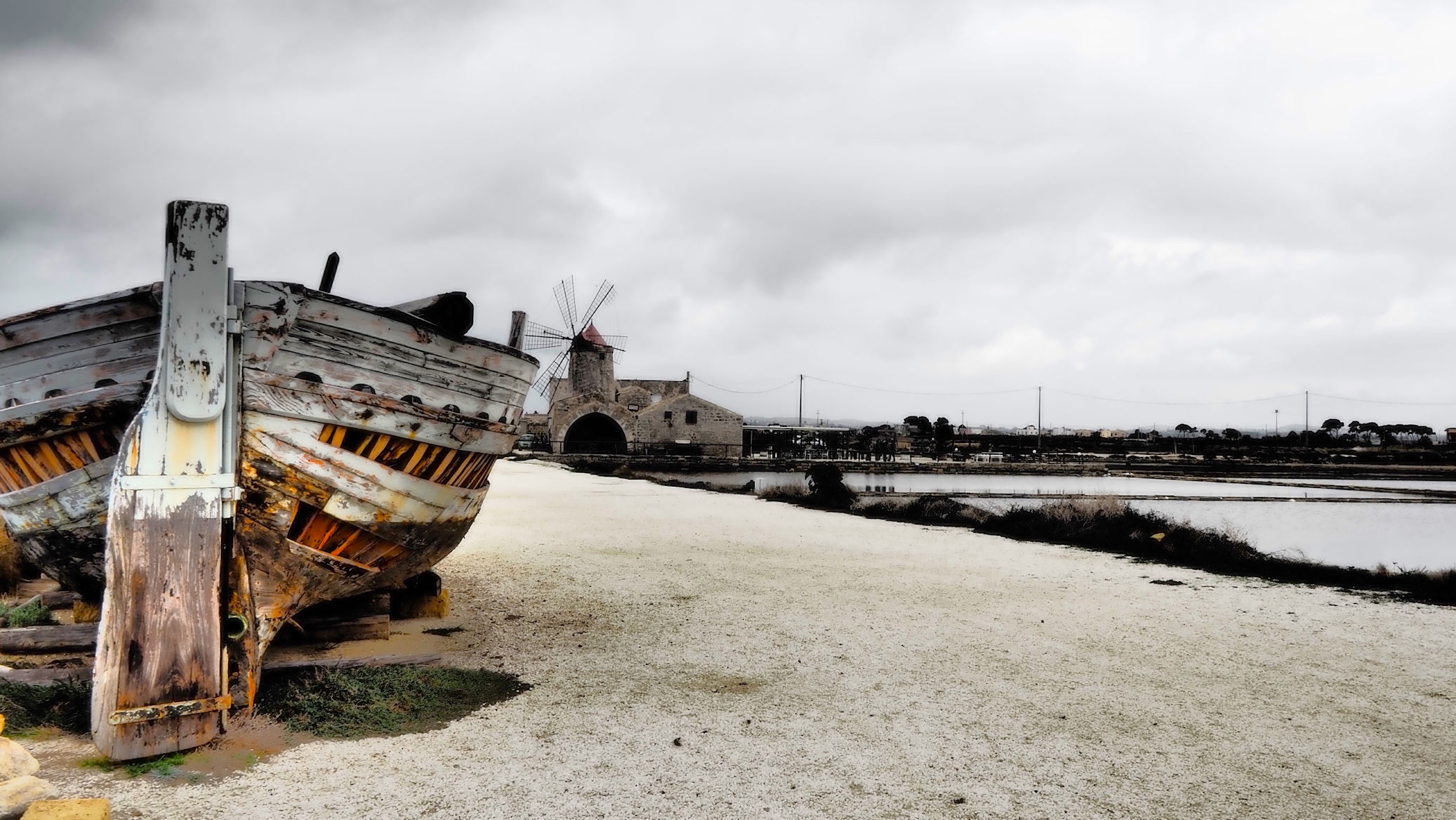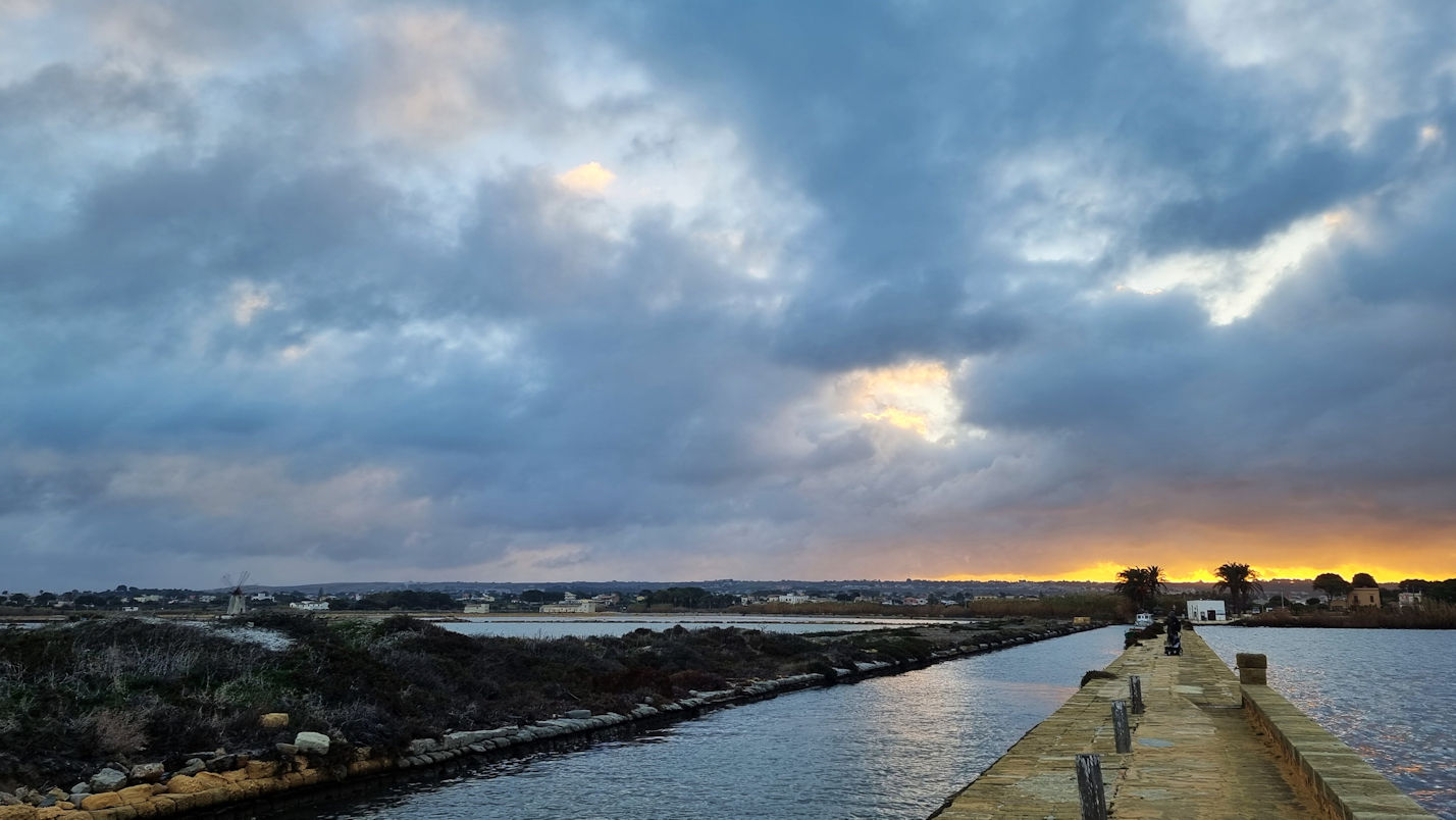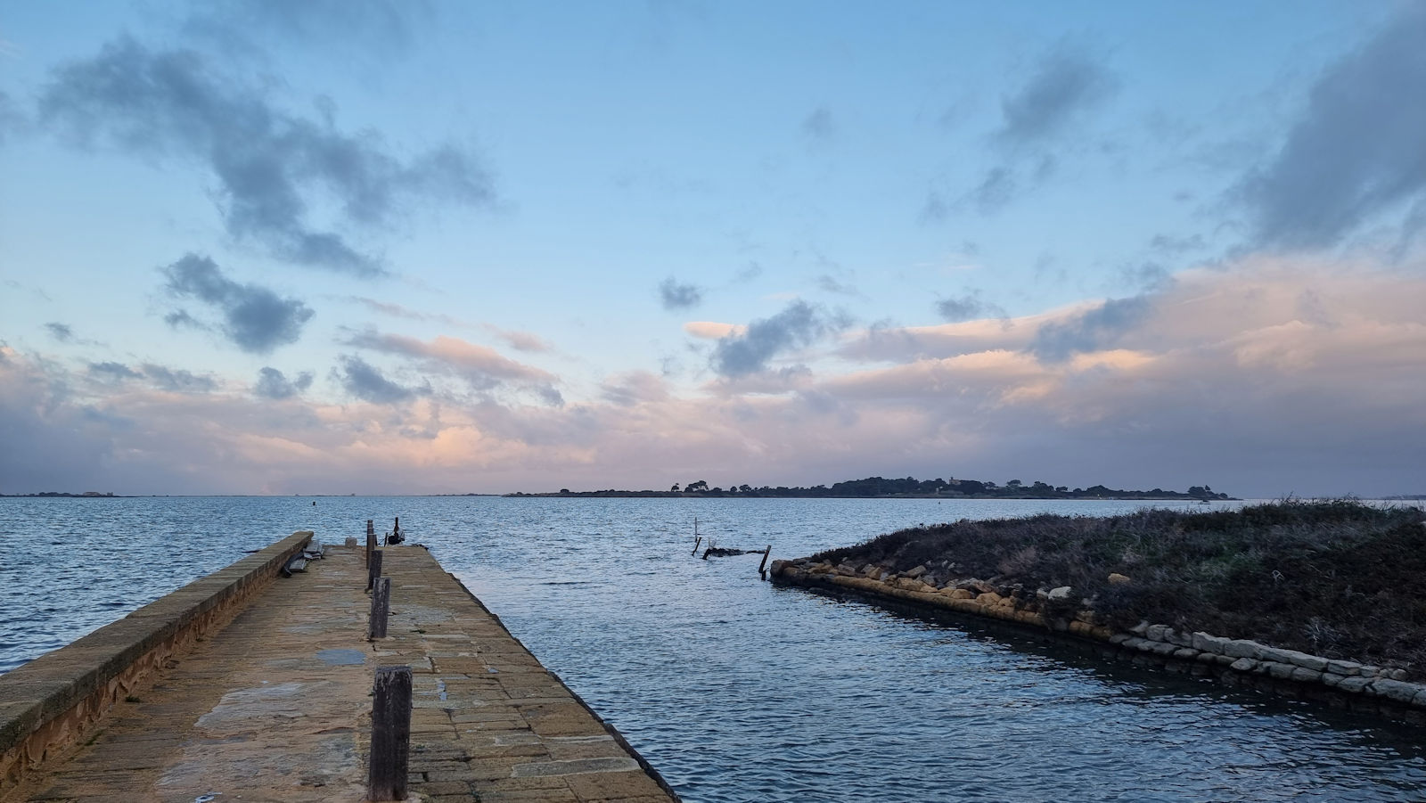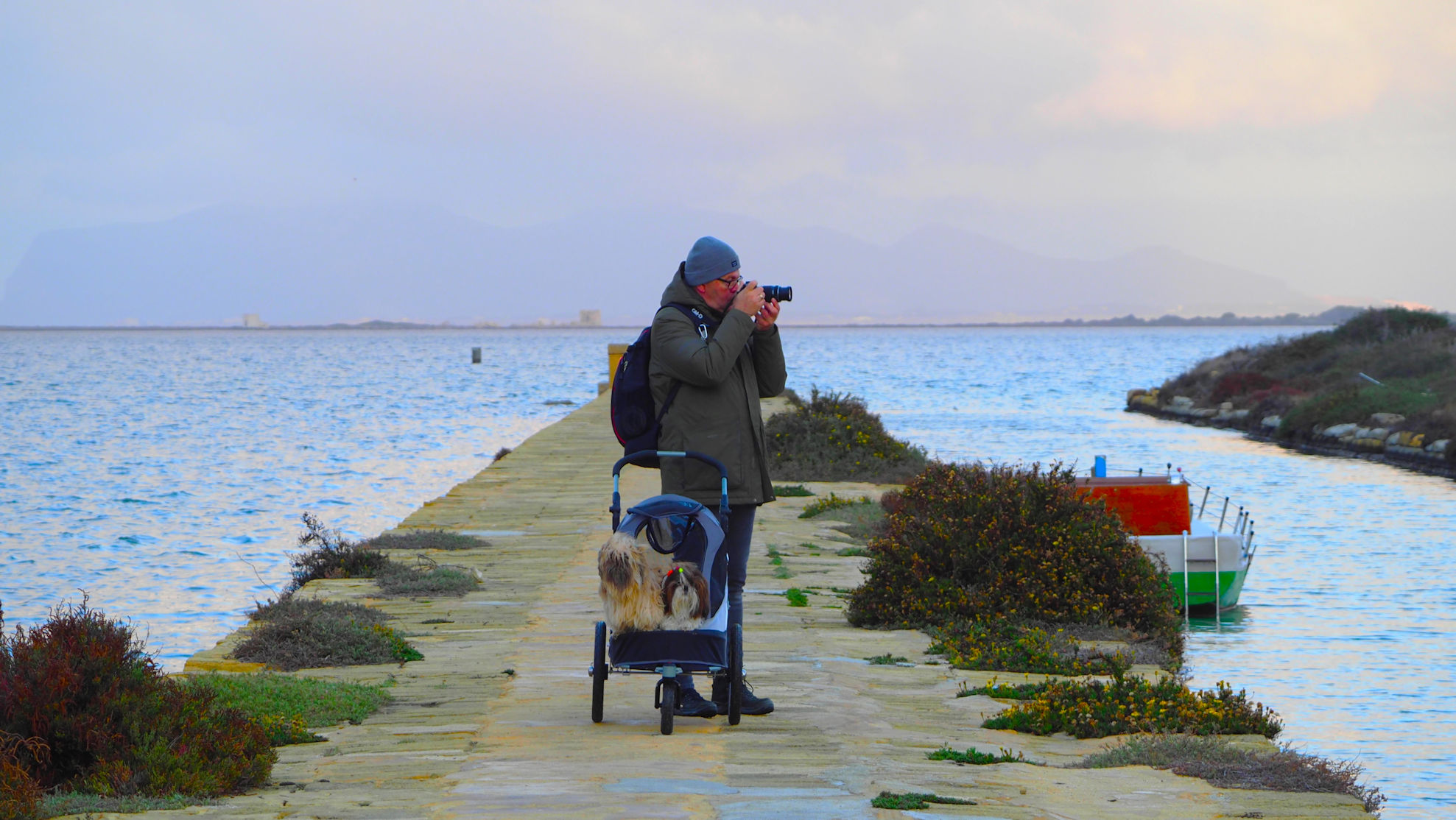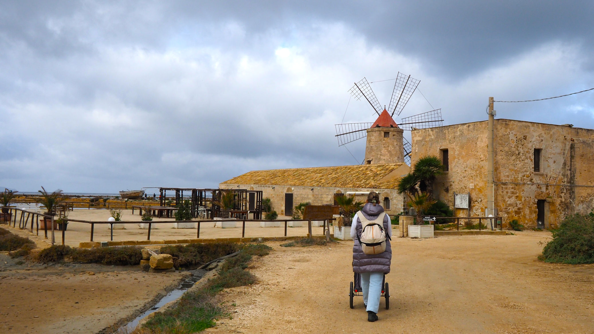 Unsere Fahrt geht weiter am Wasser entlang. Aber ohne nennenswerte Vorkommnisse. Wir landen schließlich in der Bar Simon des Weilers Birgi, wo wir am Straßenrand parken. Man kann ein wenig merken, dass sich alle in der Bar über unser Auftauchen hier wundern, aber die meisten sind sehr nett, wünschen Auguri und schauen unsere Fellnasen ganz verzaubert an. Wir genießen extrem leckere Schoko- und Waldbeerbrioches zu unseren Cappuccini, kaufen im Laden nebenan noch etwas Gemüse ein und es geht weiter in Richtung der vor Trapani liegenden Salinen.