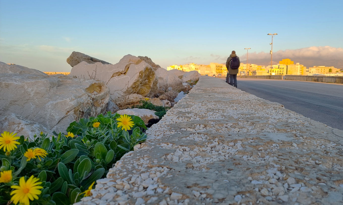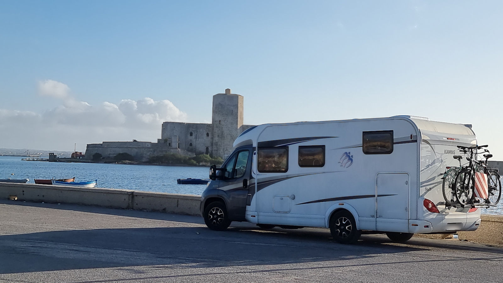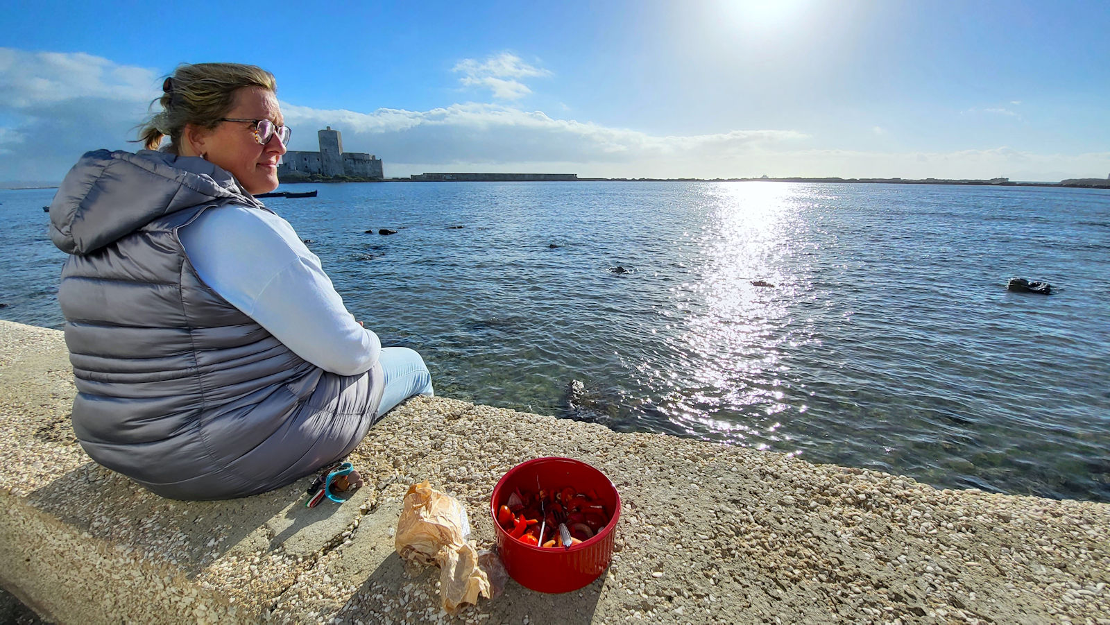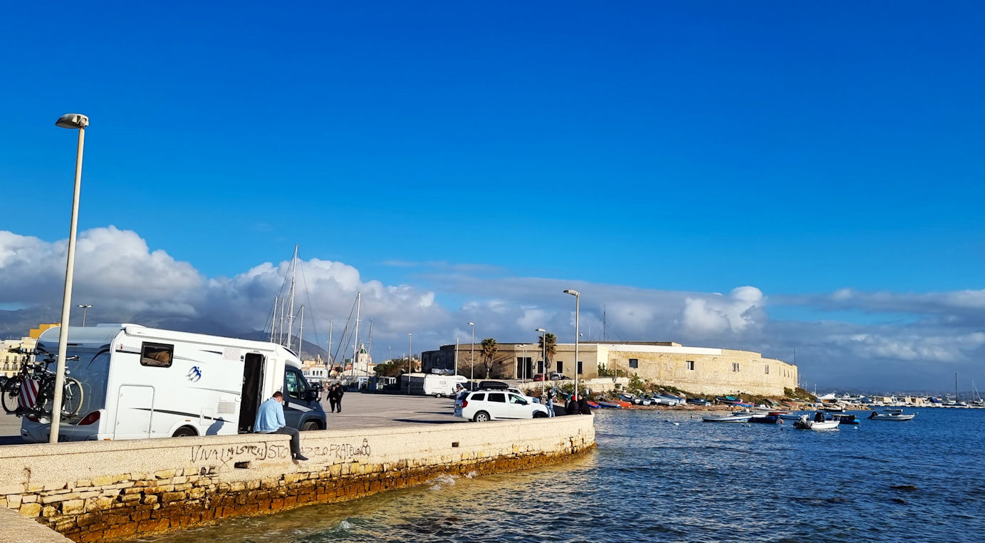 Außer uns sind noch zwei andere Womos da. Eins aus Deutschland, aber dessen Besatzung schafft nicht mal ein „Hallo“ und eins aus Trapani. Ein netter Herr mit seinem Schmusehund. Er hat Zeit für einen netten Plausch und ist sehr nett. Und sein Hund lässt sich von Ulli die ganze Zeit kuscheln. Der Mann verabschiedet sich mit einem netten „Auguri, ci vediamo!“ und dann ist es Zeit für eine Mittagspause auf der Hafenmauer. Die Sonne ist wunderbar warm und die Aussicht an diesem Ort ist toll.