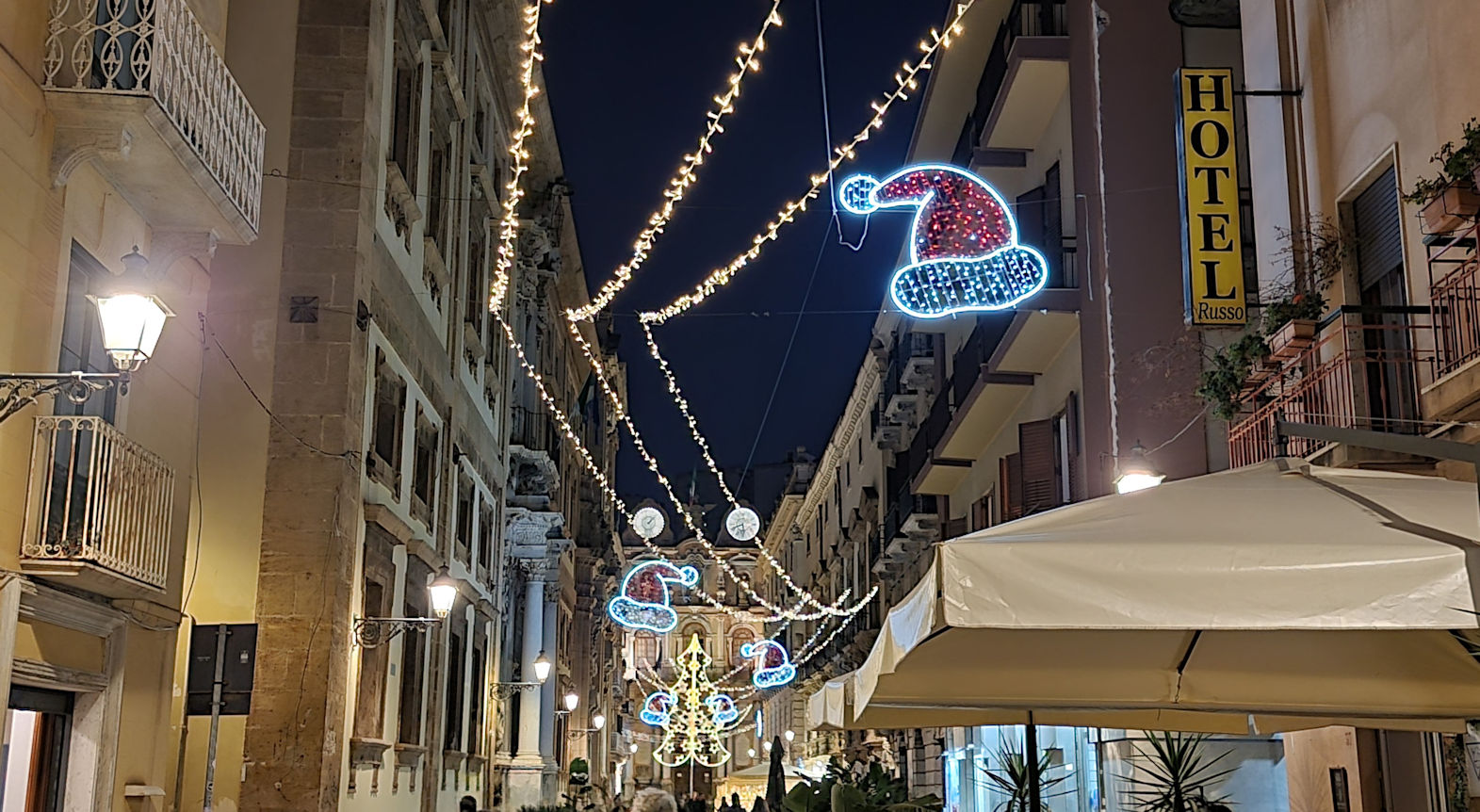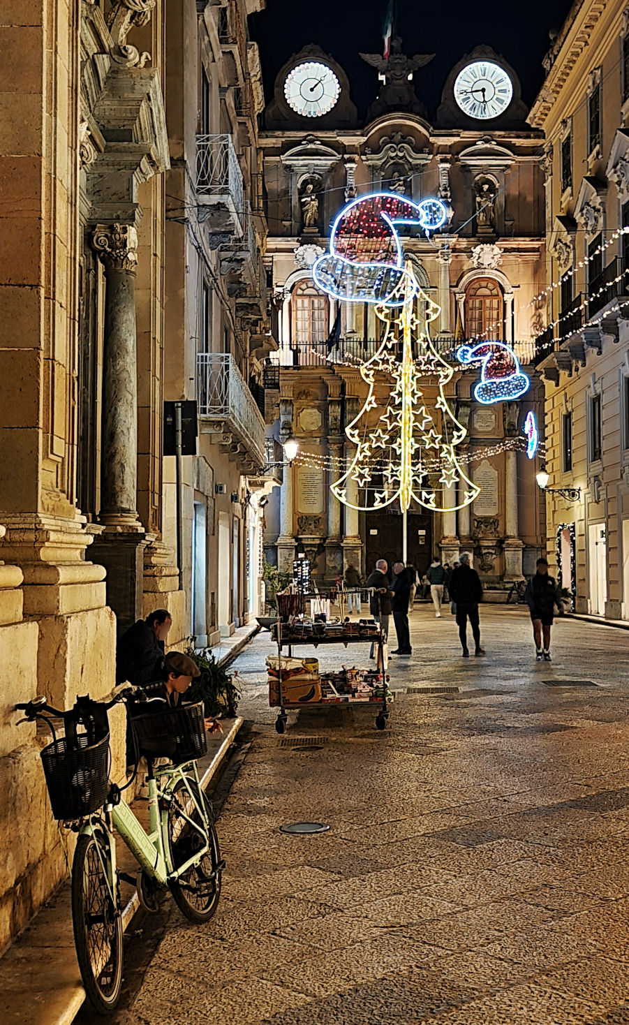 Gegen 5 Uhr geht es bei Traumfarben mit Hundetransporter in die nahegelegene Stadt. Wunderschön, klein und überschaubar. An der ersten Bar Fronte Mare am Lungomare ist Ralf zwar im ersten Moment skeptisch, aber die Bar, der Wein, der Barbesitzer…hier passt einfach alles. Kurze Zeit später stehen wir an der imposanten Kathedrale. Alles leuchtet noch hell im Weihnachtsglanz, die Menschen sind nett und bewundern unsere Fellnasen und am Tor an der alten Uhr spricht uns eine ältere Dame so herzlich an, dass das noch den ganzen Abend nachwirkt. Wir aperitiveln noch in einer weiteren Bar, die sich aber als Katastrophe herausstellt.