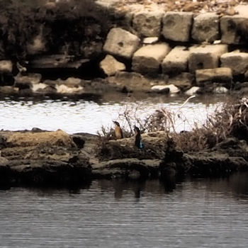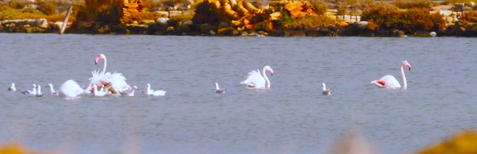 Die nette Frau am Eingang erklärt ein wenig zu den Salinen und schon stehen wir auf einem der Dämme und versuchen die kleinen blauen Wunder zu orten. Und es gelingt uns. Leider in recht großer Entfernung. Aber wir sind schonmal ganz zufrieden mit der Fotoausbeute.