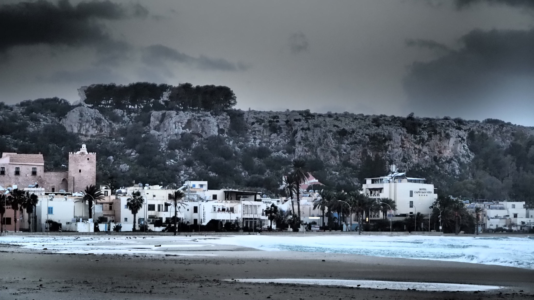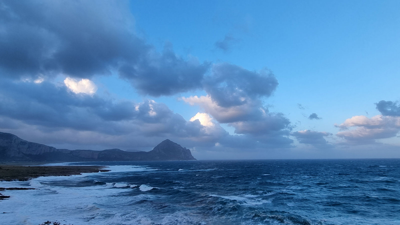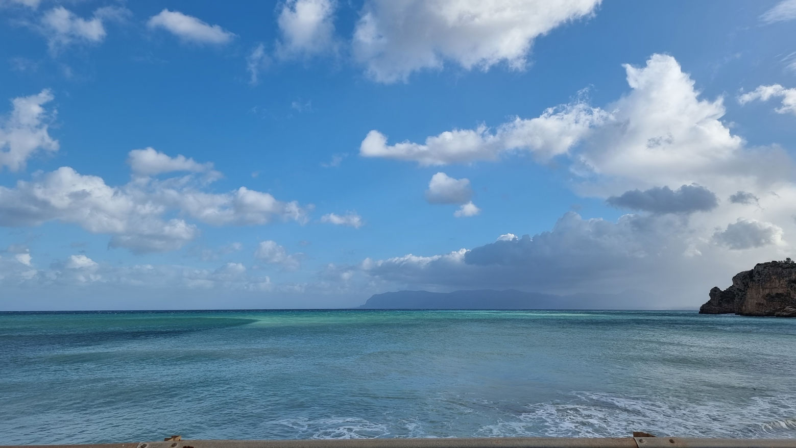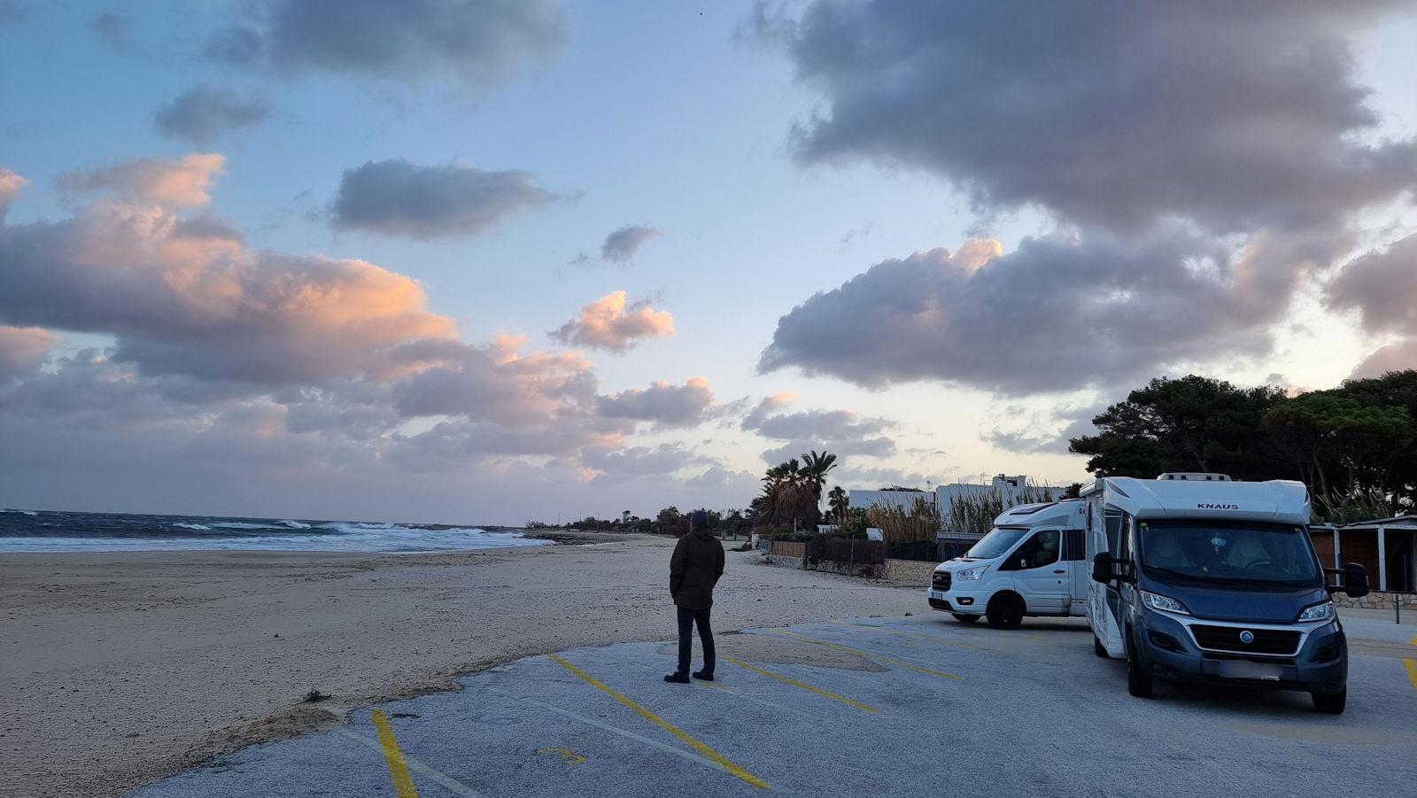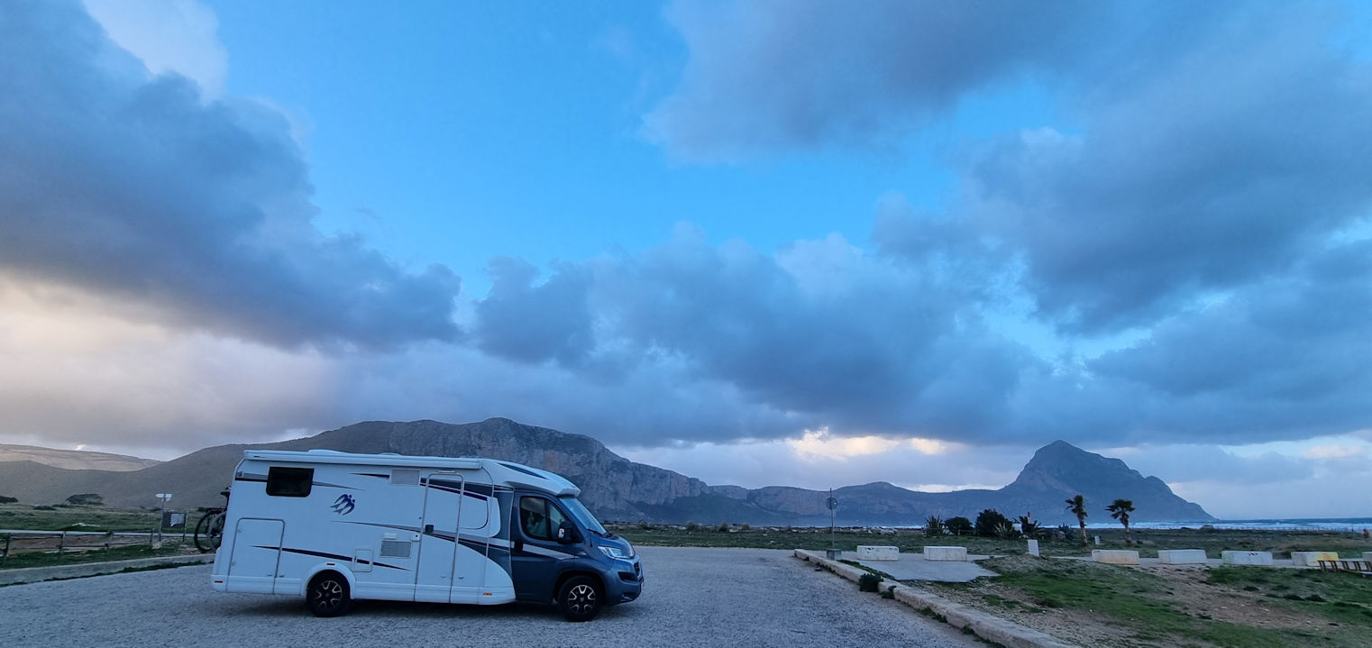 Wir passieren Palermo ganz entspannt und tatsächlich ist auch die Sonne wieder rausgekommen und es hat 15 Grad. Als wir die Ausfahrt Bagheria passieren, fällt Ulli ein, dass ja hier auch ein sehr schön oberhalb vom Meer liegender, kleiner Campingplatz sein soll. Und so biegen wir einfach an der nächsten Abfahrt ab und sind in Santa Flavia. Es geht in den kleinen Ortsteil Sant Elia und kurze Zeit später parken wir mit Traumaussicht auf das Meer auf dem Camping Olimpo ein. Es folgt ein Insalata di Tonno, lecker selbstgemacht mit unserem neu erstandenen Olivenöl und dazu ein fruchtiger Tropfen Sizilianischer Weißweins. Dazu Sonne…was will man mehr.