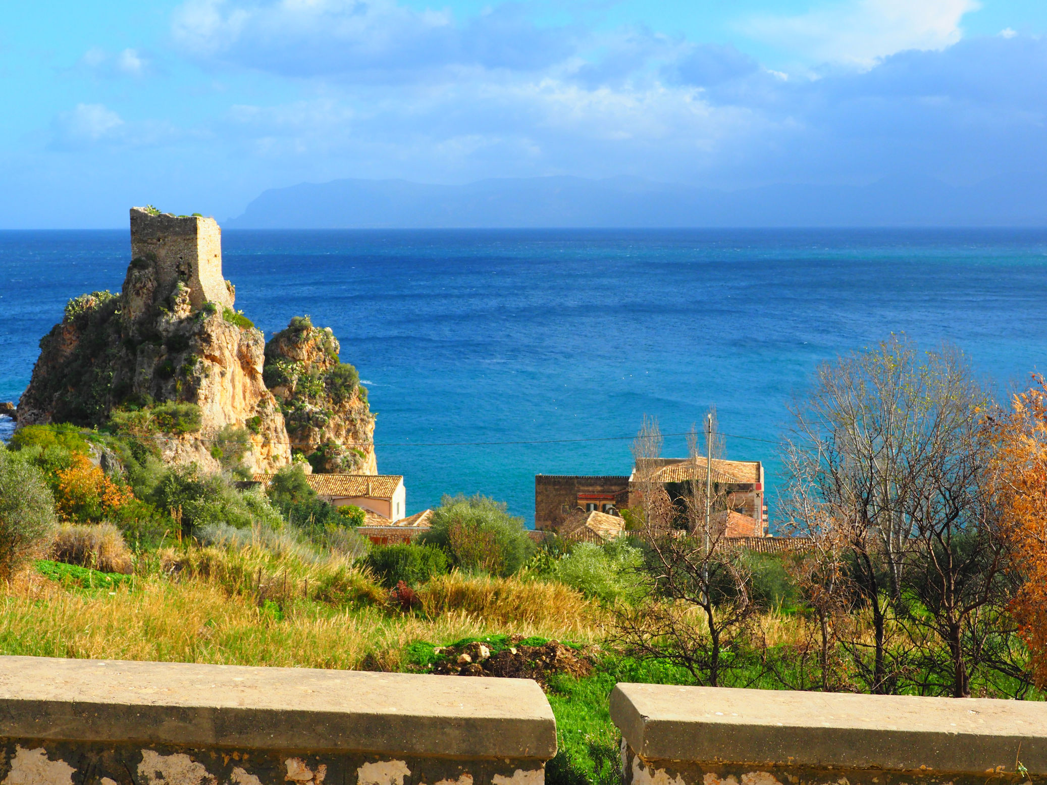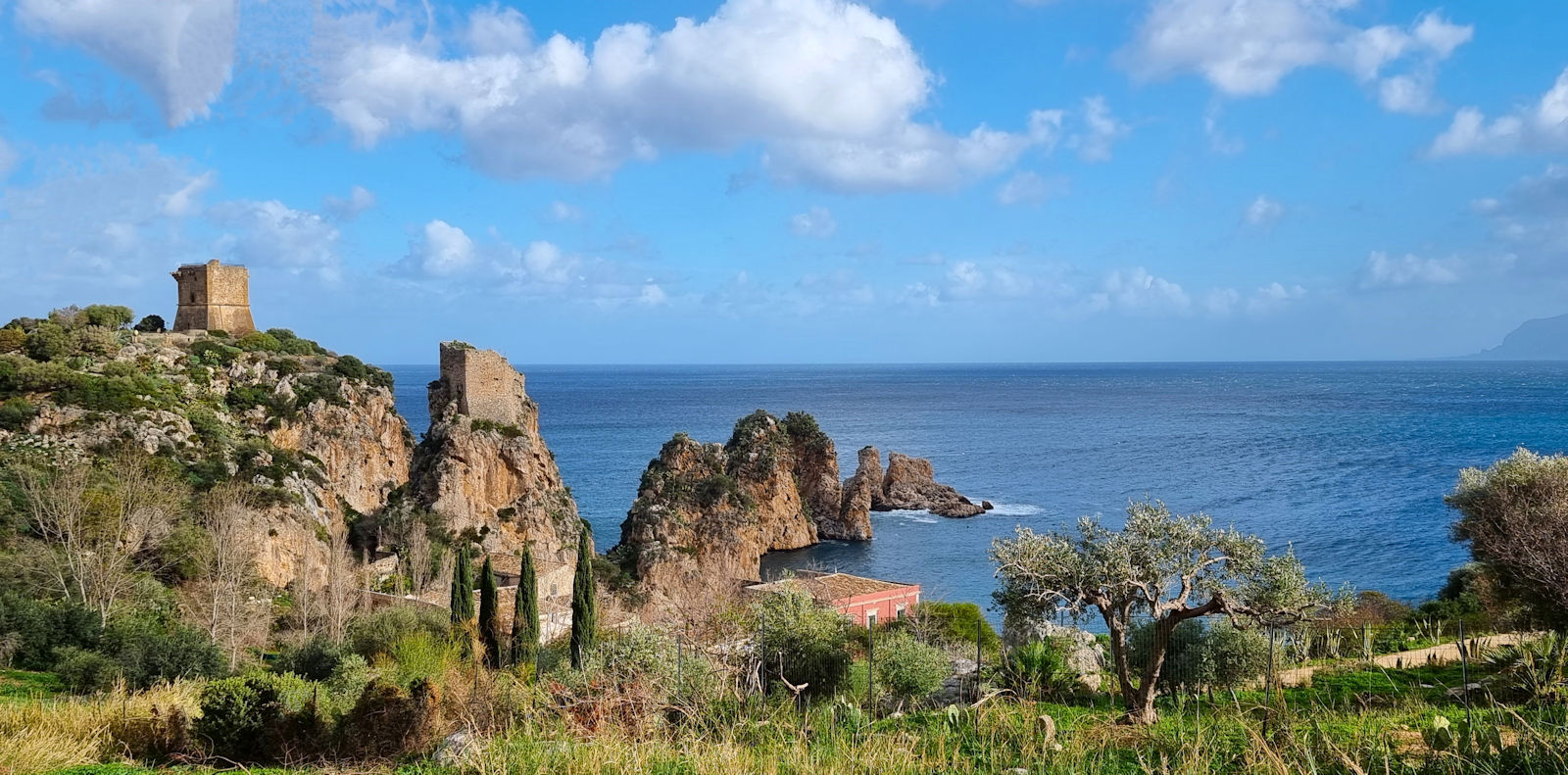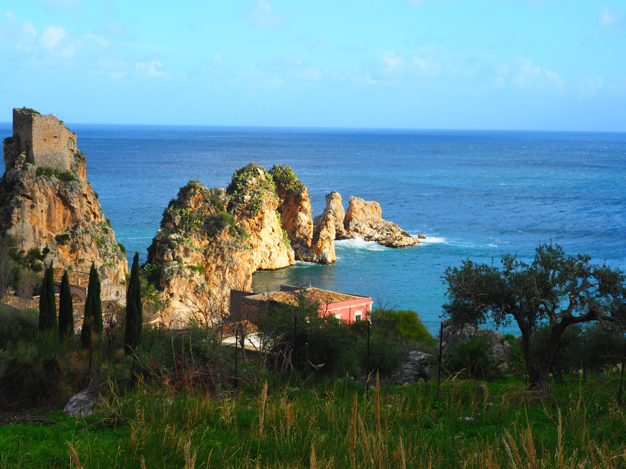 So entschließen wir uns, unseren Bialetti und ein kleines Frühstück hier einzunehmen. Auf dem Weg zur Hauptstraße durchfahren wir eine die Straße passierende Kuhherde, die mit ihren Hirten unterwegs ist. Im nächsten Ort erstehen wir ein lecker frisches Holzofenbrot und weiter geht unsere Reise vorbei an den vielen Marmorsteinbrüchen nach Scopello und der dort liegenden berühmten Tonnara und den davor aufragenden Felsen, den Faraglioni. Mit dem Auto ist die Straße nach unten einigermaßen zu schaffen, aber mit dem Womo sollte man das besser nicht versuchen. So entstehen einige Fotos von der höher liegenden Hauptstraße aus. Hiwr gat es Buchten ohne Wellen und türkisblau schimmerndes Wasser.