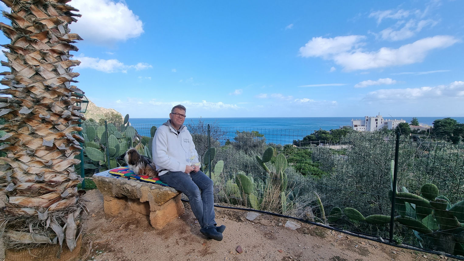 Wenig später erreichen wir den „Belvedere“ über der Stadt Castellammare del Golfo. Genau dort haben wir bei unsererersten Reise nach Sizilien vor 10 Jahren einige Tage verbracht. Schöne Erinnerungen werden wach wie z.B. der vom Eselswagen Schokoladenbonbons werfende Weihnachtsmann, die allabendliche Begegnung mit einem der „hohen Herren“ der Stadt, der sich anscheinend unsterblich in unsere Jule verliebt hatte. Alles schien darauf hinzudeuten, dass es sich um einen der Köpfe“ handelt. Der Herr war auffallend gut gekleidet, jeder der Einwohner verbeugte sich leicht vor ihm, und allen, denen wir in der kleinen Stadt begegneten, grüßten uns plötzlich auffallend freundlich. Uns als damals Sizilienneulinge. Auch hier ein Beweisfoto von damals: Ralf und unsere beiden Hunde Jule und Benjamin in Castellammare del Golfo auf der Mauer mit Blick auf den Hafen.
