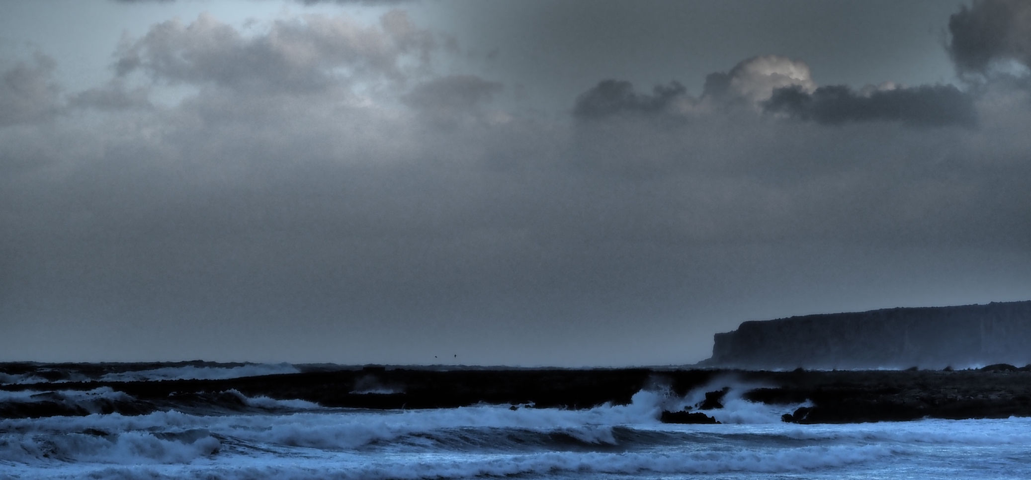 Es herrscht immer noch lautes Getöse, als wir gegen halb 8 aufwachen. Die gestern noch fast glatte Bucht hat richtig hohe Wellen, 9der Wind schüttelt unser Womo immer wieder durch und die Wolken haben etwas Bedrohliches. Und wir stehen ganz alleine hier. Alle anderen Womos haben scheinbar die Flucht ergriffen. Der Wind hat die riesigen Seen auf der Straße einfach aufgesaugt und so haben die Fellnasen ein trockenes Gassi am heutigen Morgen.