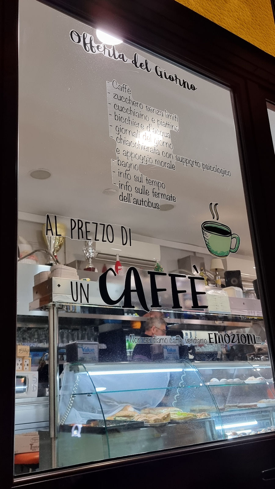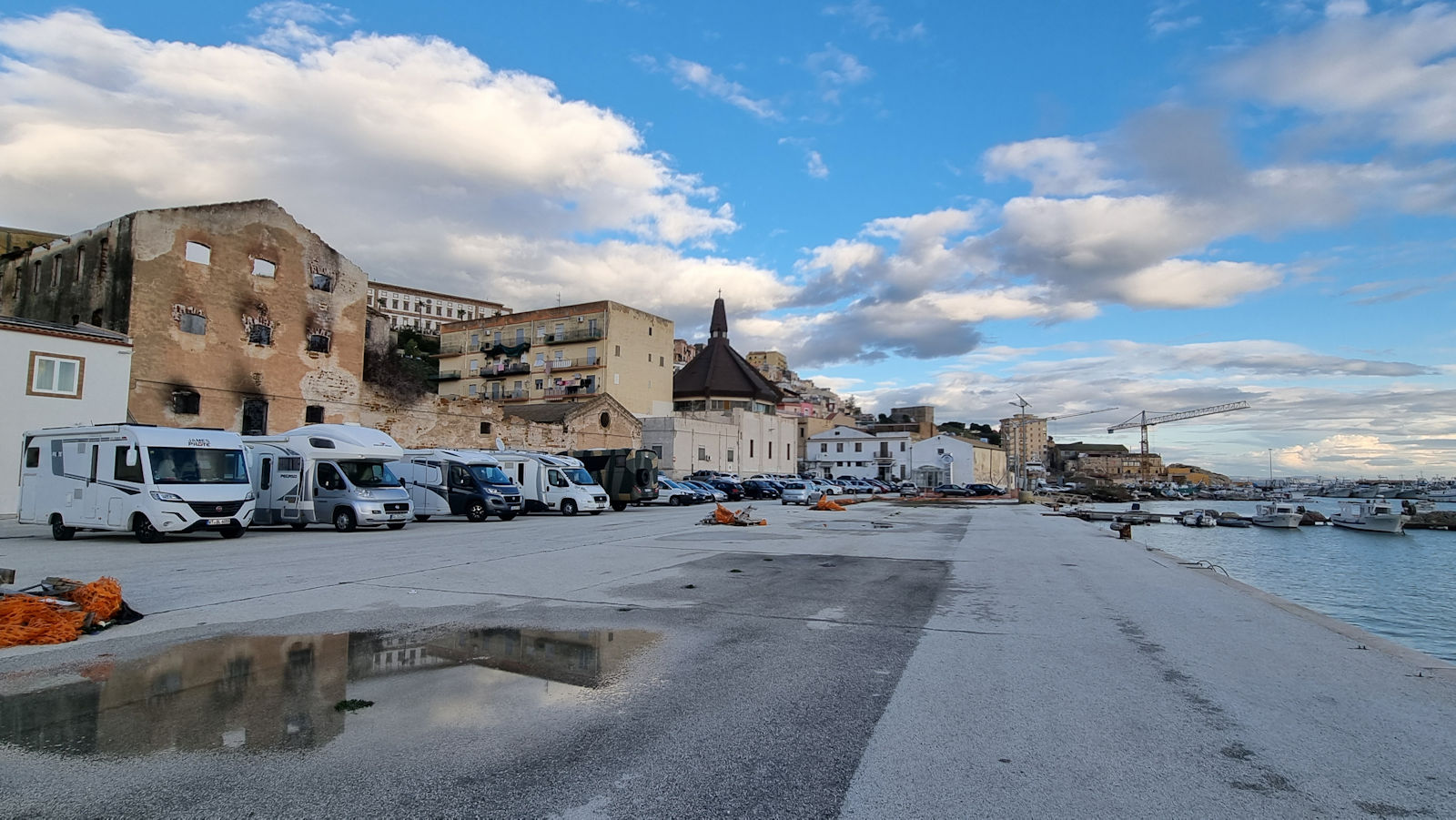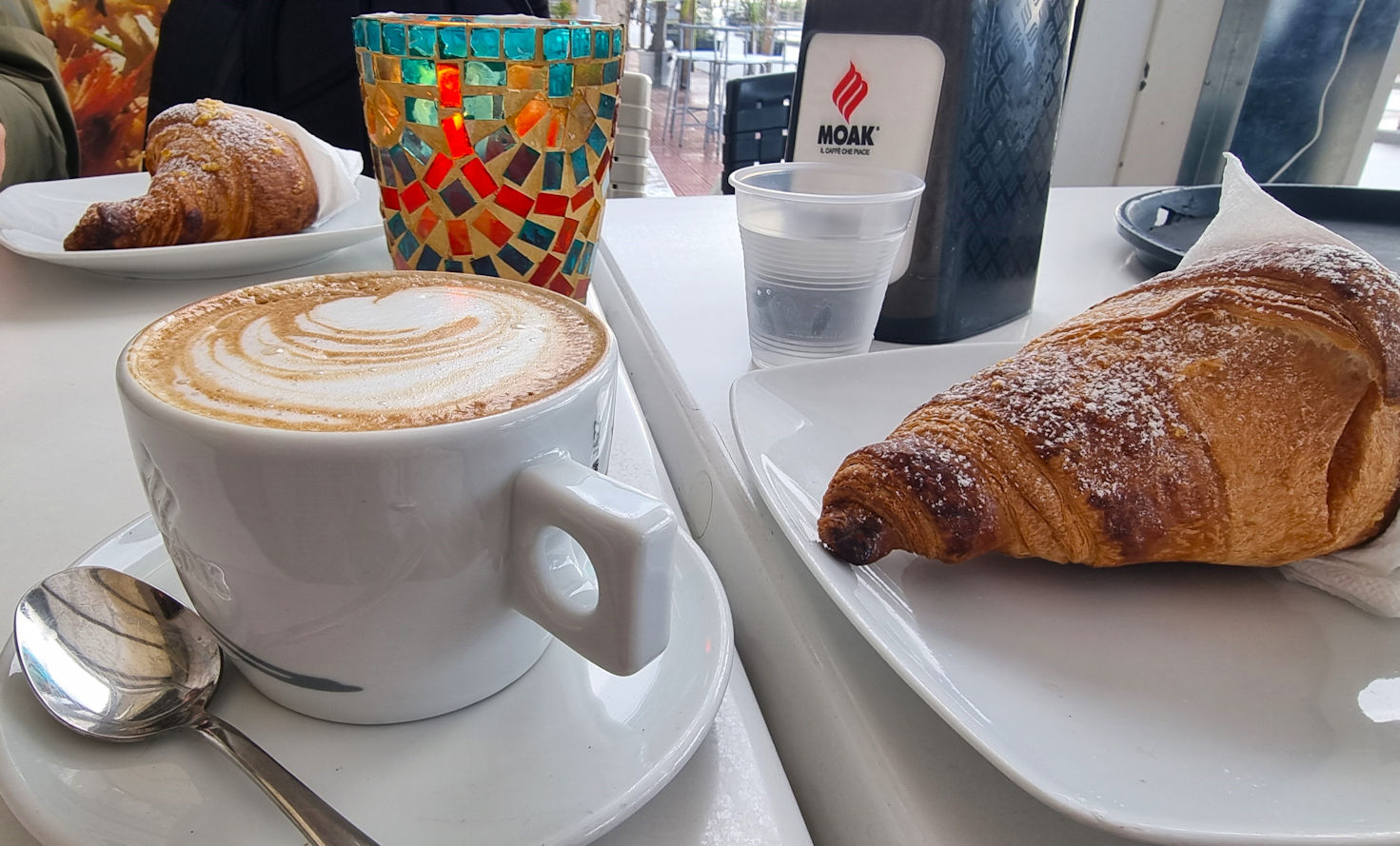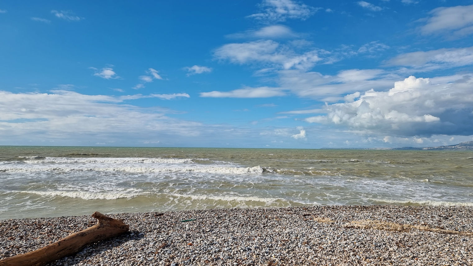 Hat es tatsächlich gestern Abend so stark geregnet? Der Sonnenaufgang heute Morgen ist so wunderschön, dass man das fast nicht glauben kann. Aber es sind überall noch große Pfützen zu sehen. In der Bar gegenüber genießen wir unsere Cornetti und dazu Cappuccino. Ralf hat für Ulli ein Kerzchen mitgebracht, was die Neugier der netten Bedienung weckt. Ja, es ist Ulli’s Geburtstag. Nuccia, die nette Bedienung, gratuliert ganz herzlich und so beginnen die beiden ein sehr nettes Gespräch. Was für ein schöner Start in den Tag.