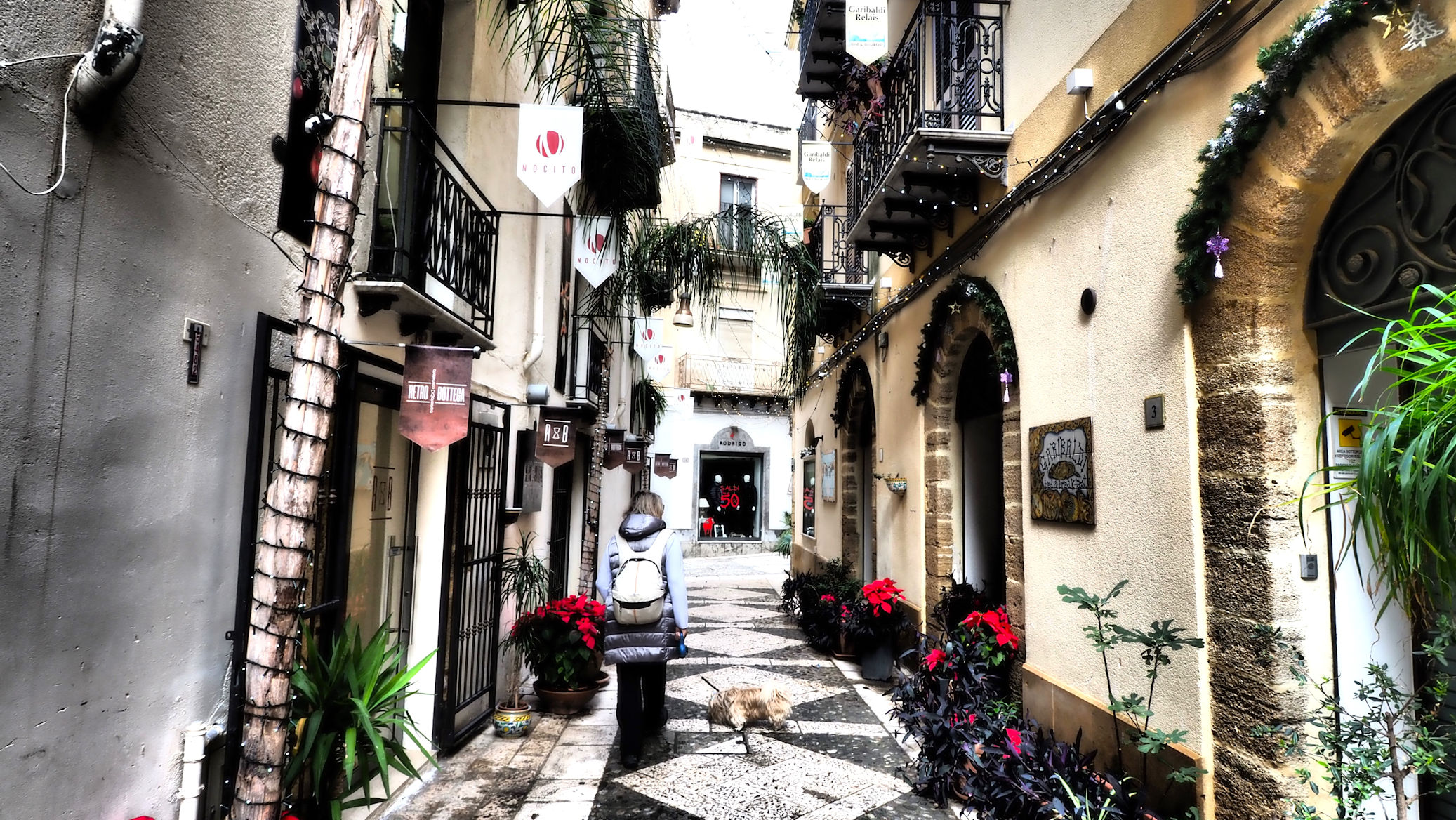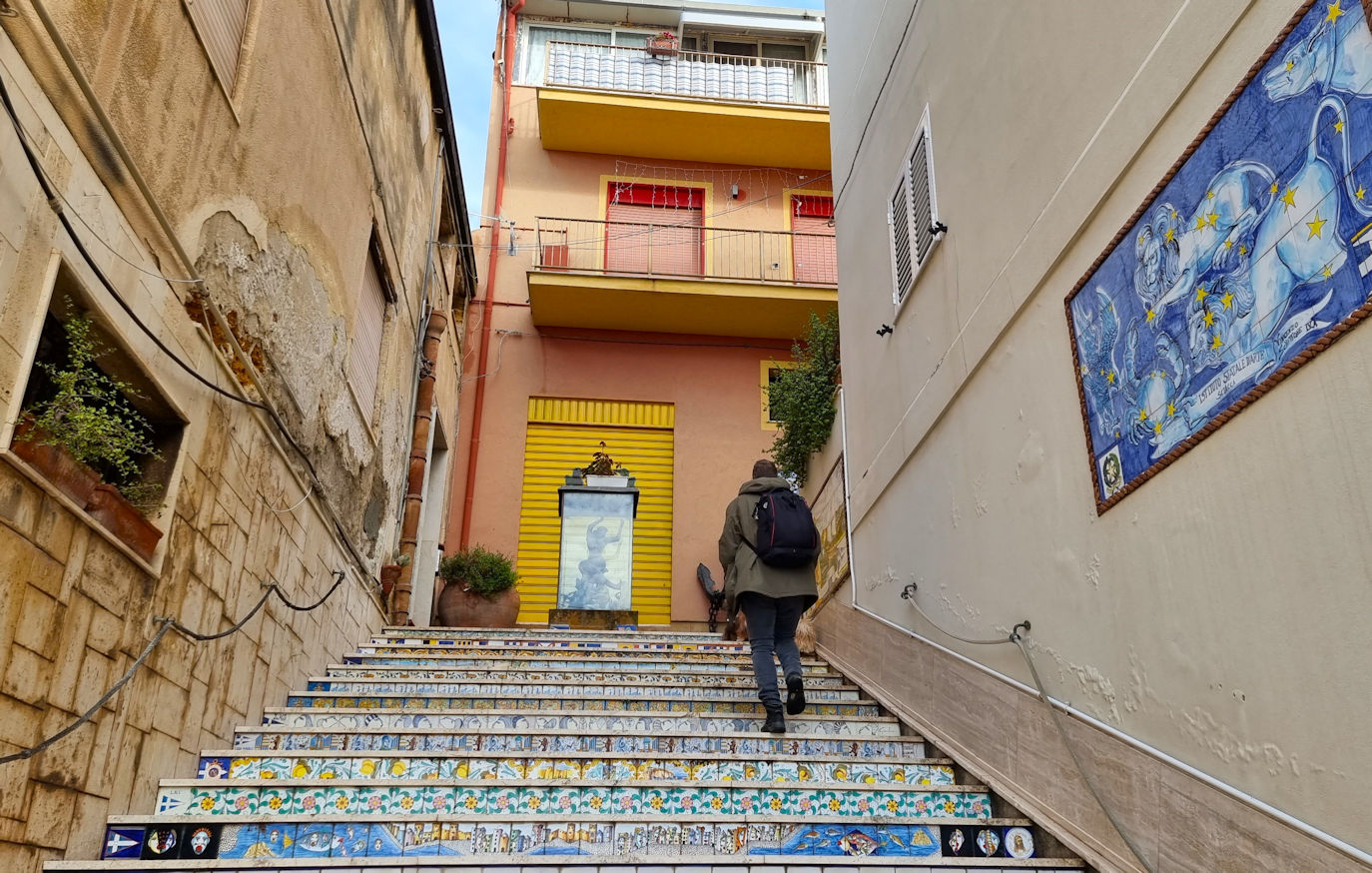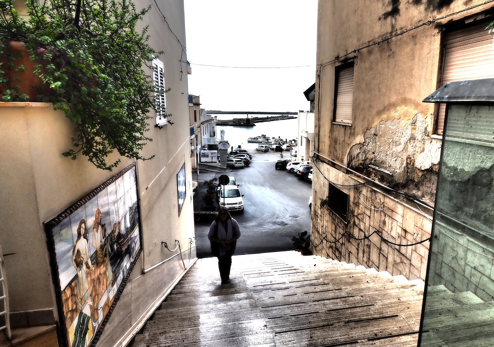 Bei strahlendem Sonnenschein parken wir am Fischereihafen ein. Die Pfützen bieten sich als mit ihren Spiegelungen als Fotoverschönerung an und kurze Zeit sind wir auf den schön verzierten Treppen auf dem Weg in die Stadt. Für uns eine der schönsten auf unserer Tour. Die Leute sind nett und trotz Ende der Weihnachtszeit, ertönen über die Lautsprecher Weihnachtsklassiker wie White Christmas und Feliz Navidad.
