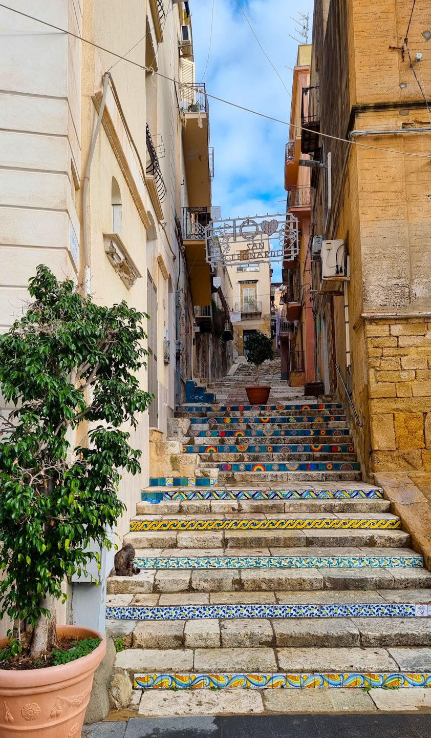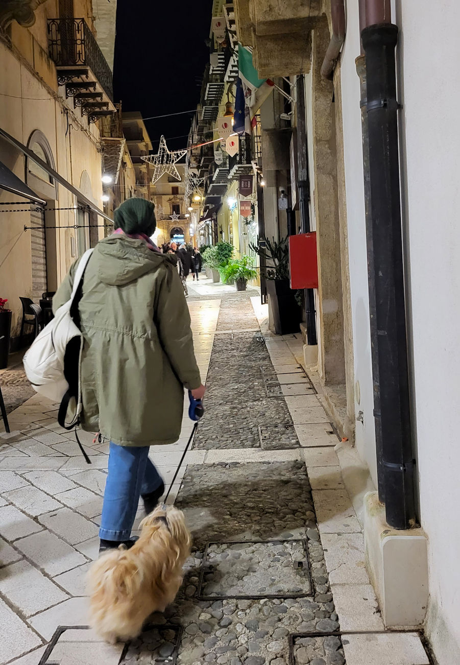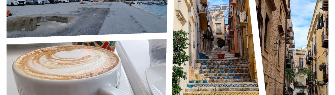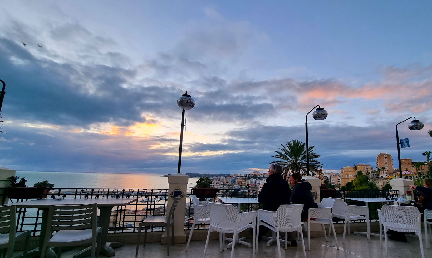 Für unseren Abendaperitivo parken wir erneut am Fischereihafen ein, machen uns schnell stadtfein und sind auch schon unterwegs. Wir stoppen zum Sonnenuntergang am Aussichtscafe an der Hauptpiazza, dann am Treff der Einheimischen in „unserer Loge“ und landen zum Abschluss im Pipercafe, dem Treffpunkt für die in Sciacca lebenden Deutschen. Eine tolle Bar, ein netter Plausch mit der Chefin…ein fast schöner Tag geht zu Ende.