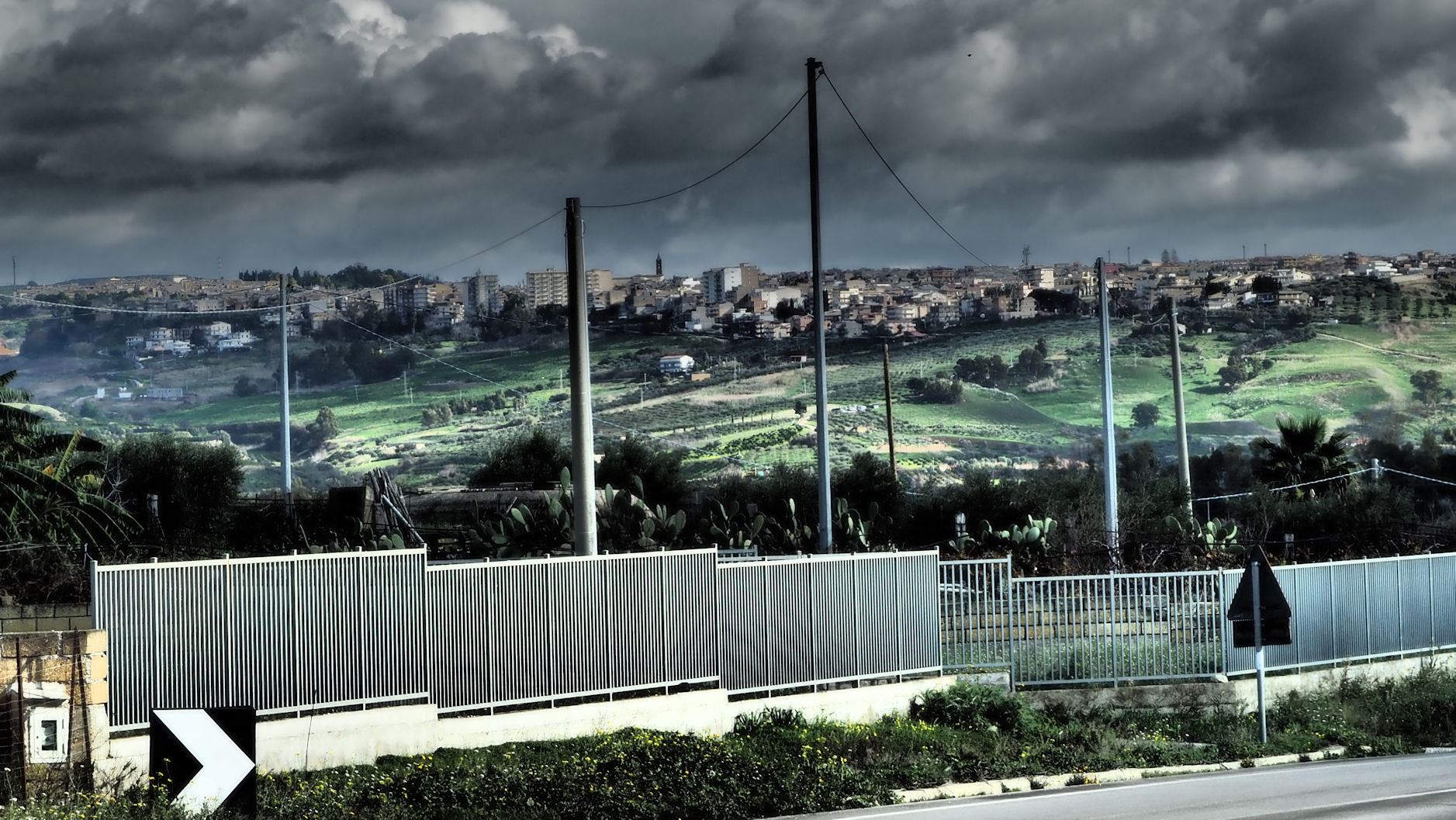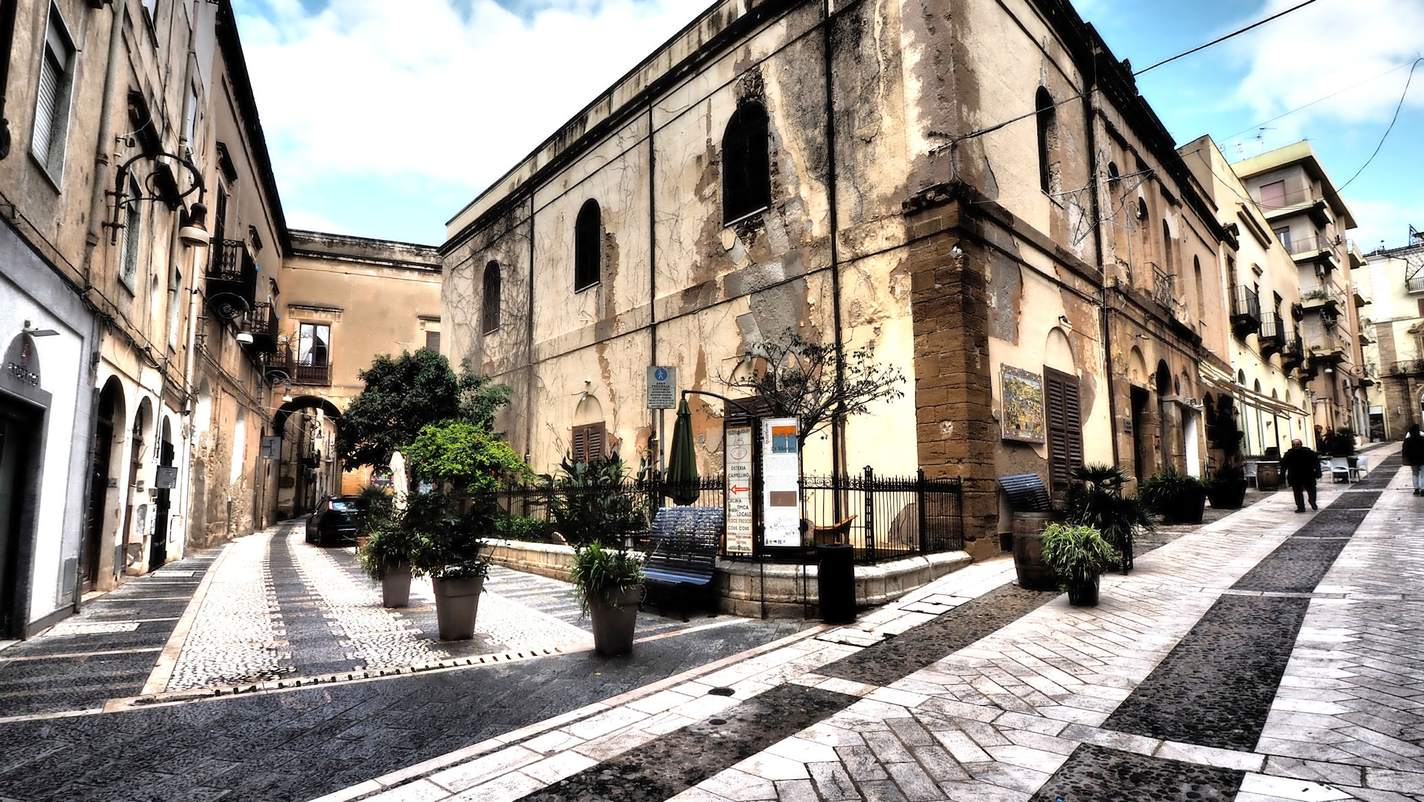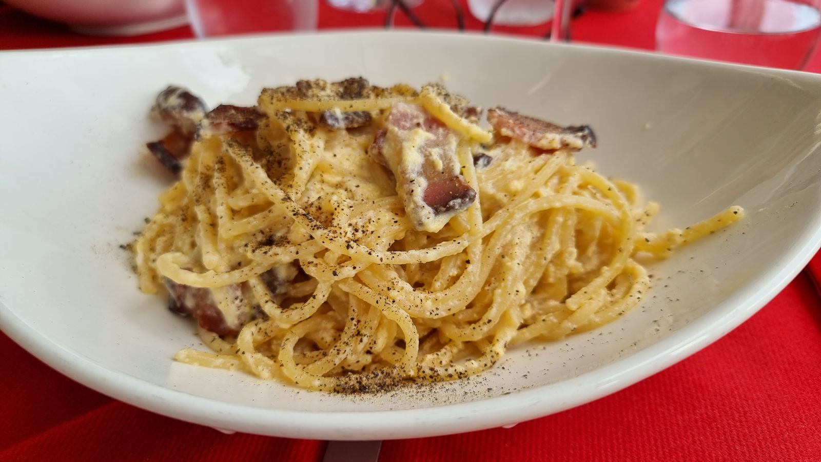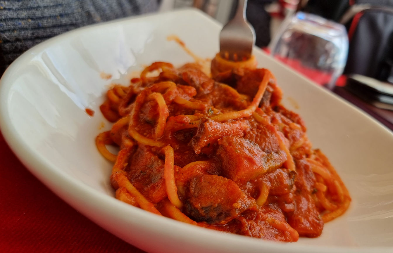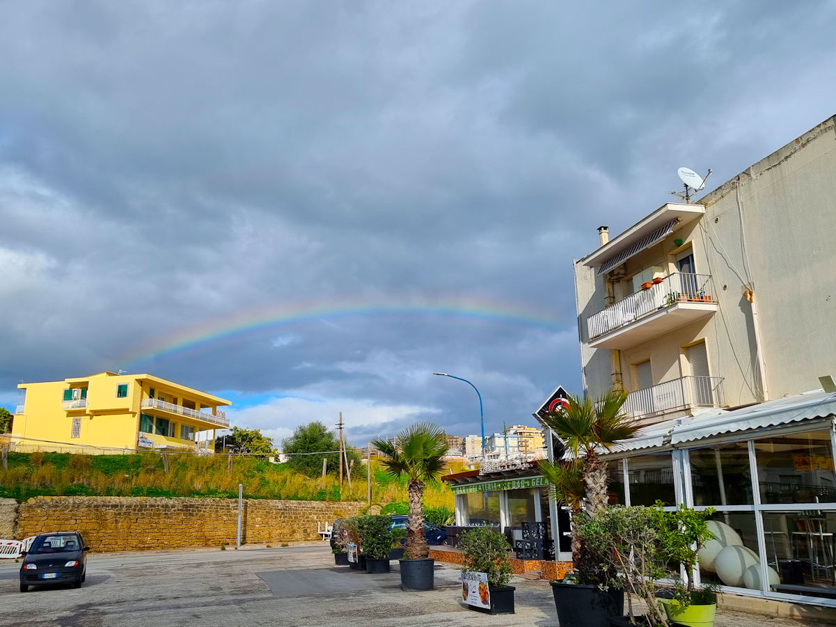 Wir schlendern noch ein wenig durch die Stadt und fahren kurze Zeit später los, um den Tag am Strand zu verbringen. Den ersten Platz, den wir anfahren, verlassen wir wegen des starken, kalten Windes nach kurzer Zeit wieder. Am nächsten Platz beginnt es direkt bei unserer Ankunft aus einer einzigen schwarzen Wolke zu regnen, ja eher zu schütten. Bevor sich der Boden endgültig zu einer unüberwindbaren Schlammmasse verwandelt, fahren wir wieder zurück zu unserer Frühstücksbar nach Sciacca. Hier scheint die Sonne scheinbar immer noch und der Himmel hat als kleine Entschädigung einen Regenbogen zu bieten. Es ist bereits 2 Uhr. So sitzen wir kurze Zeit später bei Carbonara und Amatriciana in der Sonne und genießen den Nachmittag.
