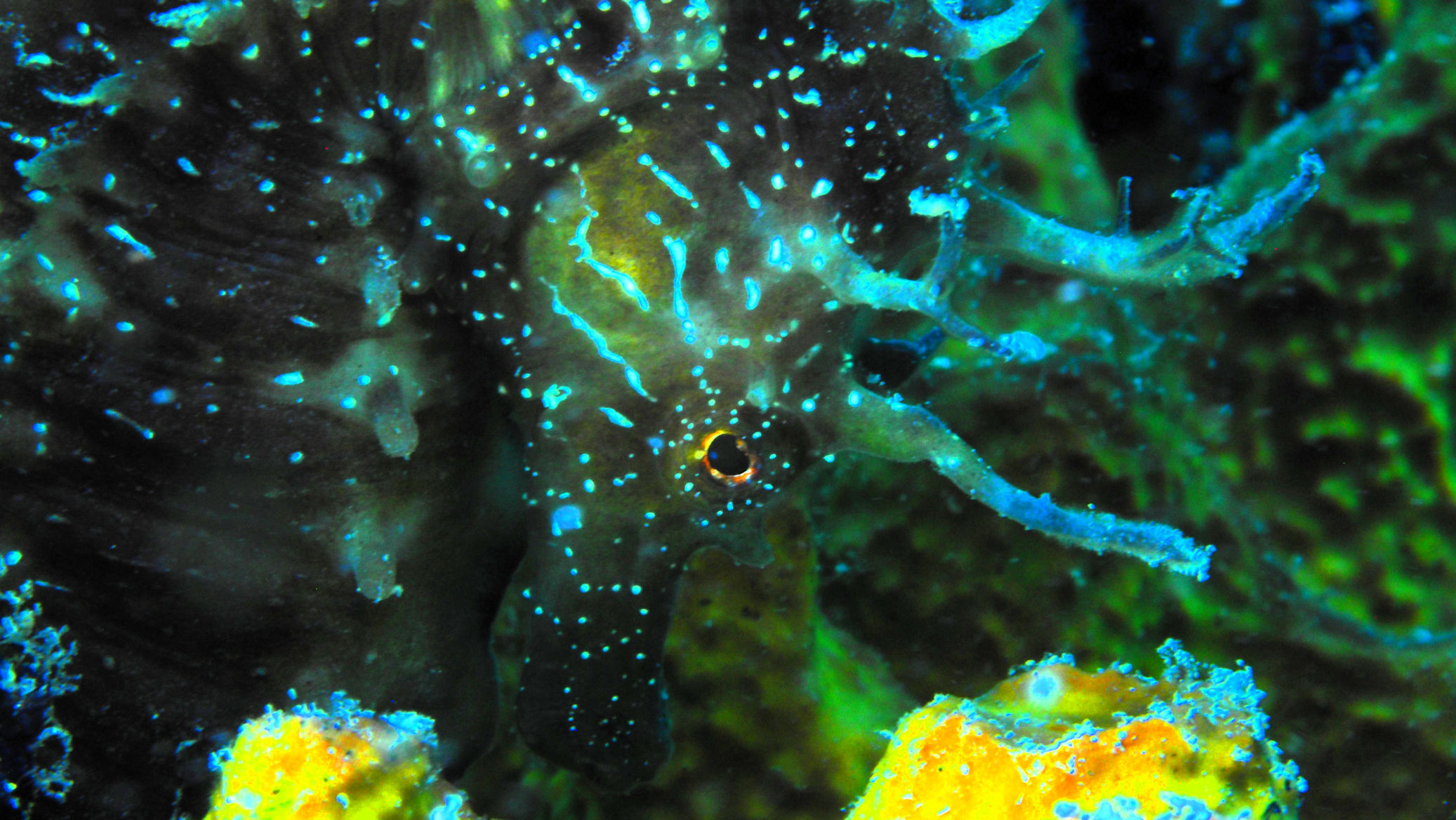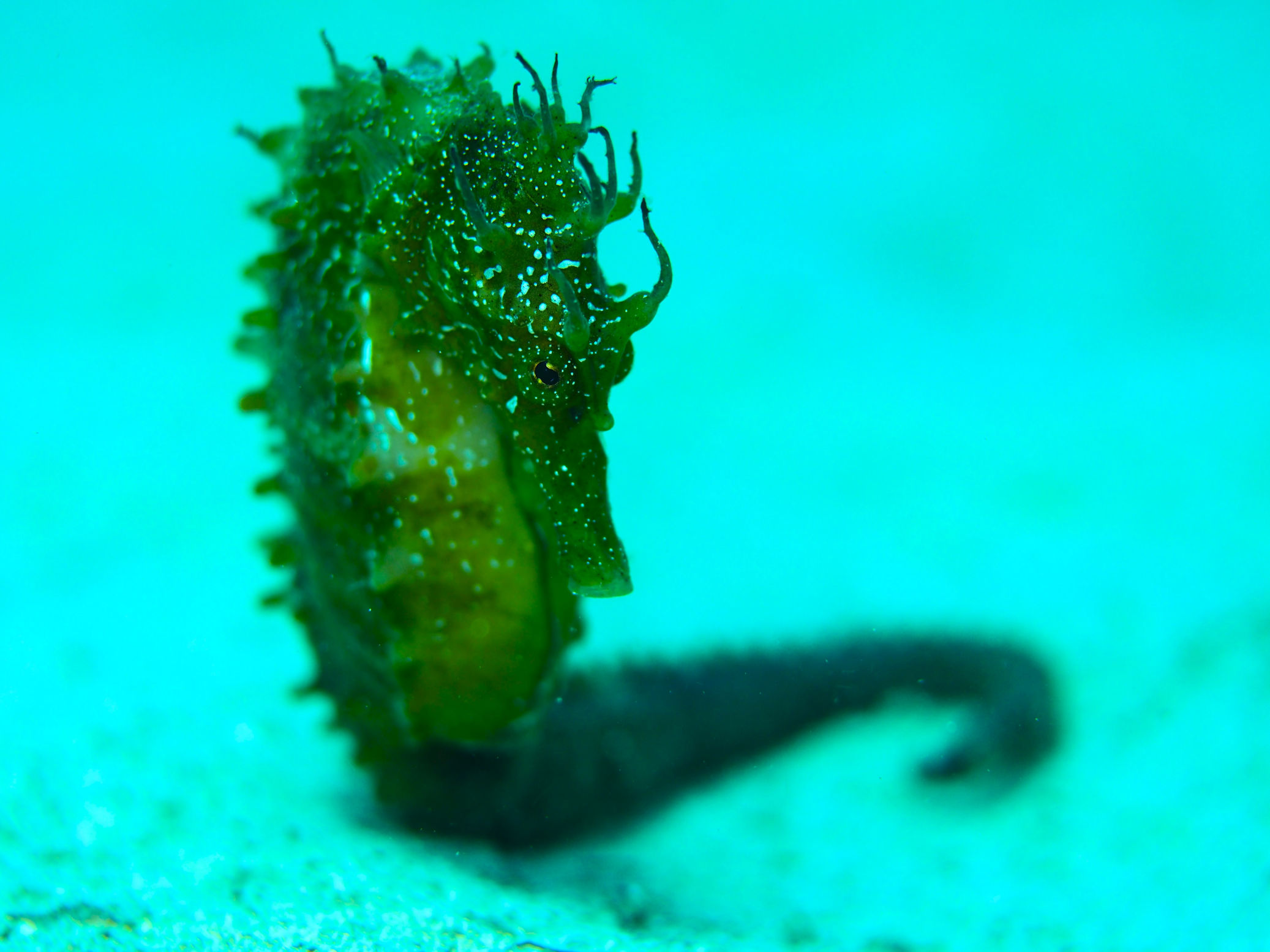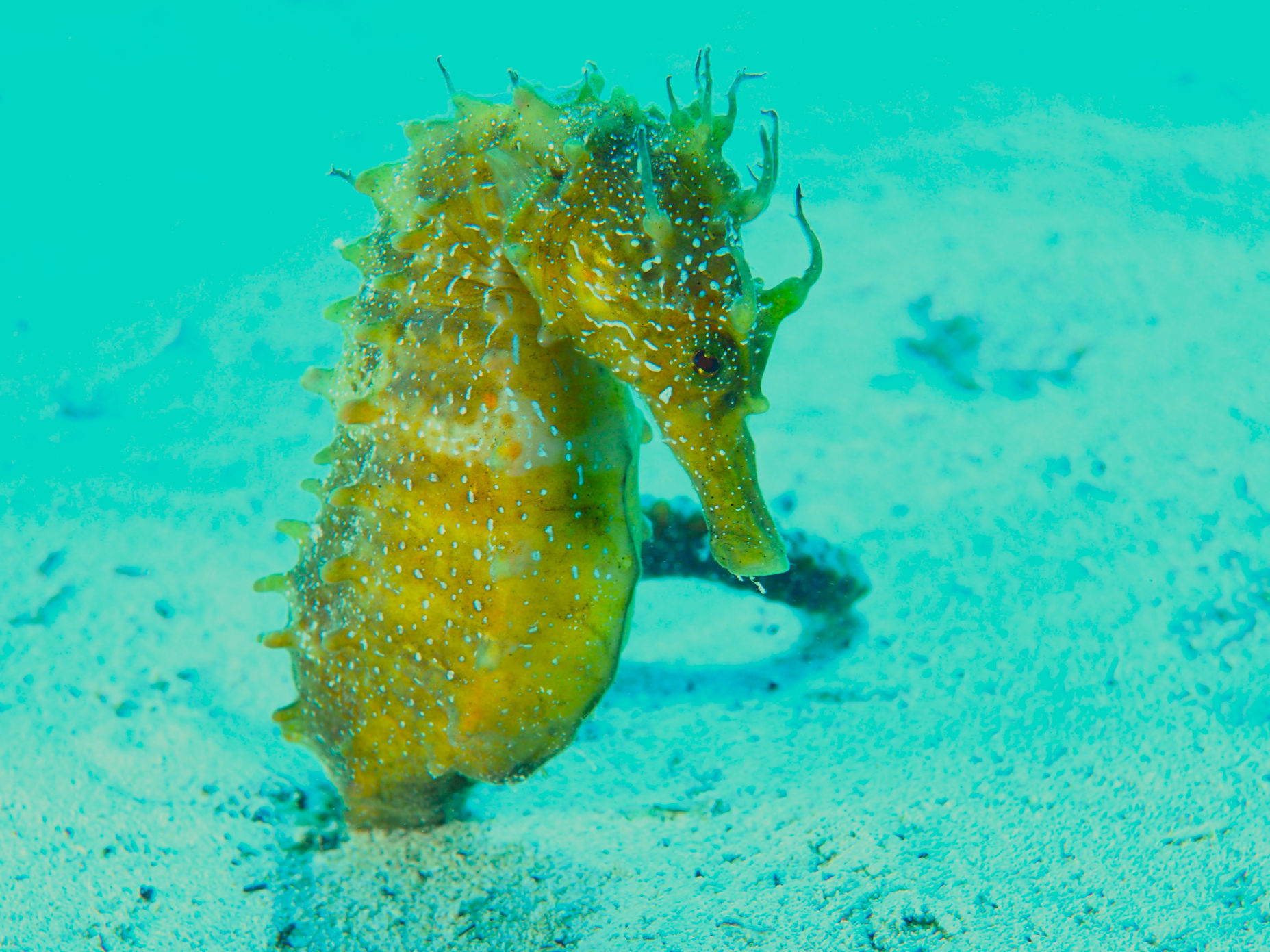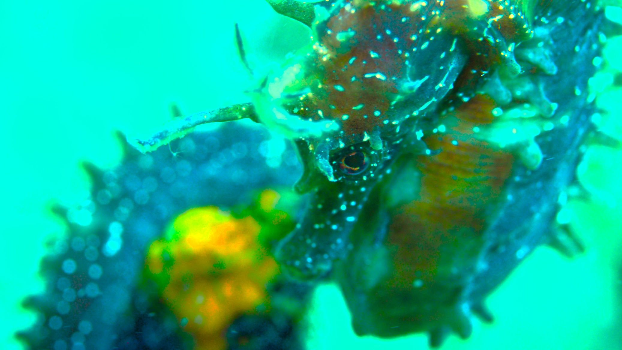 Zu Beginn recht langweilig, finden wir nach etwa 25 Minuten Tauchzeit ein braunes Seepferd im gelben Schwamm. Einen größeren Gefallen hätte uns das Tier nicht tun können. Denn so ist ausreichend Kontrast fürs einfachere Kamerahandling da und es entstehen einige wunderschöne Aufnahmen.
