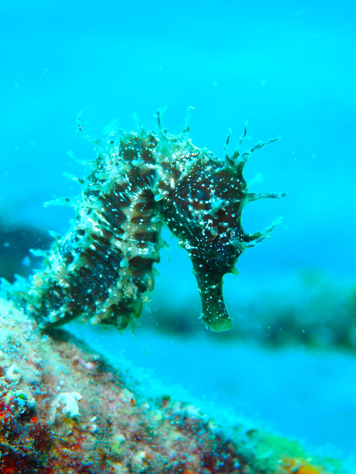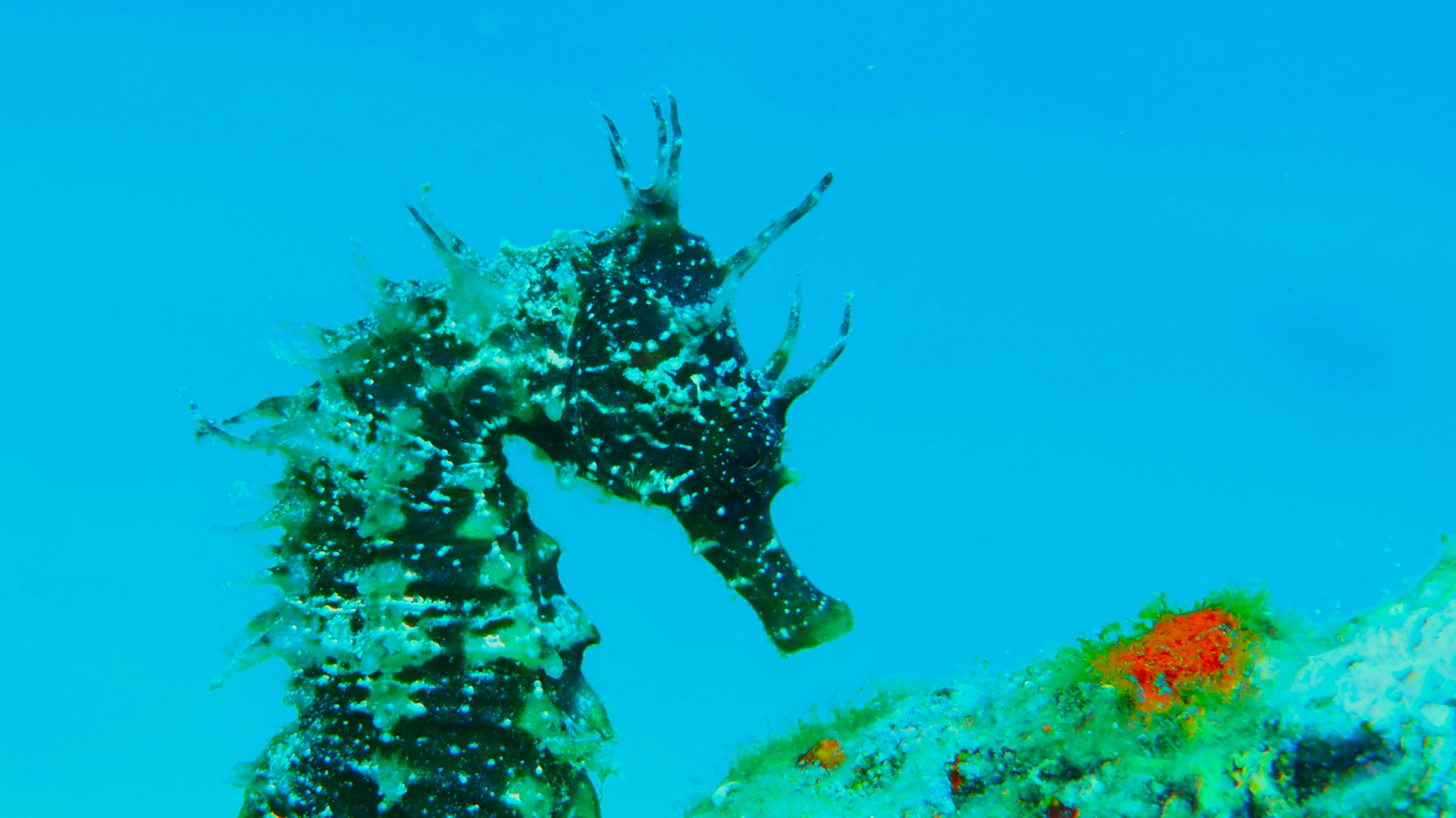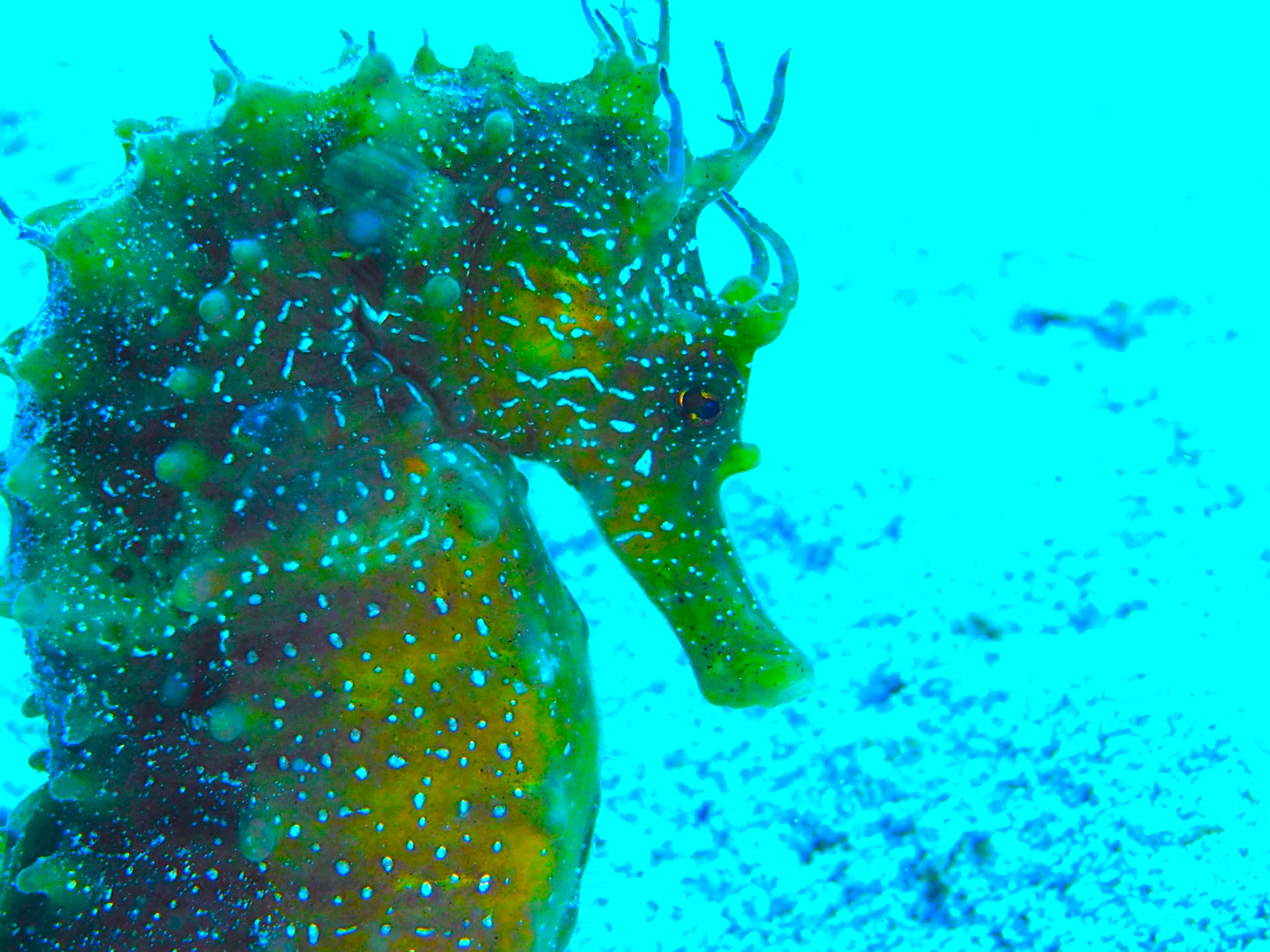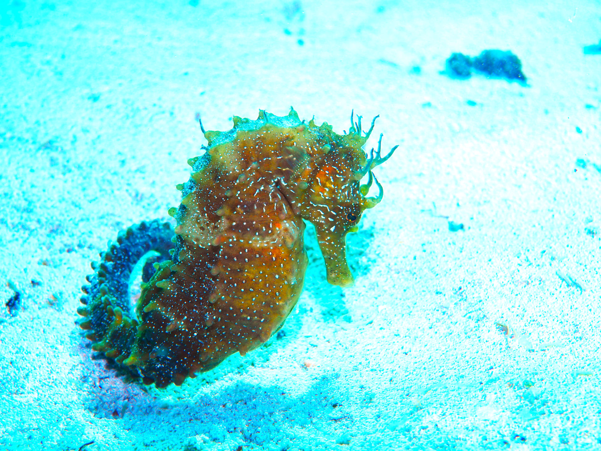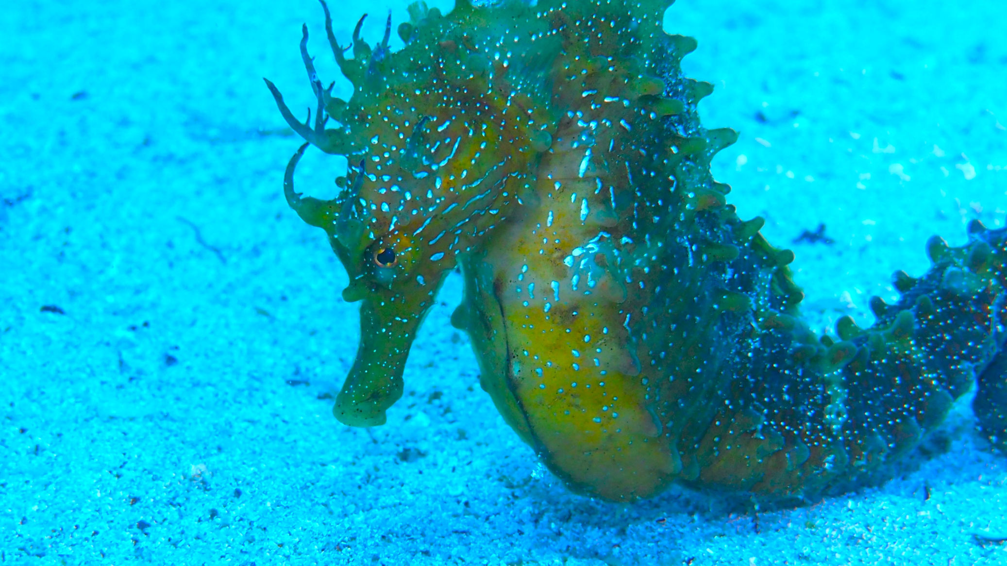 Unser Equipment steht ebenso draußen bereit wie die beiden 12er Pressluftflaschen. Nur kurze Zeit später sind wir schon unter der Wasseroberfläche auf der Suche nach den kleinen Schönheiten. Wir suchen sie nicht wirklich: die Seepferde…doch heute begegnen wir wieder zwei anderen als gestern. Ein dunkleres am Stein angeschmiegt, ein brauner Seepferdteenie mit dem Schwanz an ein Metallrohr angeringelt und das gelbe von gestern, das immer wegschwimmt, wenn sich Blubberblasen nähern.