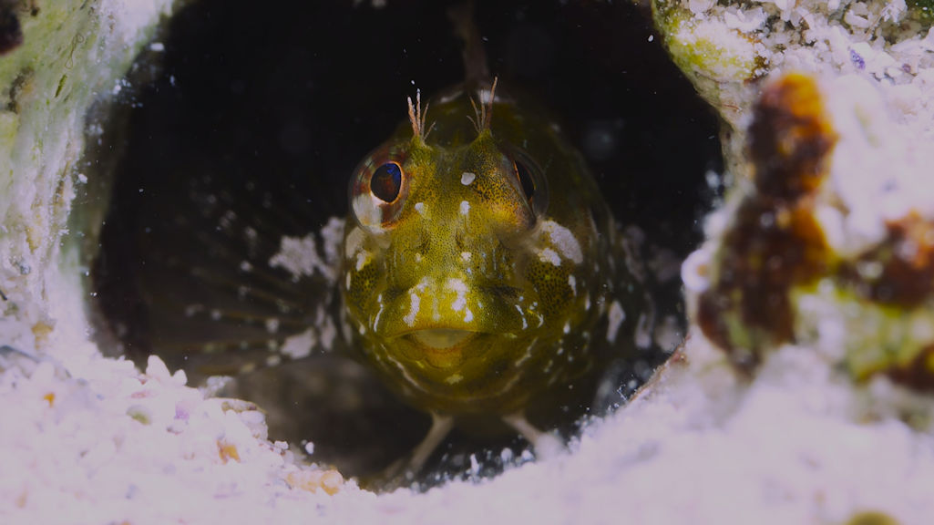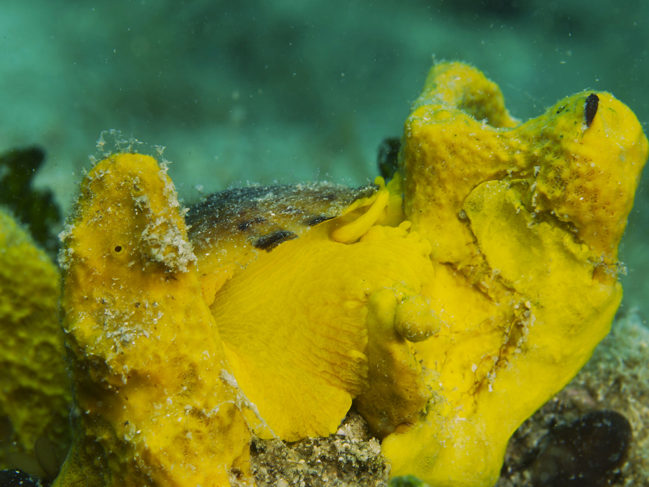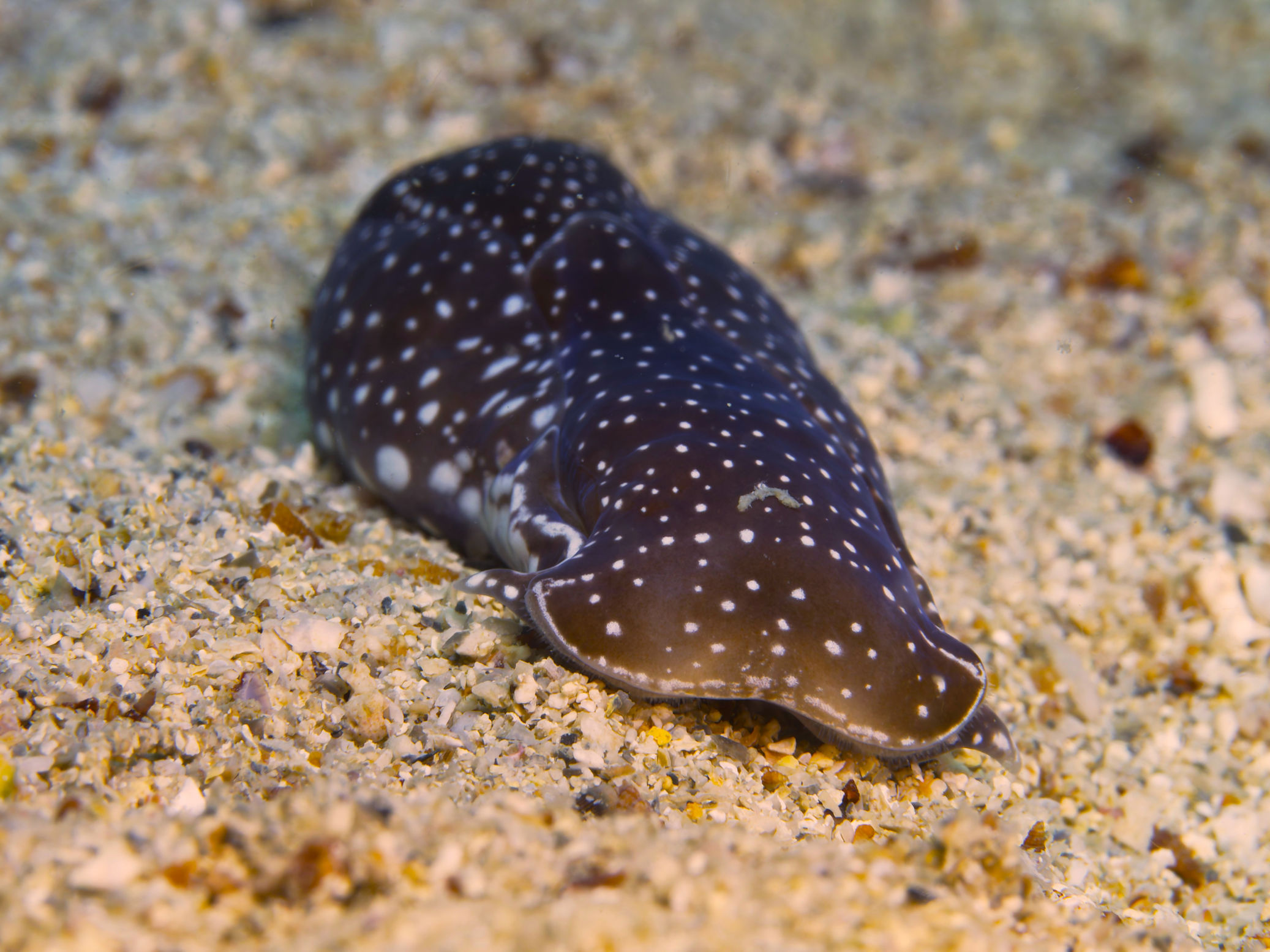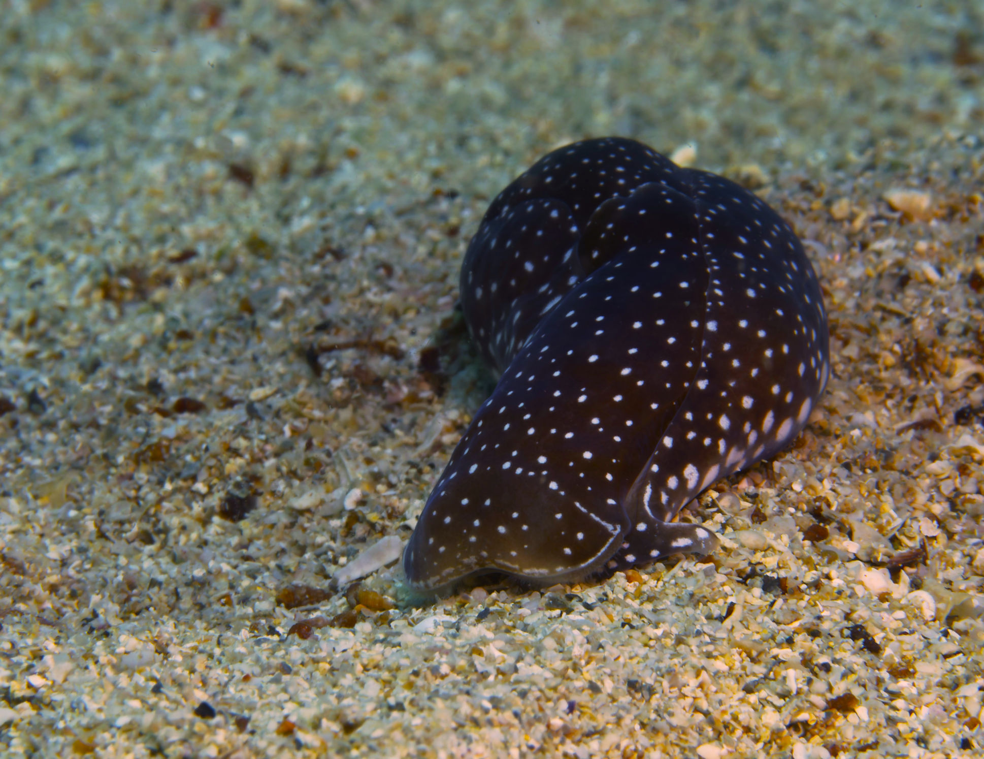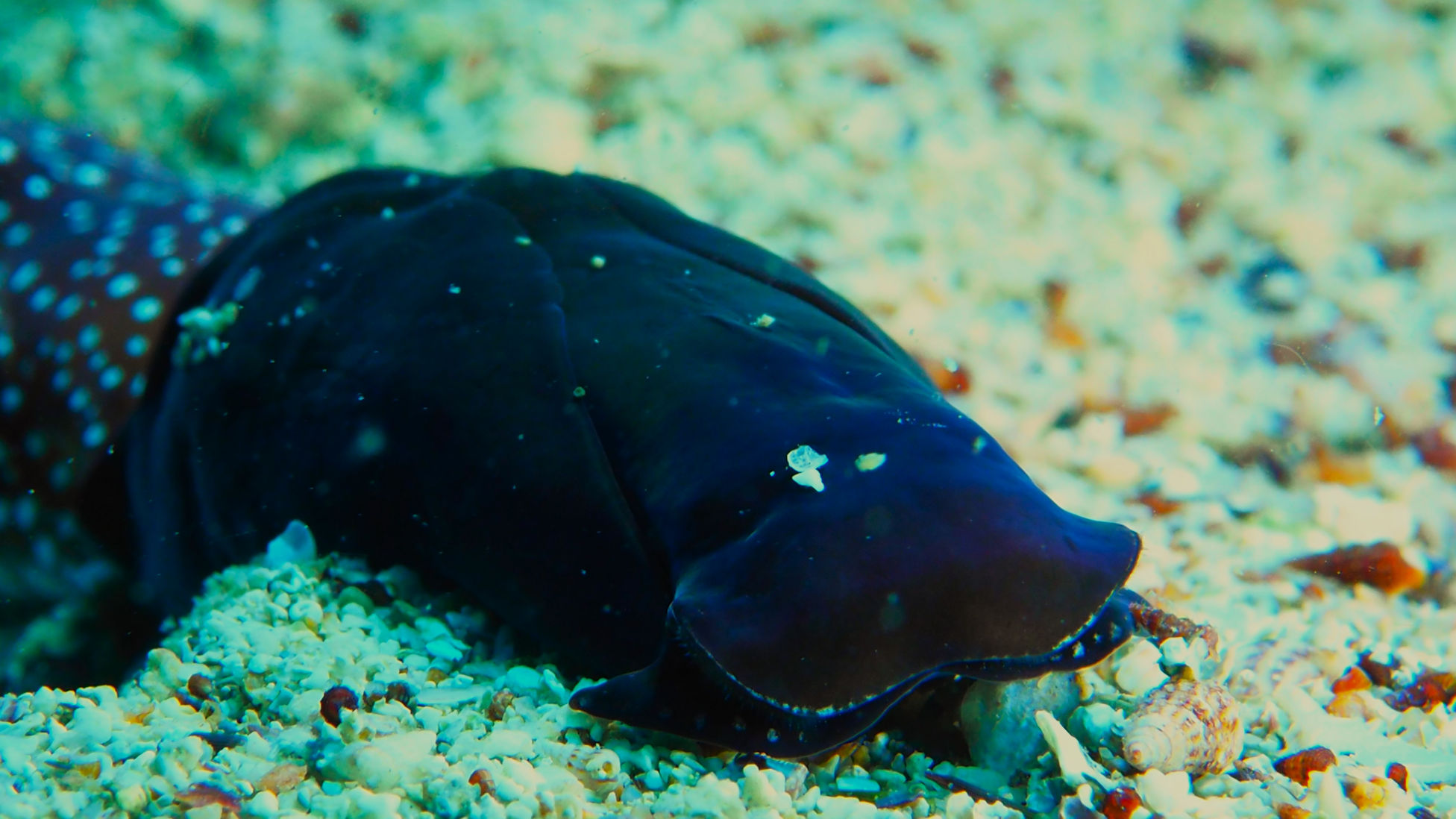 Und auch bei diesem Tauchgang begegnet uns alten Tauchhasen eine Mittelmeerpremiere. Eine Kopfschildschnecke in braun mit beigefarbenen Punkten und eine blauschwarze Artgenossin. Das Verhalten dieser beiden Exemplare und der Fund anderer Tiere in der gleichen Tiefe lassen auf die Paarungszeit dieser Tiere schließen. Jedenfalls haben wir diese Schnecke bis dato noch nie gesehen und finden sie weder abgebildet im Netz noch im speziellen Mittelmeerschneckenbestimmungsbuch.