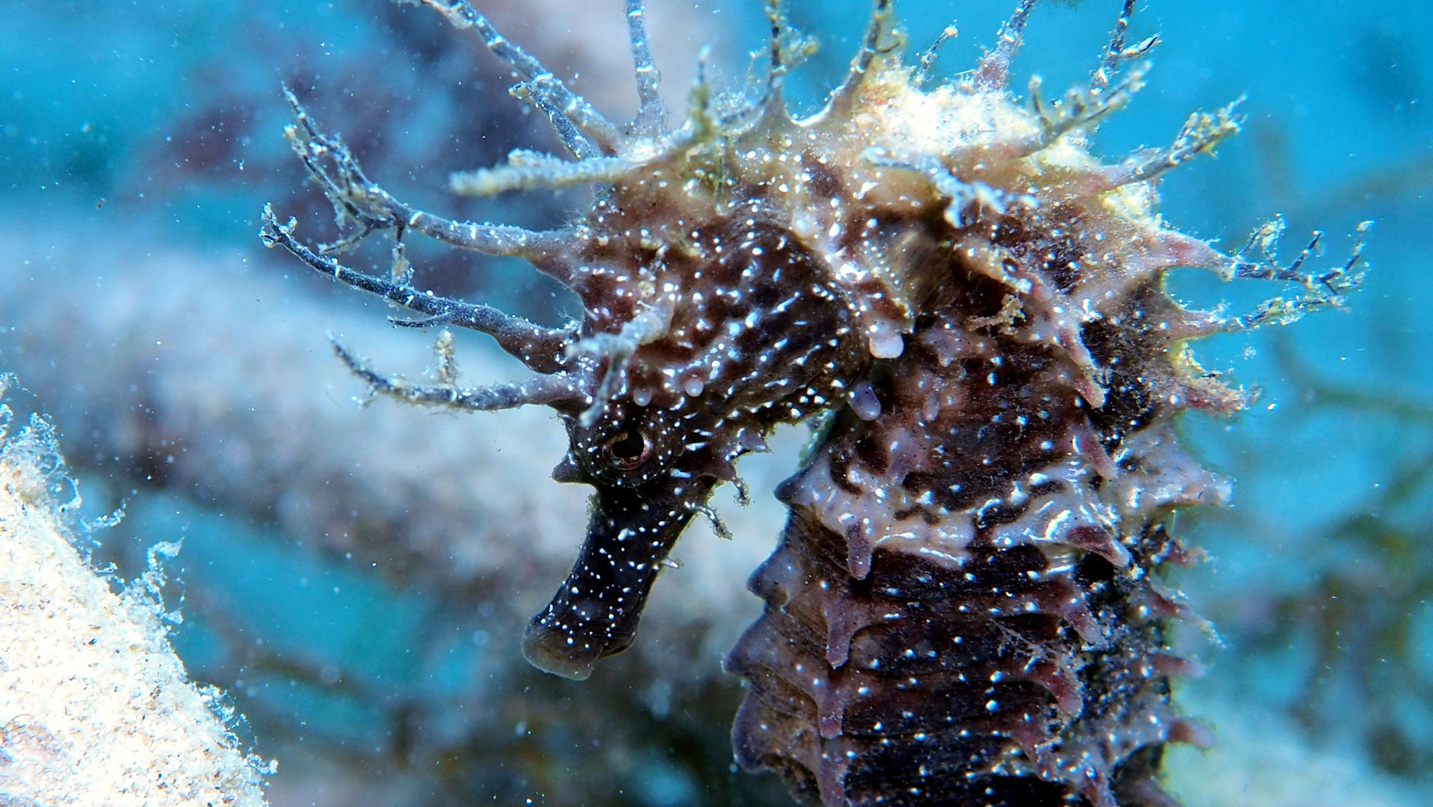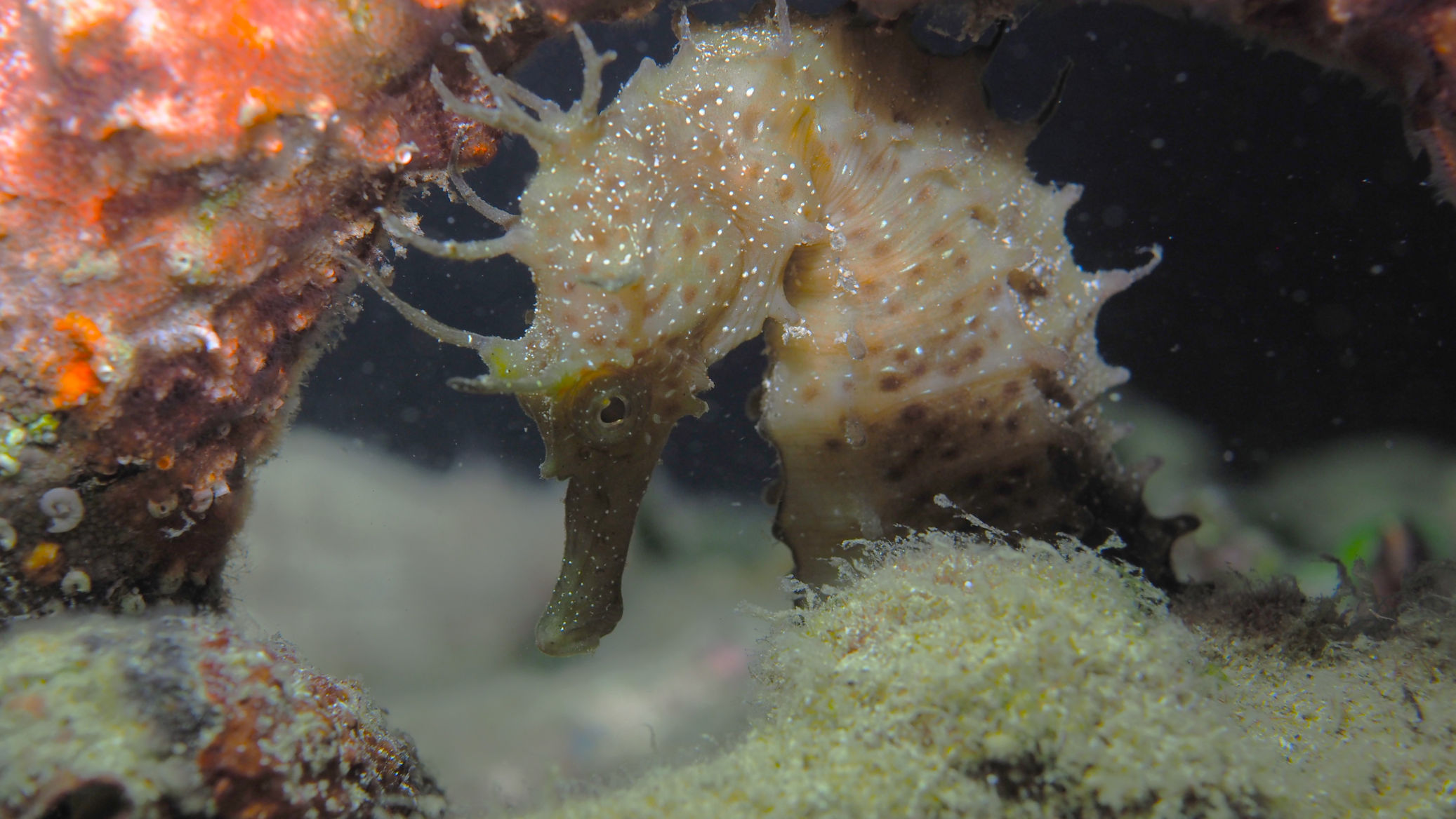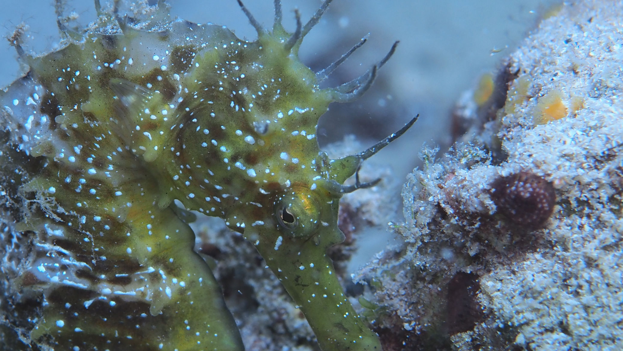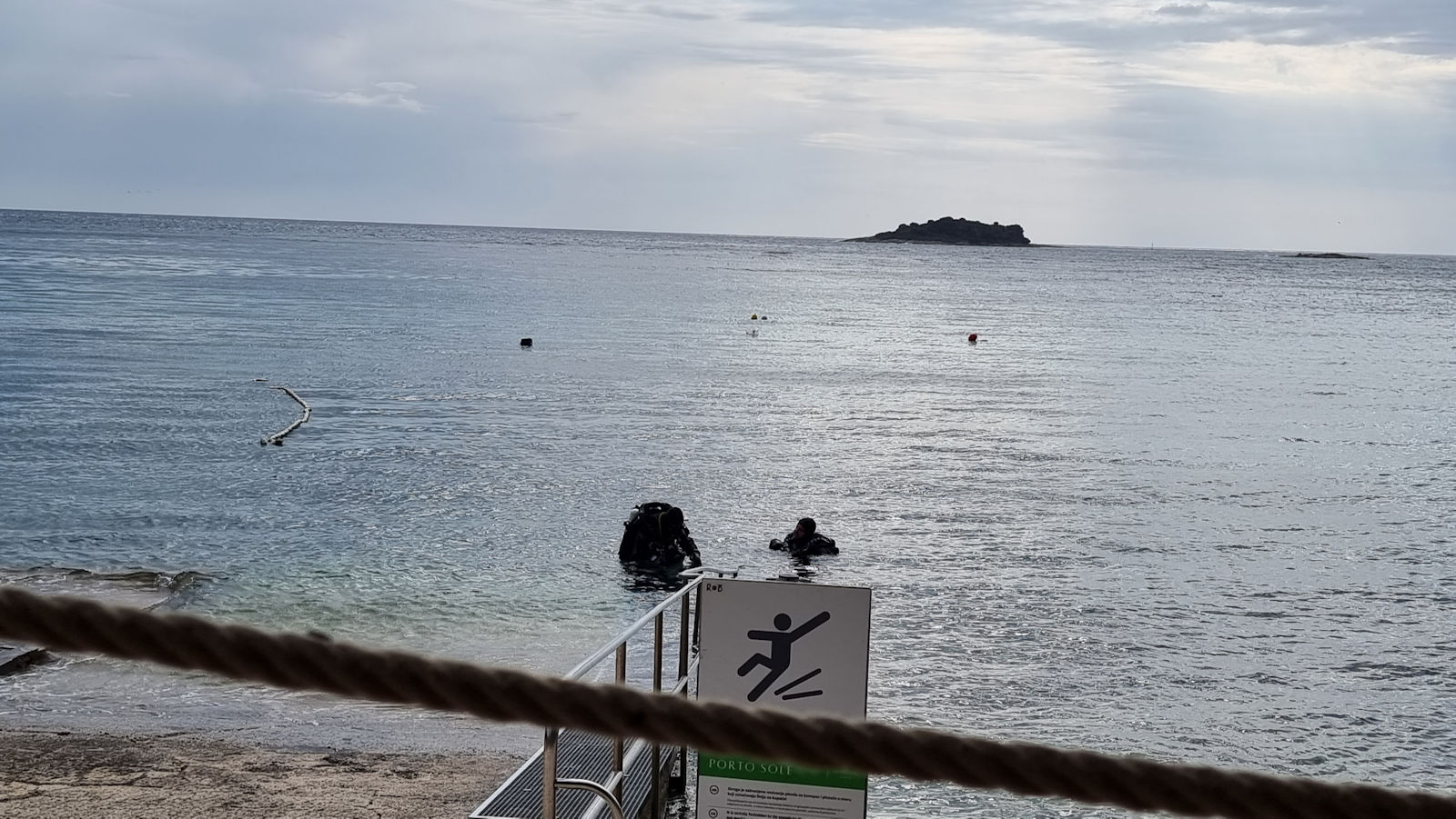Heute morgen ist es auf jeden Fall kurz von oben trocken. Die Welle steht recht ungünstig auf der Bucht, was den heutigen Tauchspaß verkürzt. Die Sicht ist noch schlechter als gestern. Zwar sehen wir 2 der vielen Buchtpferde, aber so richtig Laune macht der Tauchgang nicht.
