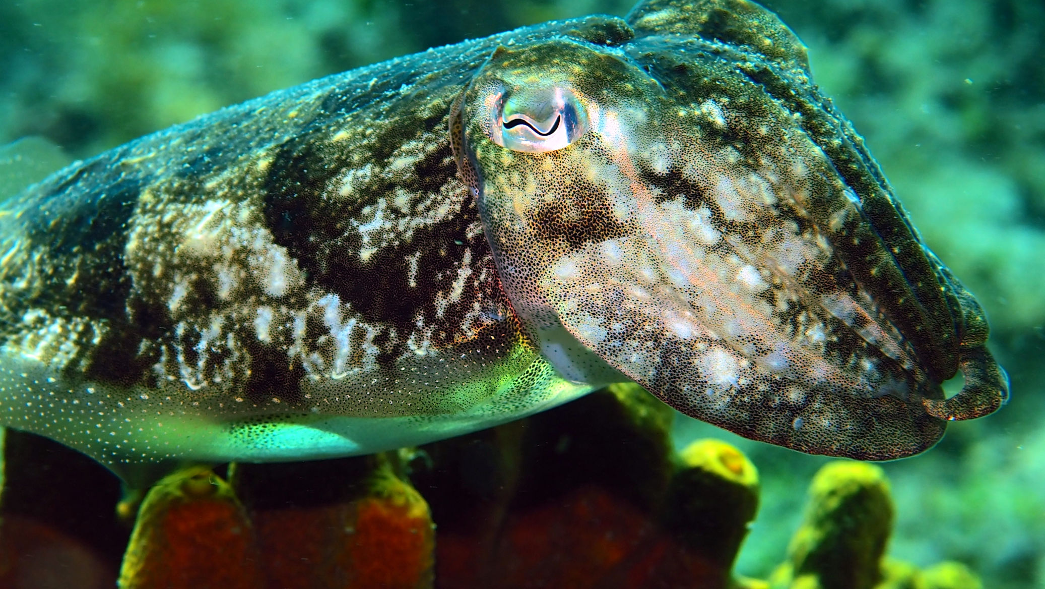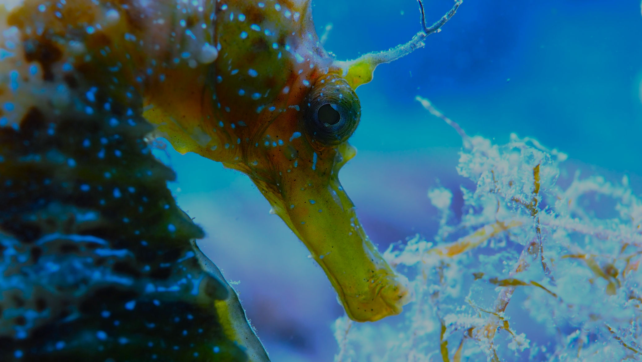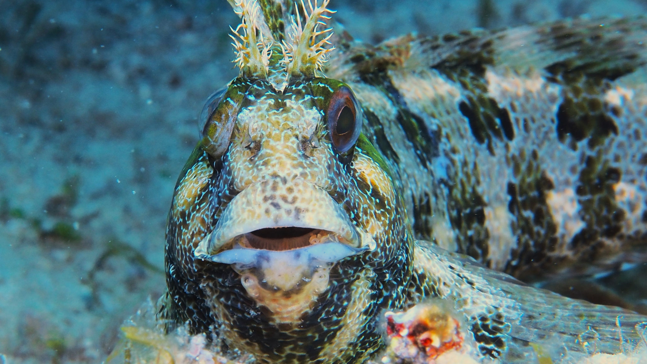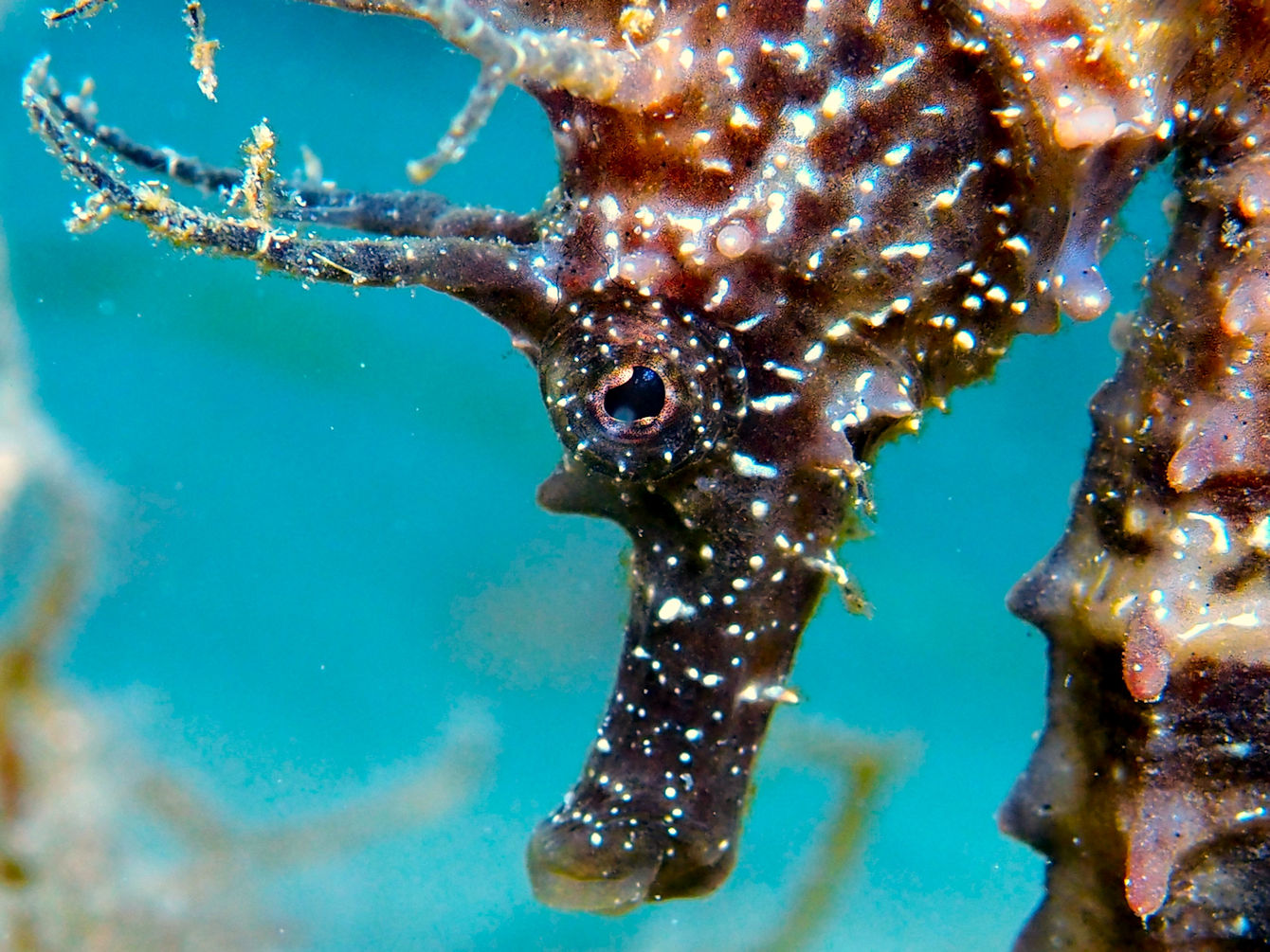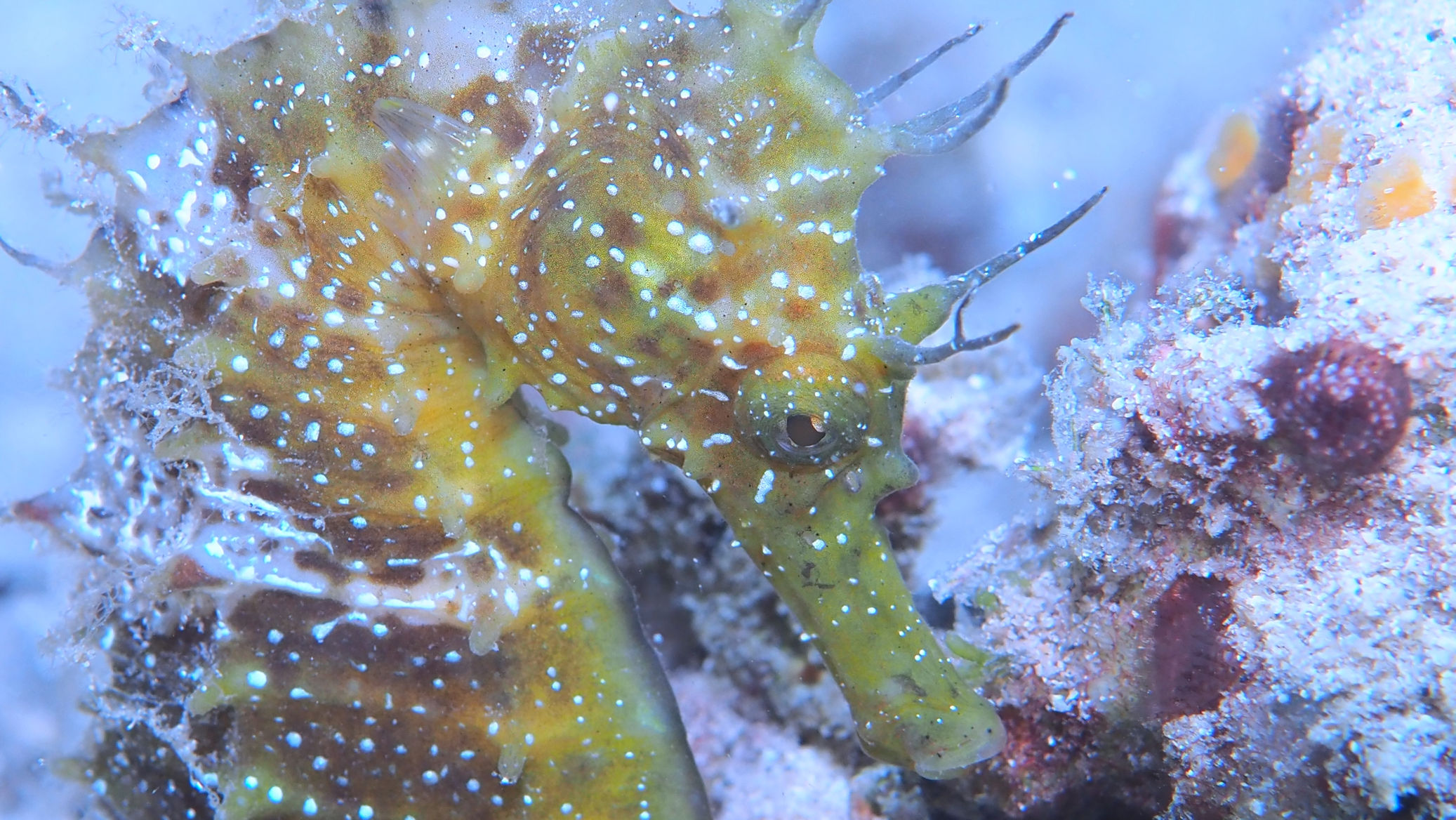 Heute morgen ist es auf jeden Fall kurz von oben trocken. Die Welle steht recht ungünstig auf der Bucht, was den heutigen Tauchspaß verkürzt. Die Sicht ist noch schlechter als gestern. Zwar sehen wir 2 der vielen Buchtpferde, aber so richtig Laune macht der Tauchgang nicht.
