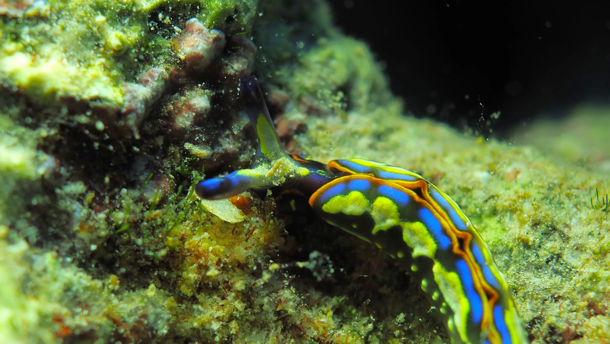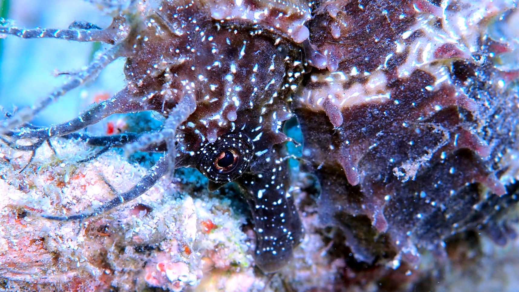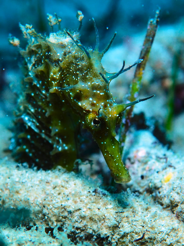 Entsprechend spät frühstücken wir auch und gehen tauchen. Der Himmel ist schon recht bewölkt und unter Wasser macht sich die Ankunft des angesagten schlechten Wetters bereits durch leichte Dünung und mäßige Sicht bemerkbar. Aber wir sehen die üblichen Tiere und man soll es kaum glauben: kein Seepferd heute!