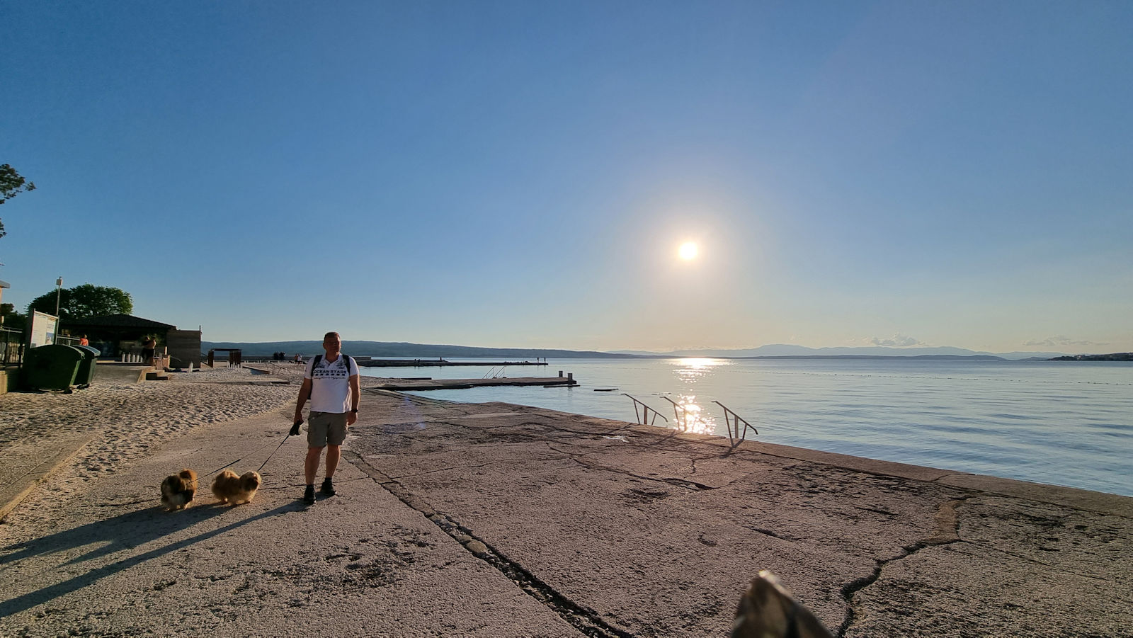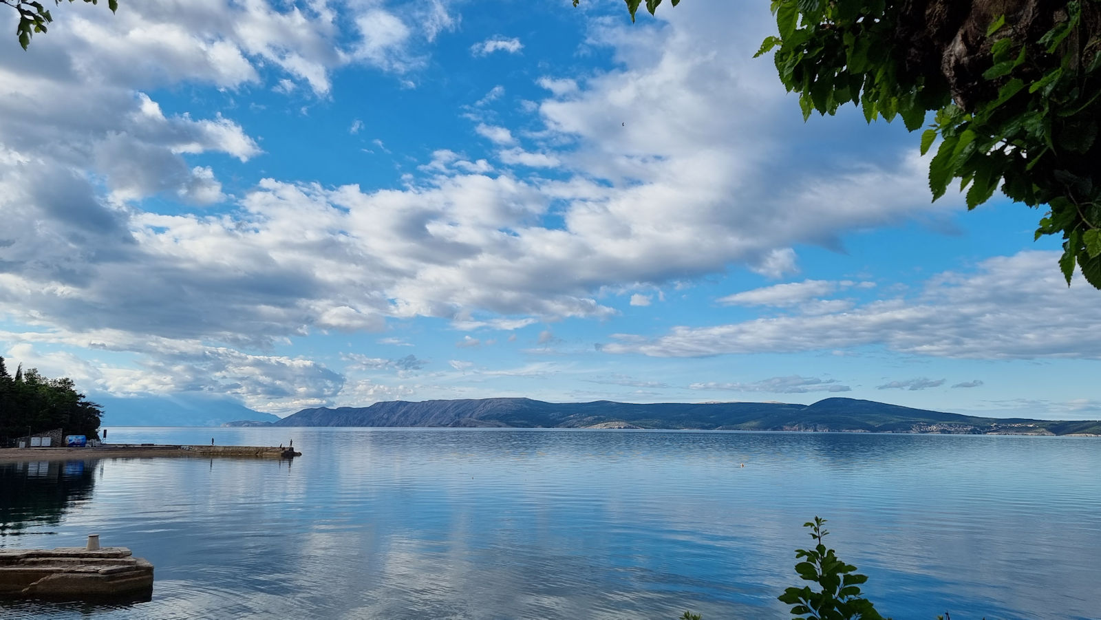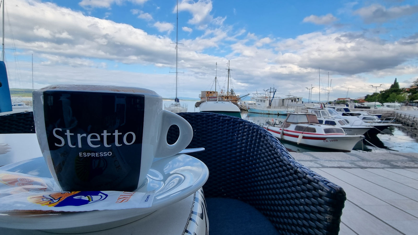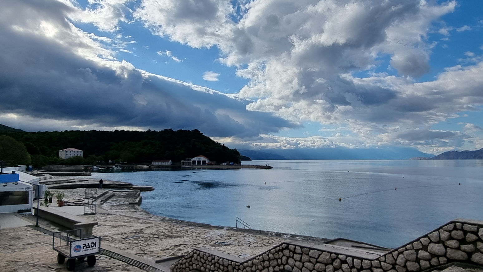 Gegen 8 Uhr erwachen wir. Es ist bewölkt, das Meer gleicht einem See und es ist deutlich wärmer als gestern. Weil wir kein Brot aufgetaut haben, laufen wir ins naheliegende Zentrum von Selce und genießen neben den faszinierenden Wolkenstimmungen über dem Meer einen Cappucino in einer der Bars direkt am Lungomare . Ein Frühstücksstückchen dazu erstehen wir beim Bäcker um die Ecke. Es macht Spaß, dem Leben am Wasser zuzusehen.