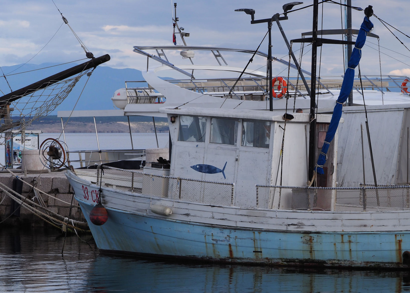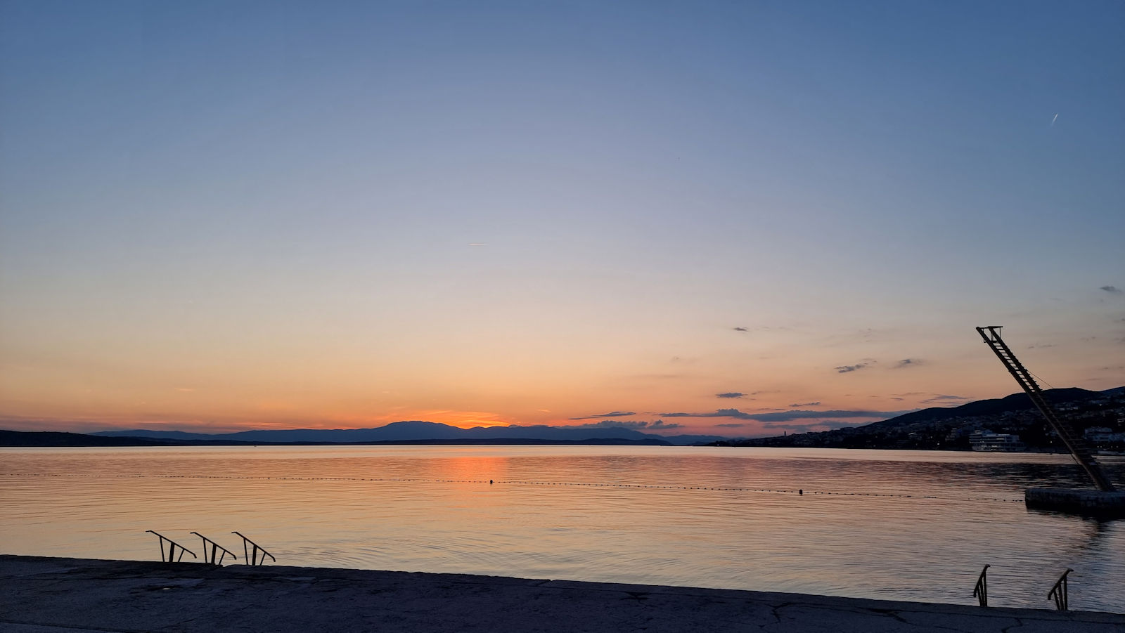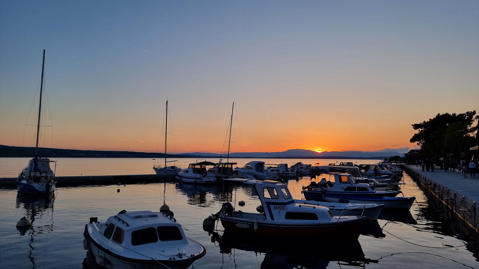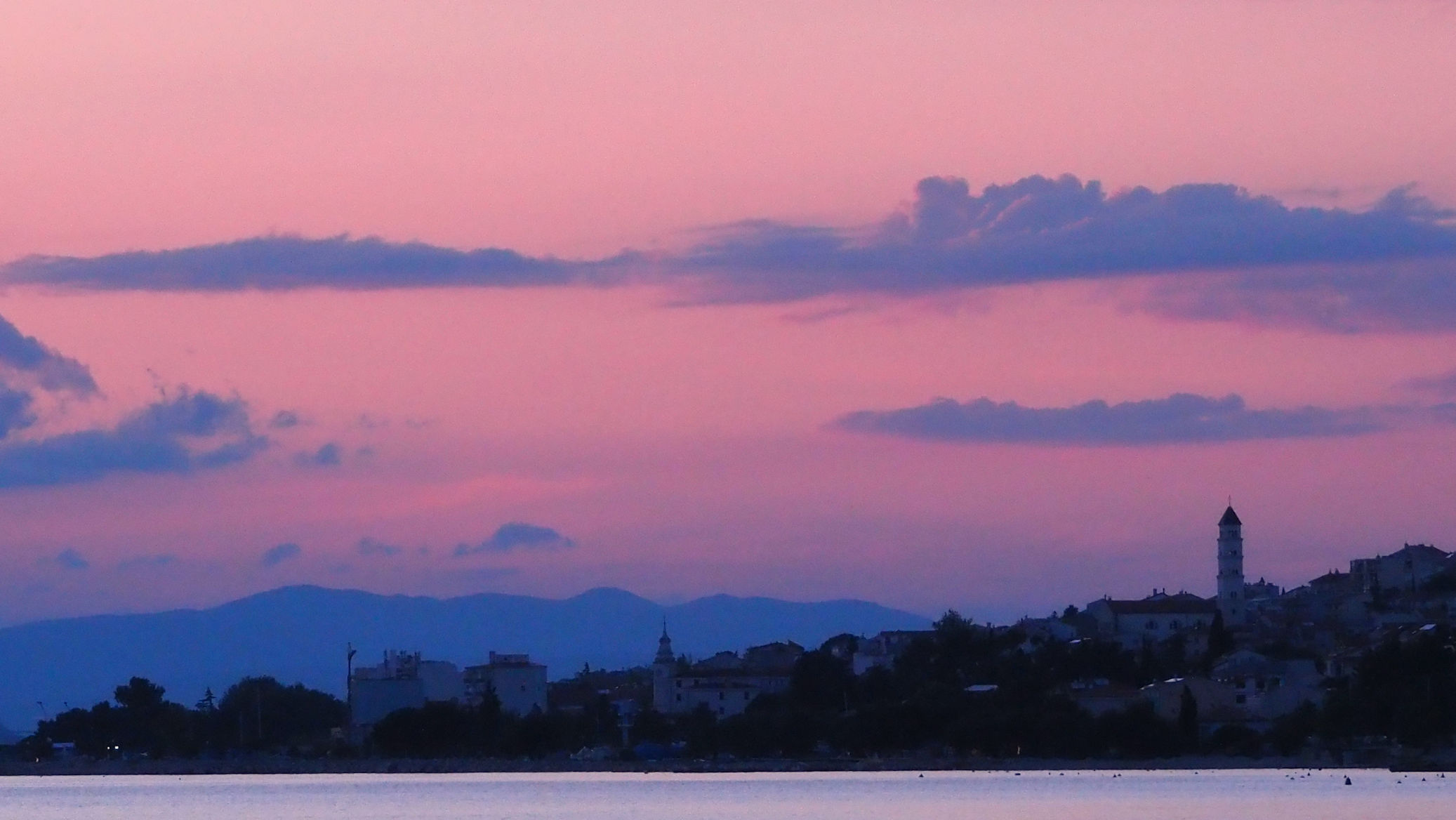 Gegen 8 Uhr erwachen wir. Es ist bewölkt, das Meer gleicht einem See und es ist deutlich wärmer als gestern. Weil wir kein Brot aufgetaut haben, laufen wir ins naheliegende Zentrum von Selce und genießen neben den faszinierenden Wolkenstimmungen über dem Meer einen Cappucino in einer der Bars direkt am Lungomare . Ein Frühstücksstückchen dazu erstehen wir beim Bäcker um die Ecke. Es macht Spaß, dem Leben am Wasser zuzusehen.