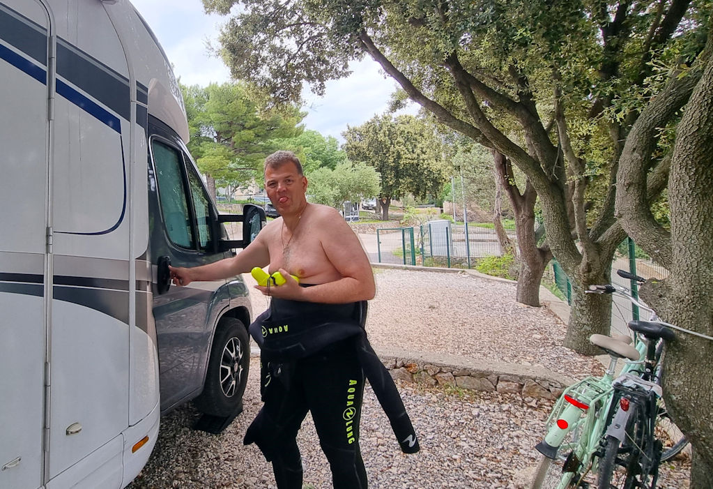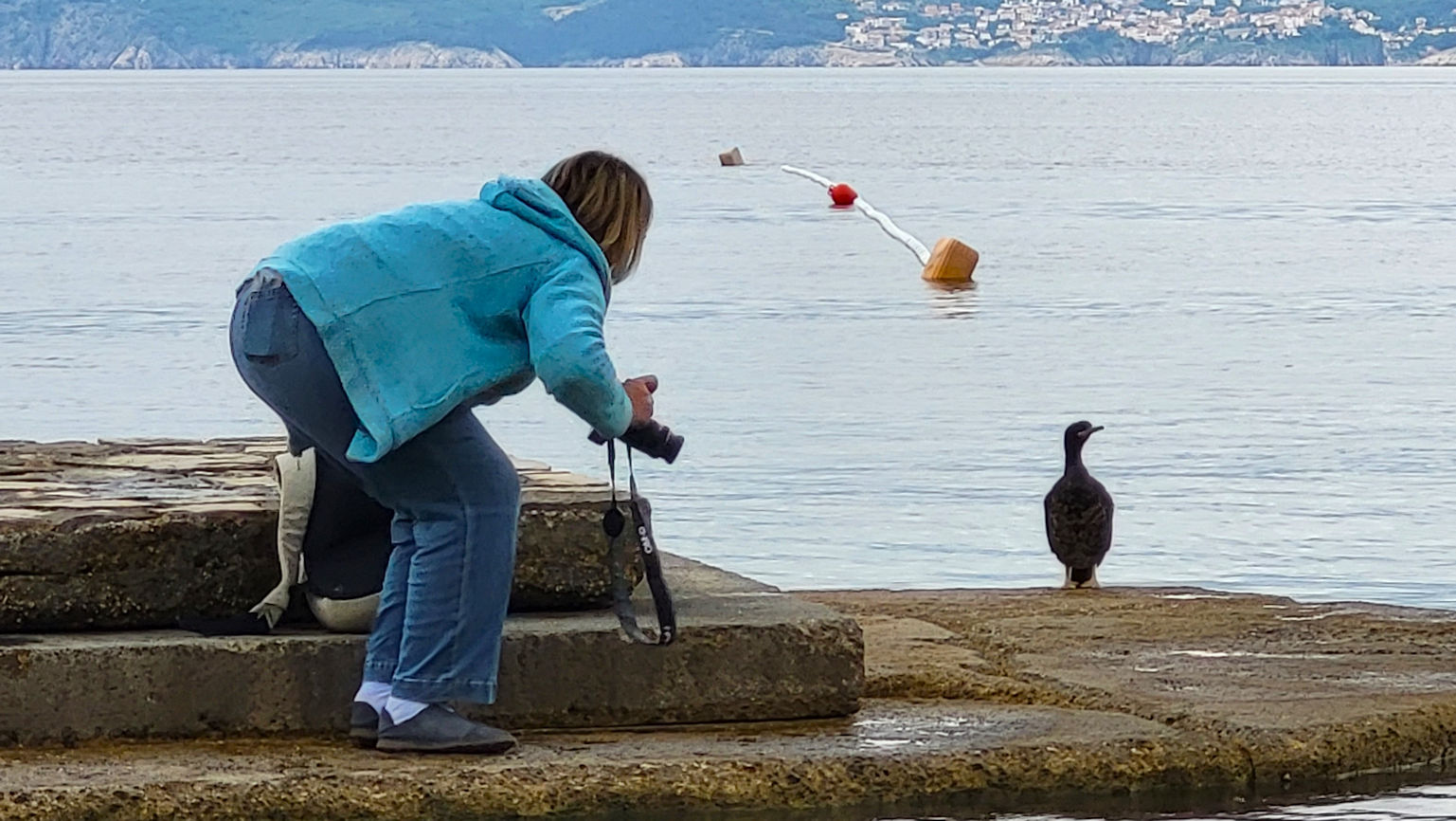 Schnell haben wir eine warme Dusche hinter uns gebracht, Ulli kocht mitgebrachte „Radiatori“ aus dem Spessart in Gorgonzolasauce und dazu gemischten Salat. Die Regentropfen hören fast nicht mehr auf, auf’s Womodach zu trommeln. Man wird faul, sichtet Bilder und hofft, dass es endlich mit dem Regen aufhört. Und das tut es gegen 5…also Zeit zur Dva Galeba Bar zu gehen und ein Bier zu trinken. Aber auf dem Weg dahin wird Ulli erneut aufgehalten. Dieses Mal von einem Kormoran, der Ulli schließlich bis auf gut 1 Meter an sich ran lässt. Auge in Auge, so wie heute Morgen entstehen erneut magische Bilder. Zwei derart faszinierende Begegnungen an einem einzigen Tag…