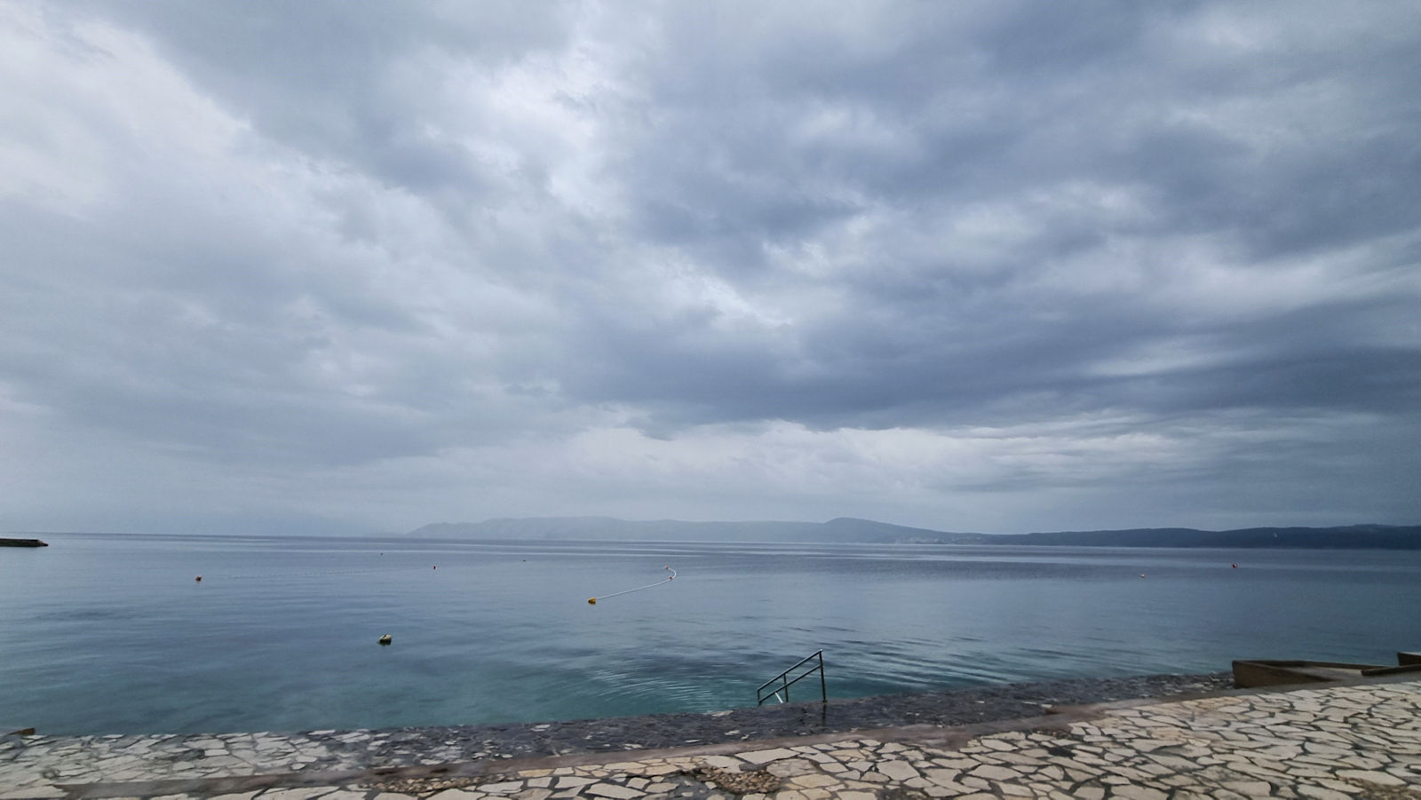 Unseren gestern aus der Stadt mitgebrachten Kirschstrudel teilen wir bei einem Frühstücksbialetti auf dem Steg. Das Meer ist so glatt wie es nur geht und am Himmel hat es eigentlich nur dunkle Wolken.
