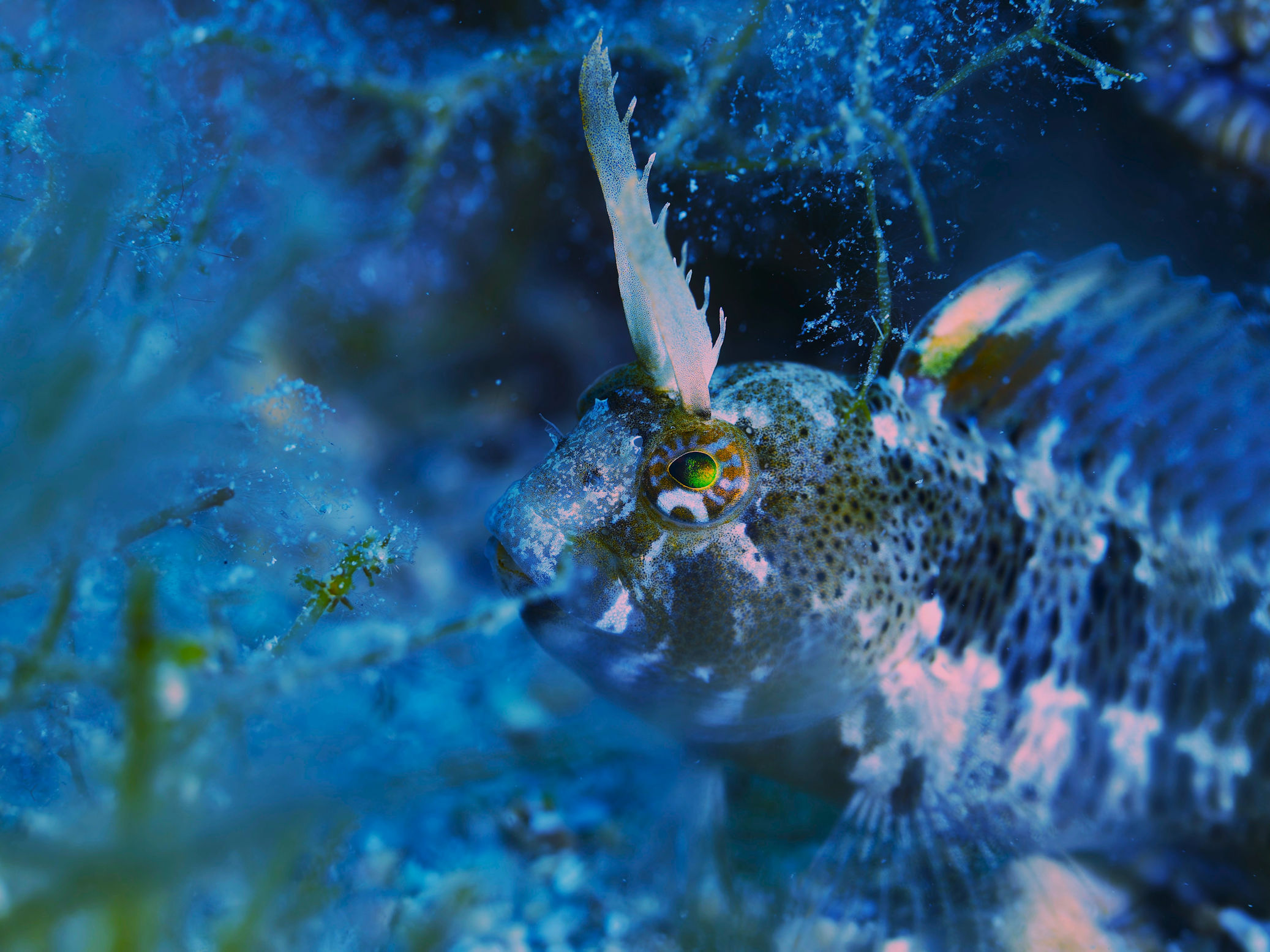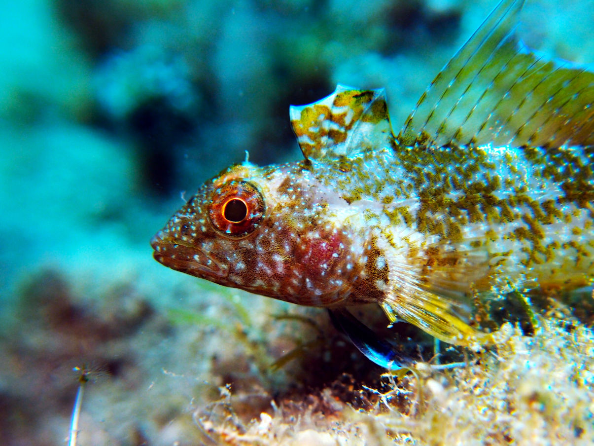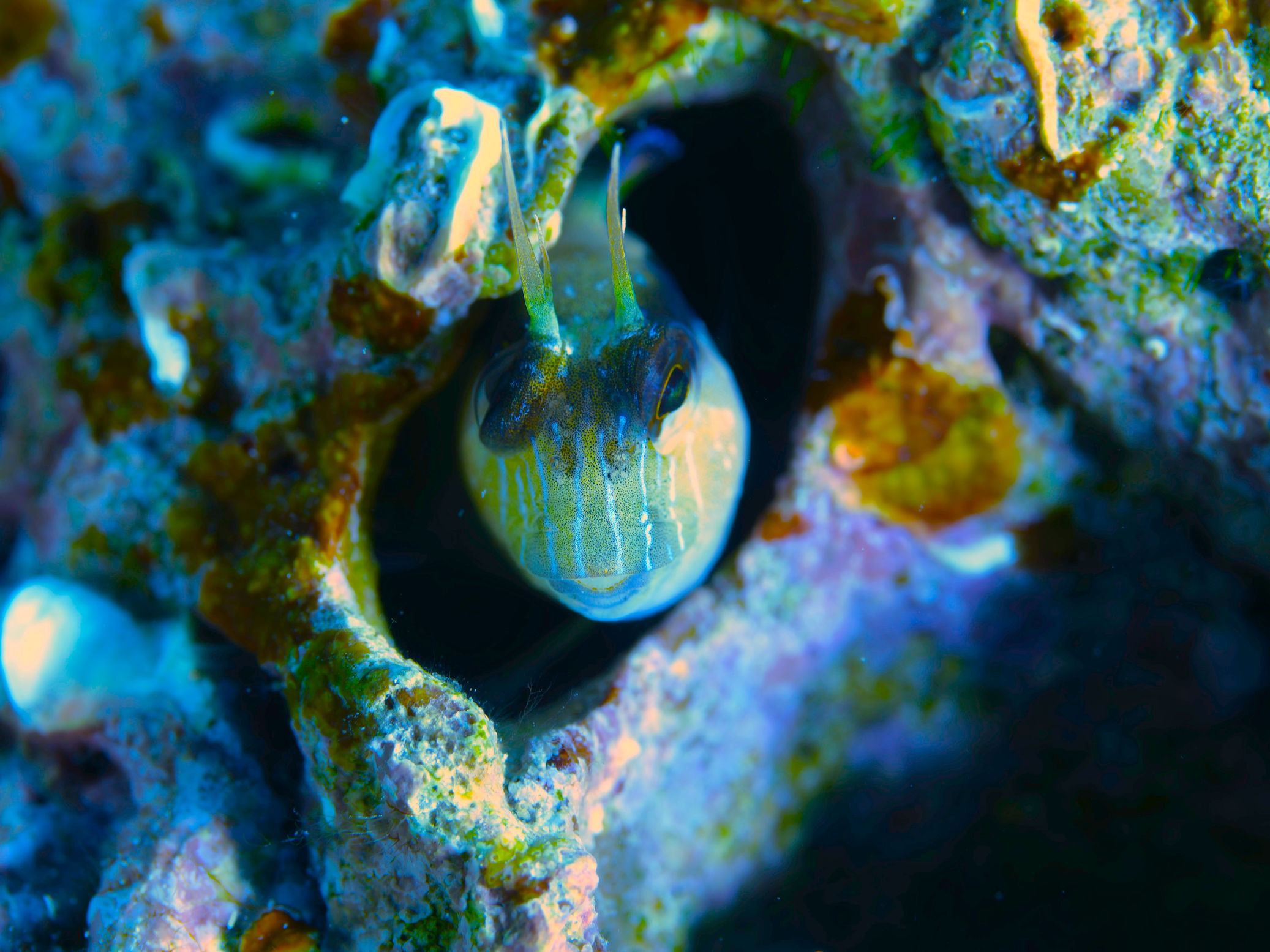 Nun zum Tauchen – es ist schließlich unser letzter Tauchtag auf dieser Reise. Das Meer ist sehr bewegt. Es herrscht starke Dünung im Bereich vor der Basis. Laut Aussagen der anderen Taucher, die am Morgen im Wasser waren, ist die Dünung, die Wellenbewegung des Wasser, bis in eine Tiefe von 10 Metern deutlich spürbar. Daher entscheiden wir uns für einen Tauchgang hinter dem kleinen Hafen an der Hafenmole entlang. Nicht ganz so spannend, aber trotzdem nett und vor allem ruhiger unter Wasser. Und wieder entstehen ein paar wunderschöne Aufnahmen. Als wir aus dem Wasser zurückkommen, empfängt uns einer der Tauchguides mit Tee und Schoki und unser Equipment müssen wir auch nicht zurücktragen. Denn ein Transportwagen der Basis steht bereit.