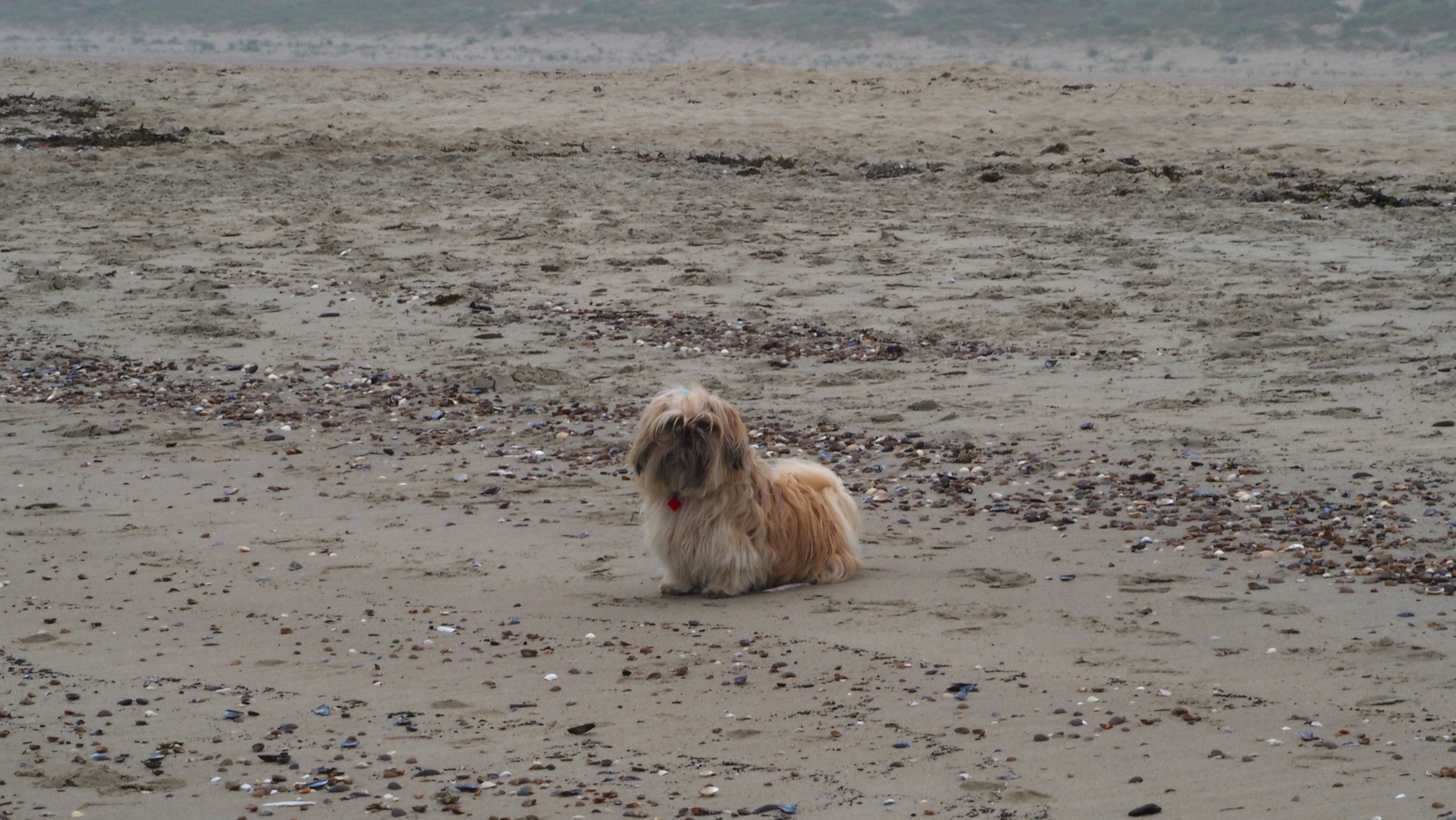 Gegen 13 Uhr, mittlerweile ist es nicht mehr ganz so neblig, fahren wir auf die Nordseeseite zum Geburtstagsstrandspaziergang. Es sind nur ganz wenige Menschen und Hunde unterwegs und so haben die Fellnasen viel Spaß und vor allem Platz zum Herumtoben. Die gute Laune steckt an. Daher planen wir heute Abend, Peter und Mirjam vom Camping de Zeester einen Überraschungsbesuch auf ein Glas Wein abzustatten.