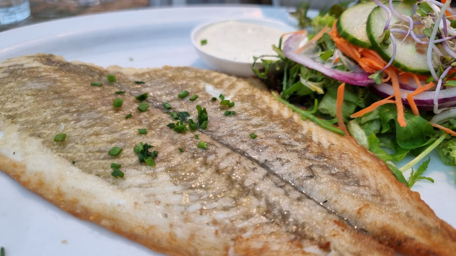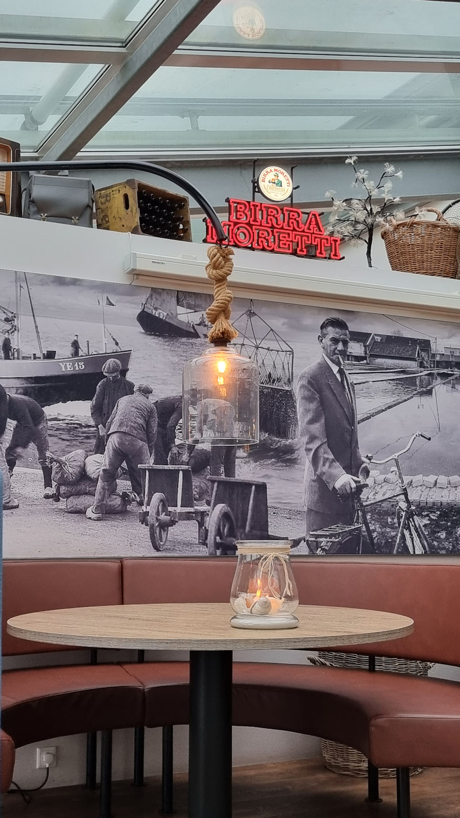 Eine kurze Frage, ob die Fellnasen erlaubt sind und wir sitzen an einem schönen Tisch mit Blick auf die Fischfangflotte.