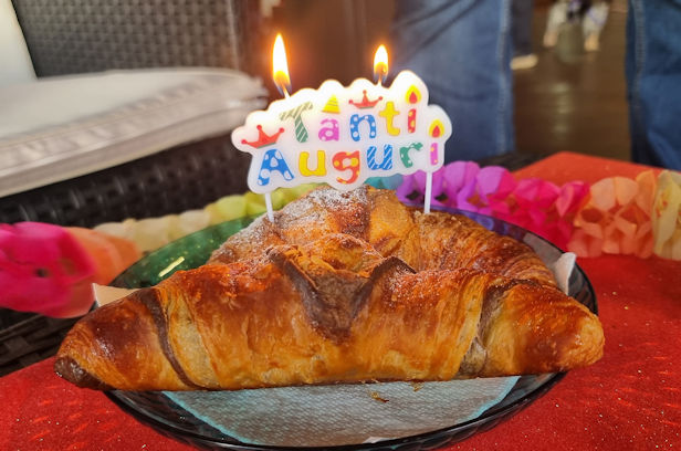 So gehen wir nur kurz in die Bar auf einen Cappuccino und ein Cornetto, heute mal mit Kerzchen, verabschieden uns nochmal von Lollo, der eigentlich Piero heißt, und sind kurze Zeit später auf dem Weg in Richtung Süden. Ob es die Küste von Villasimius wird, wir wissen es nicht. Nächstes Ziel für den heutigen Tag ist die Bar an der Costa Rei, die immer noch keinen Eintrag in GoogleMaps dafür aber mit die besten Cornetti der Insel hat. Hier sitzen wir kurz vor 11 Uhr in der Sonne und genießen unser 2. Frühstück. Vorher passieren wir die allerletzte Abfahrt nach Lanusei unter Lachen – denn nochmal wollen wir da nicht hin, bei diesen Kurven.